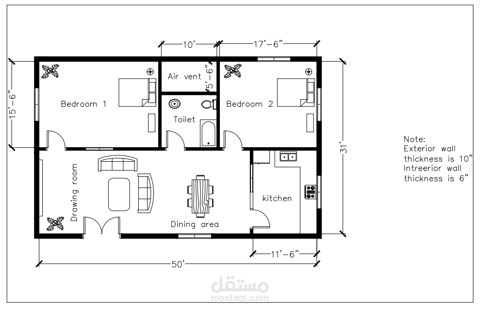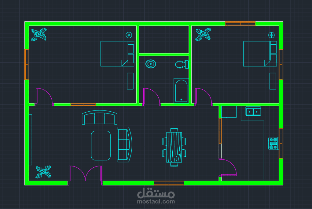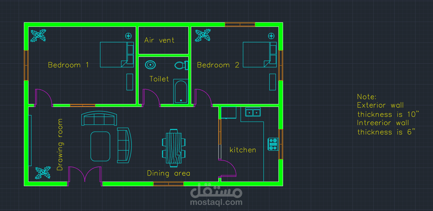 تم تصميم مخطط معماري لأرضية مكونة من غرفتي نوم ومطبخ وتواليت ومكان للجلوس باستخدام برنامج Autocad، بالإضافة إلى مراعاة تنفيذ التصميم باستخدام Layers, Dimensions, Blocks, hatch وإظهارها، وقد تم إخراج التصميم وتجهيزه للطباعة، بمقياس الرسم المطلوب.