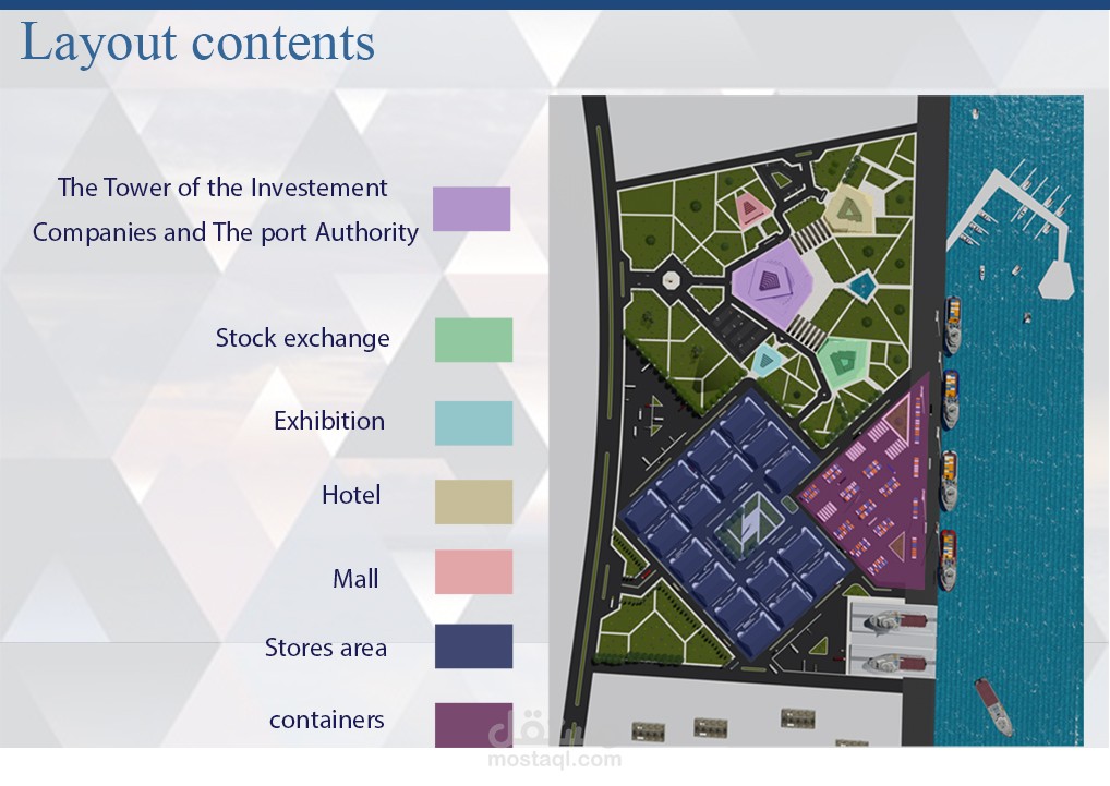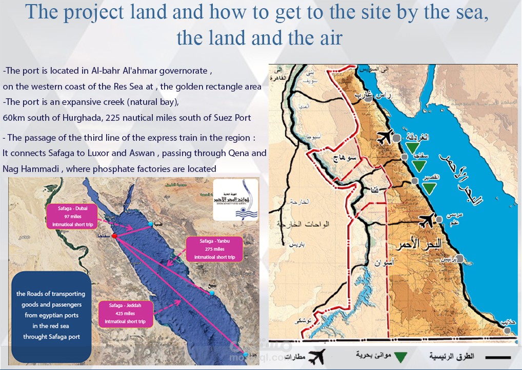 مشروع لوجيستي على ميناء سفاجا حيث مكان ملئ بالمعادن وخاصة الفوسفات ، يتكون المشروع من برج للشركات الاستثمارية وفندق وبورصة ومعرض ومول ، بالاضافة الى منطقة المخازن ومنطقة الحاويات ورصيف استقبال البضائع من على الميناء ومنطقة لاعمال صيانة السفن .