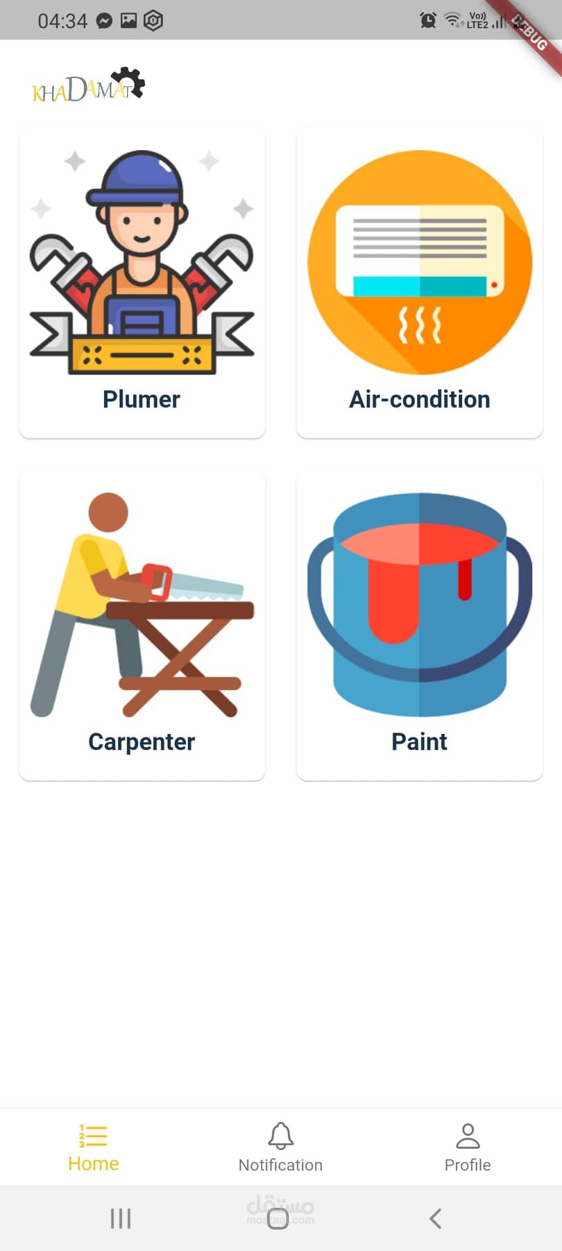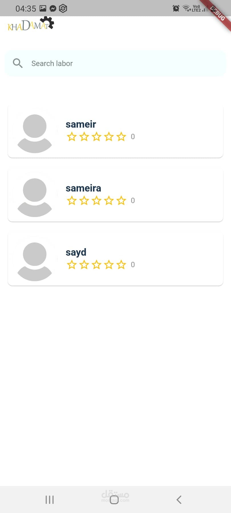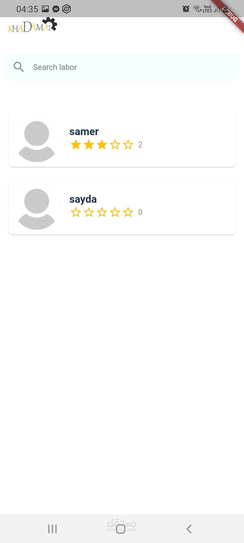 تطلبيق khadamat user هو تطبيق يتيح للمستخدم طلب عمالة لاحتياجة المنزلي تشمل جميع الاغراض فوز دخول العميل يختار القسم المناسب ويختار بعدها العامل تم عمل التطبيق ب flutter و backend ب laravel ولوحة التحكم vue