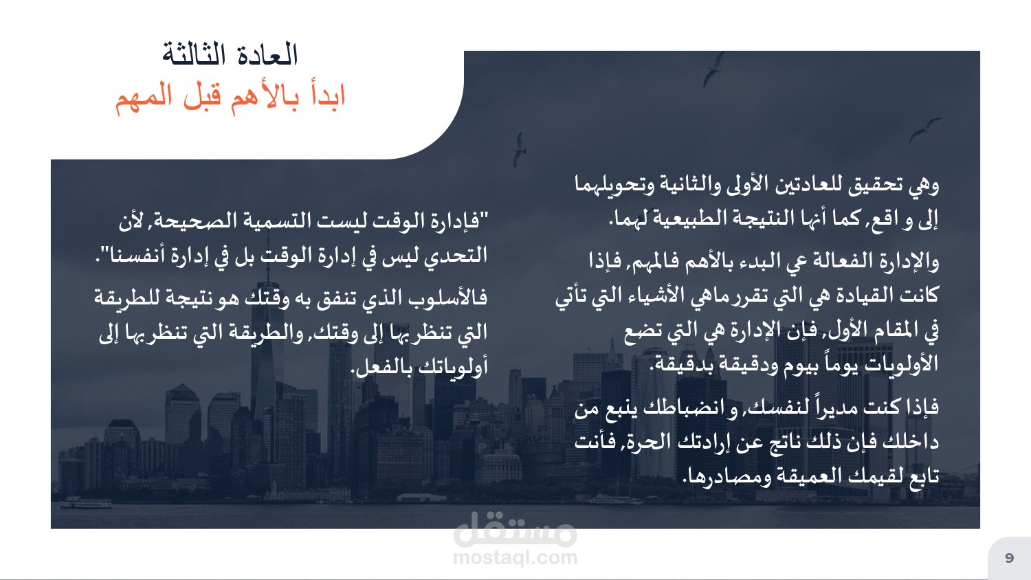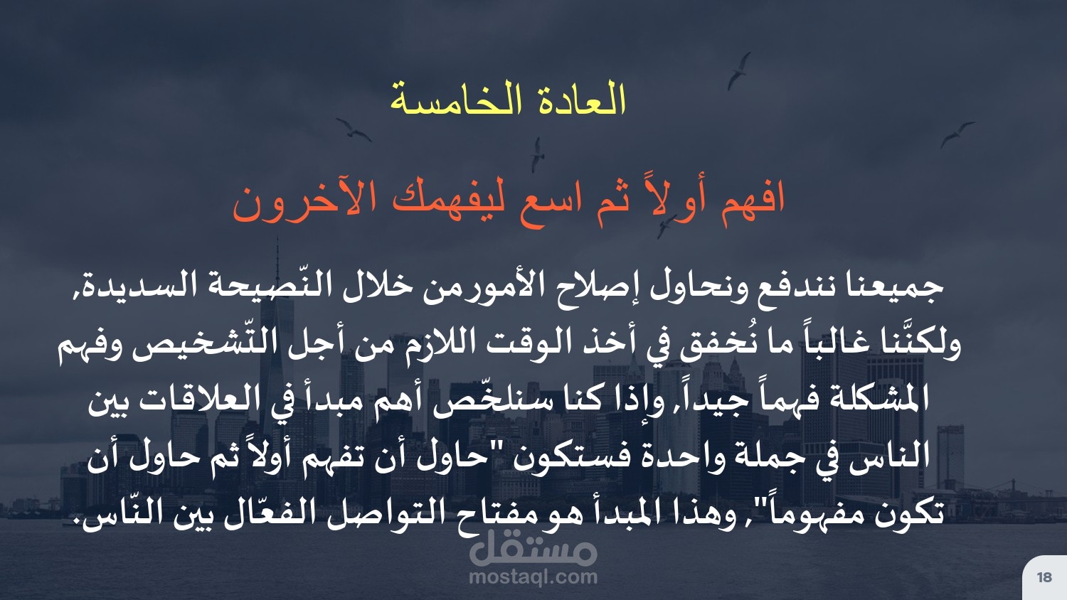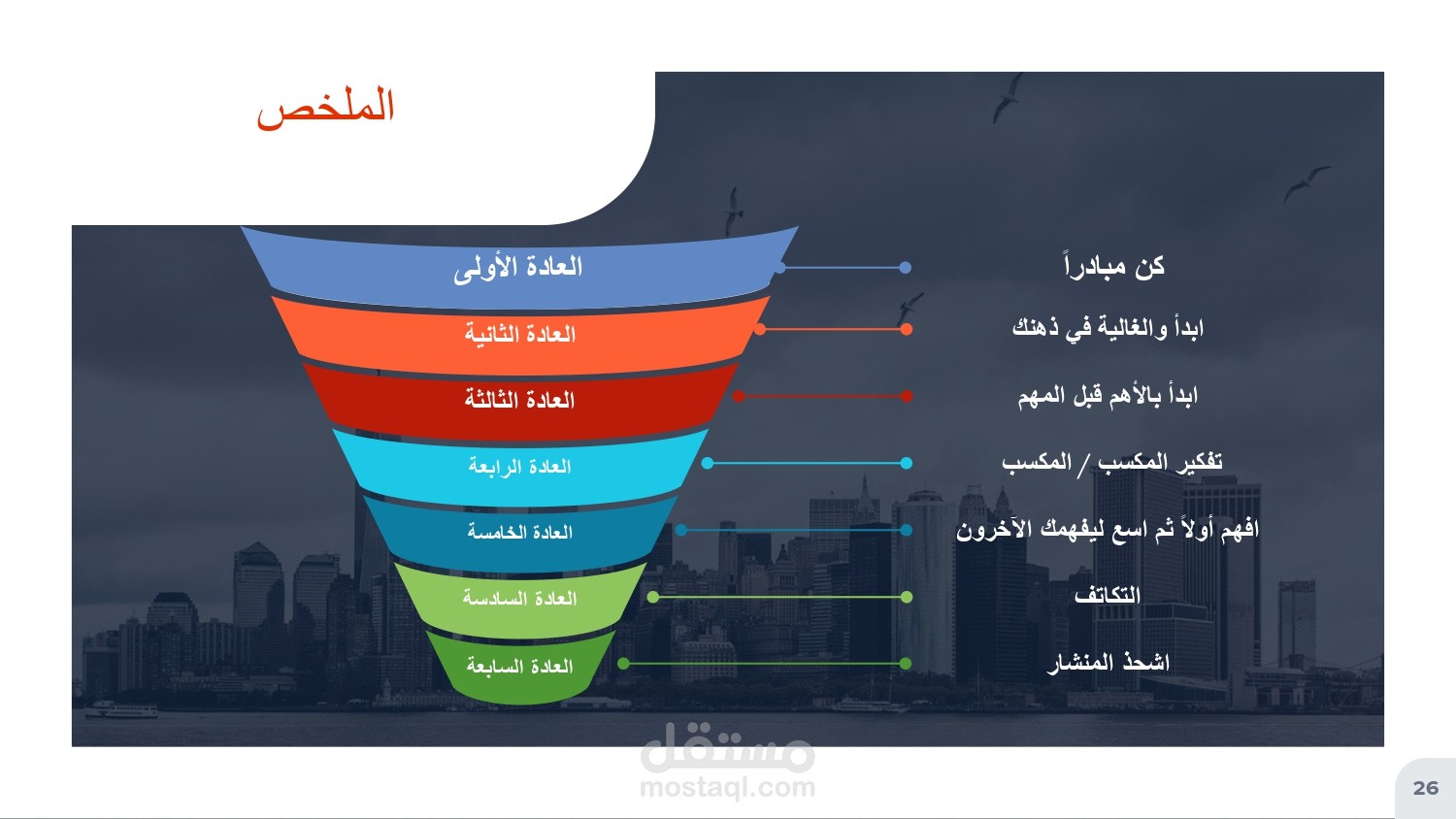 عرض تقديمي لملخص كتاب العادات السبع للناس الأكثر فعالية، عرض مختصر وجذاب يحوي على معلومات قيمة، ينبغي على كل إنسان النظر فيها وتعلم تطبيقها
