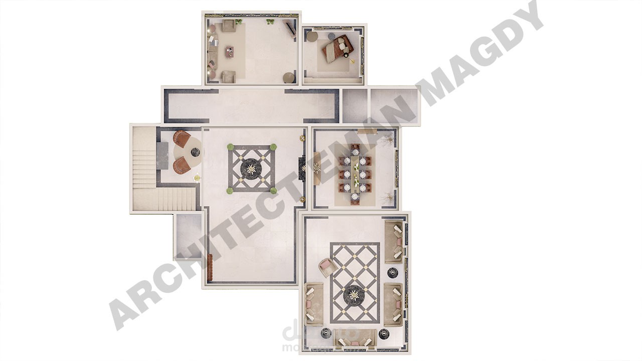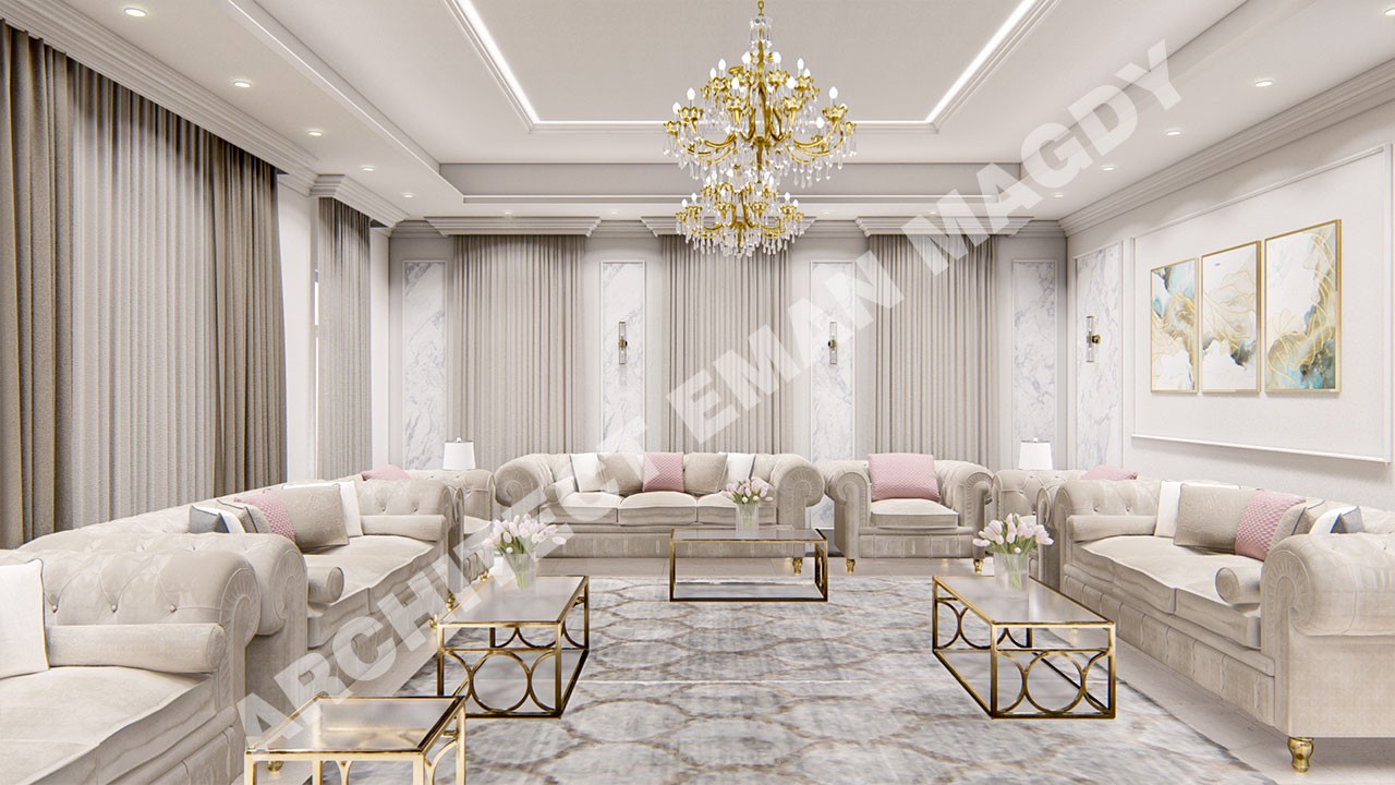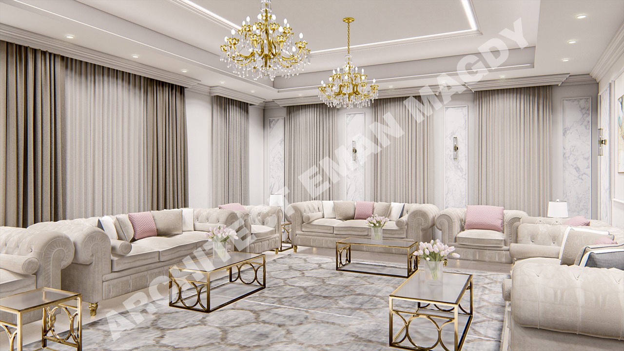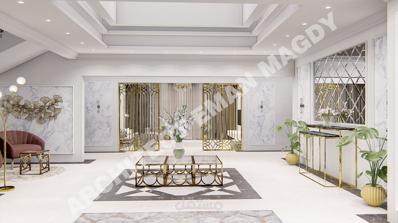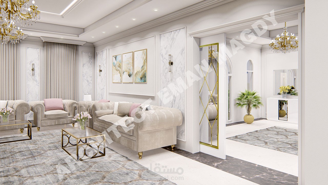 تصميم داخلي لفيلا الجزء الخاص بالمجلس و الطعام و الاستقبال بالمدخل و المعيشة