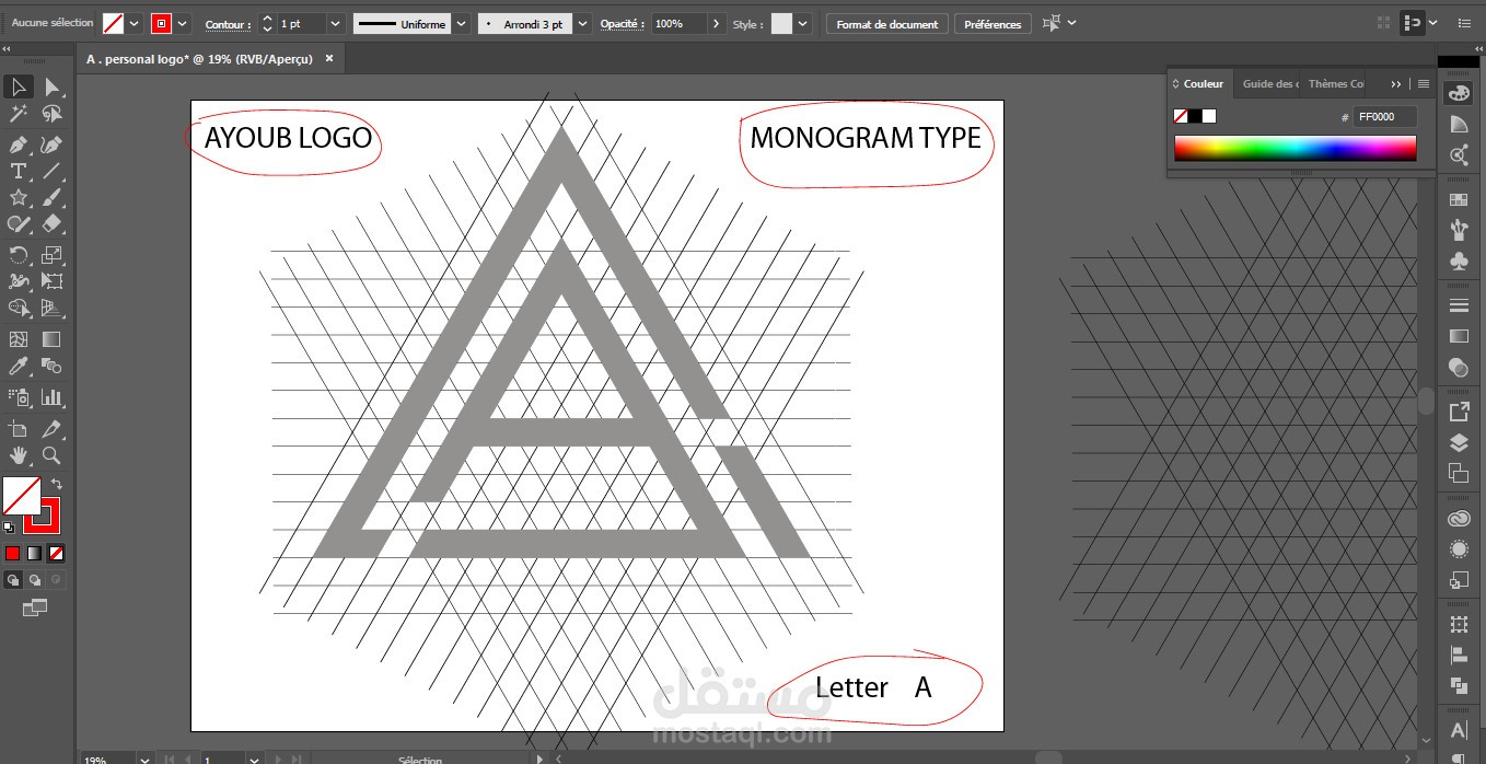 هذا شعار شخصي خاص بإسم " أيوب Ayoub " . حيث تم أخذ أول حرف من الإسم لإستخدامه كرمز "مونوغرام " و ثم الإشتغال عليه بواسطة الرسم على الورق " sketch " من أجل جعله بشكل إحترافي و جذاب و بسيط ، حيث تم الإعتماد على عدة قواعد منها التوازن و التقارب بين أجزاء الشعار و كذالك البساطة و الفعالية ... ، لنصل في الأخير الى هذه النتيجة .