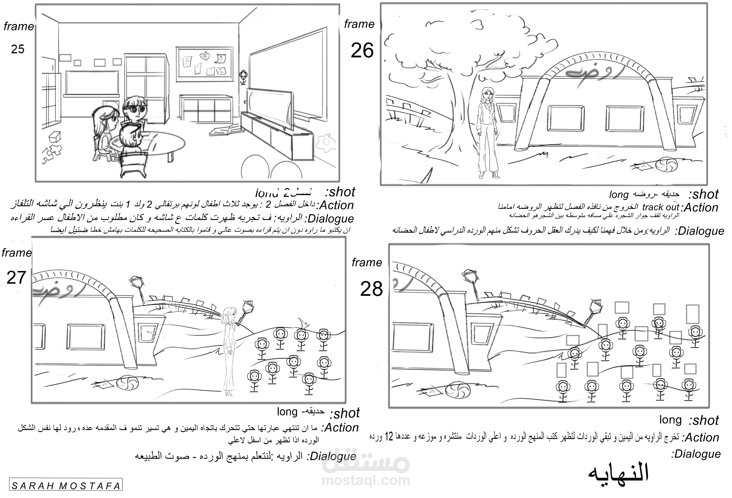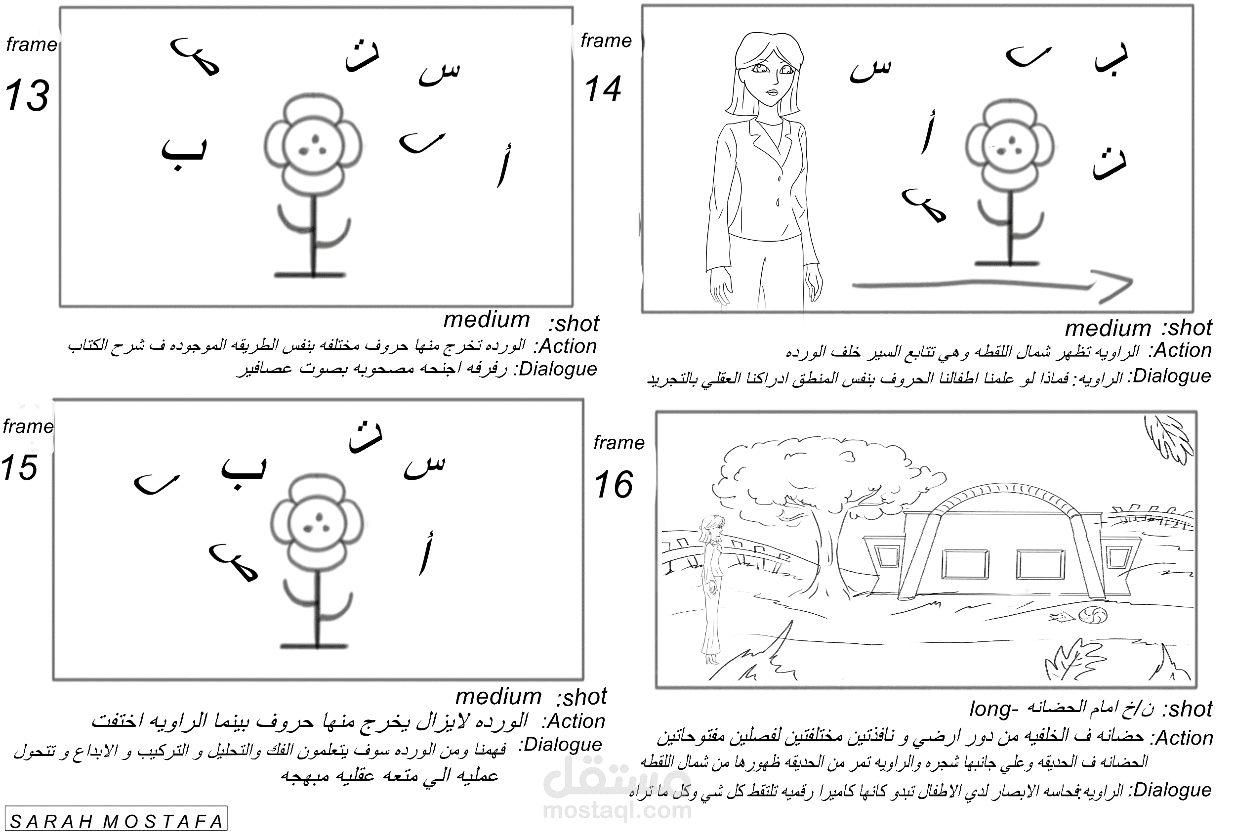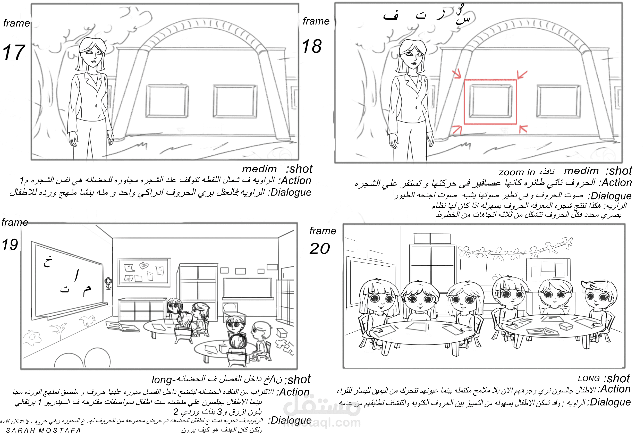لقد قمت بصنع و رسم الكراكتر الشخصيات المعلمه و الاطفال علي حسب رغبه كاتب السيناريو و قمت بتصميم و رسم الخلفيات ثم بعد ذلك قمت بترتيب و رسم المشاهد في الستوري بورد