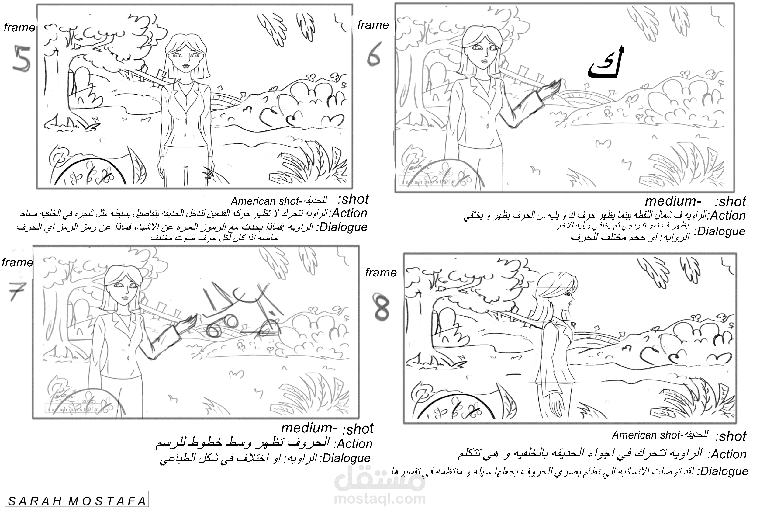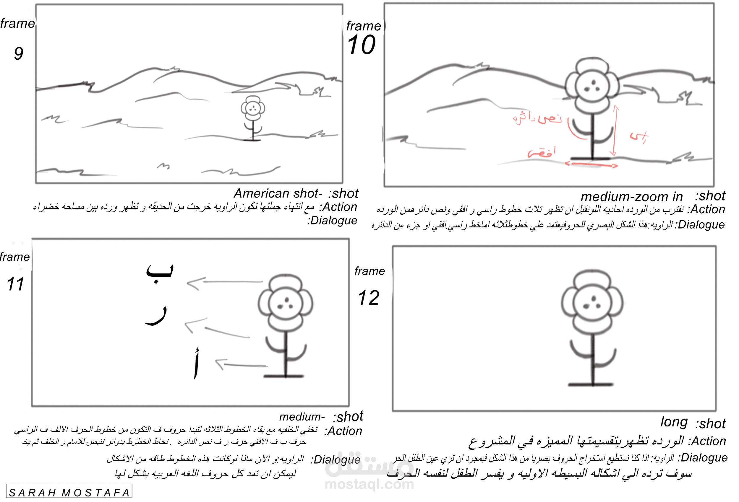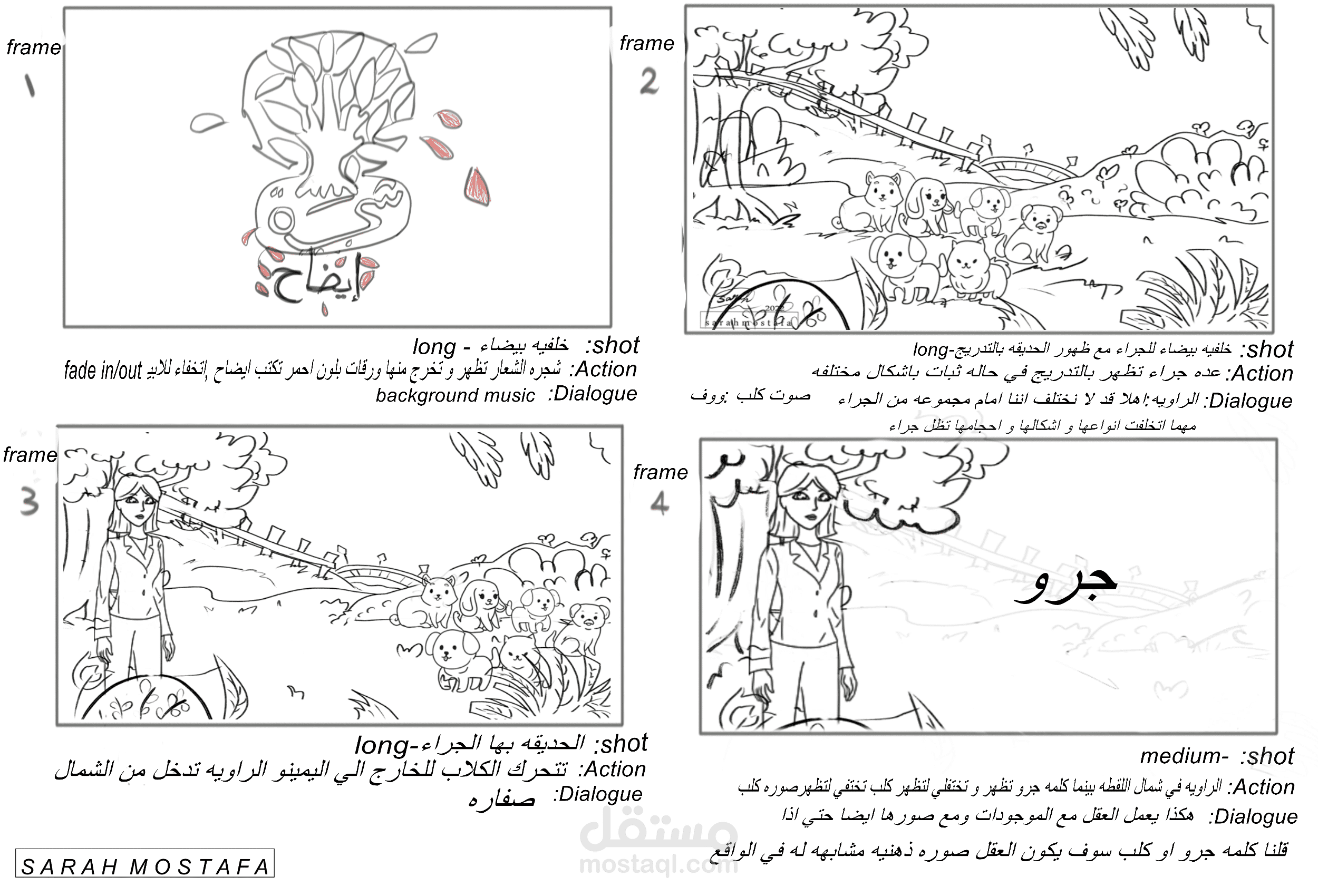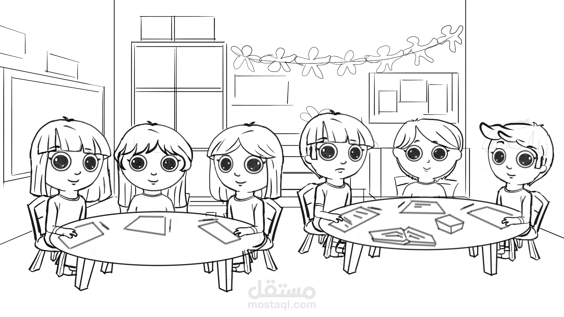 لقد قمت بصنع و رسم الكراكتر الشخصيات المعلمه و الاطفال علي حسب رغبه كاتب السيناريو و قمت بتصميم و رسم الخلفيات ثم بعد ذلك قمت بترتيب و رسم المشاهد في الستوري بورد