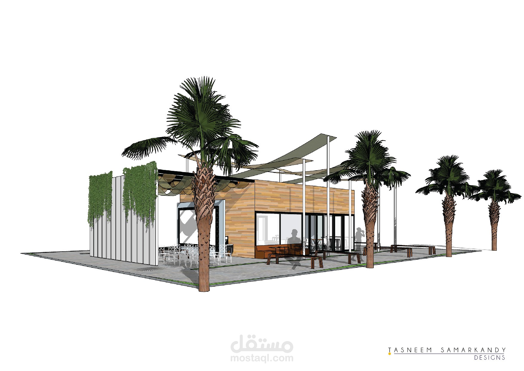 Designing an outdoor pavilion inside a courtyard include a cafe and seating area.