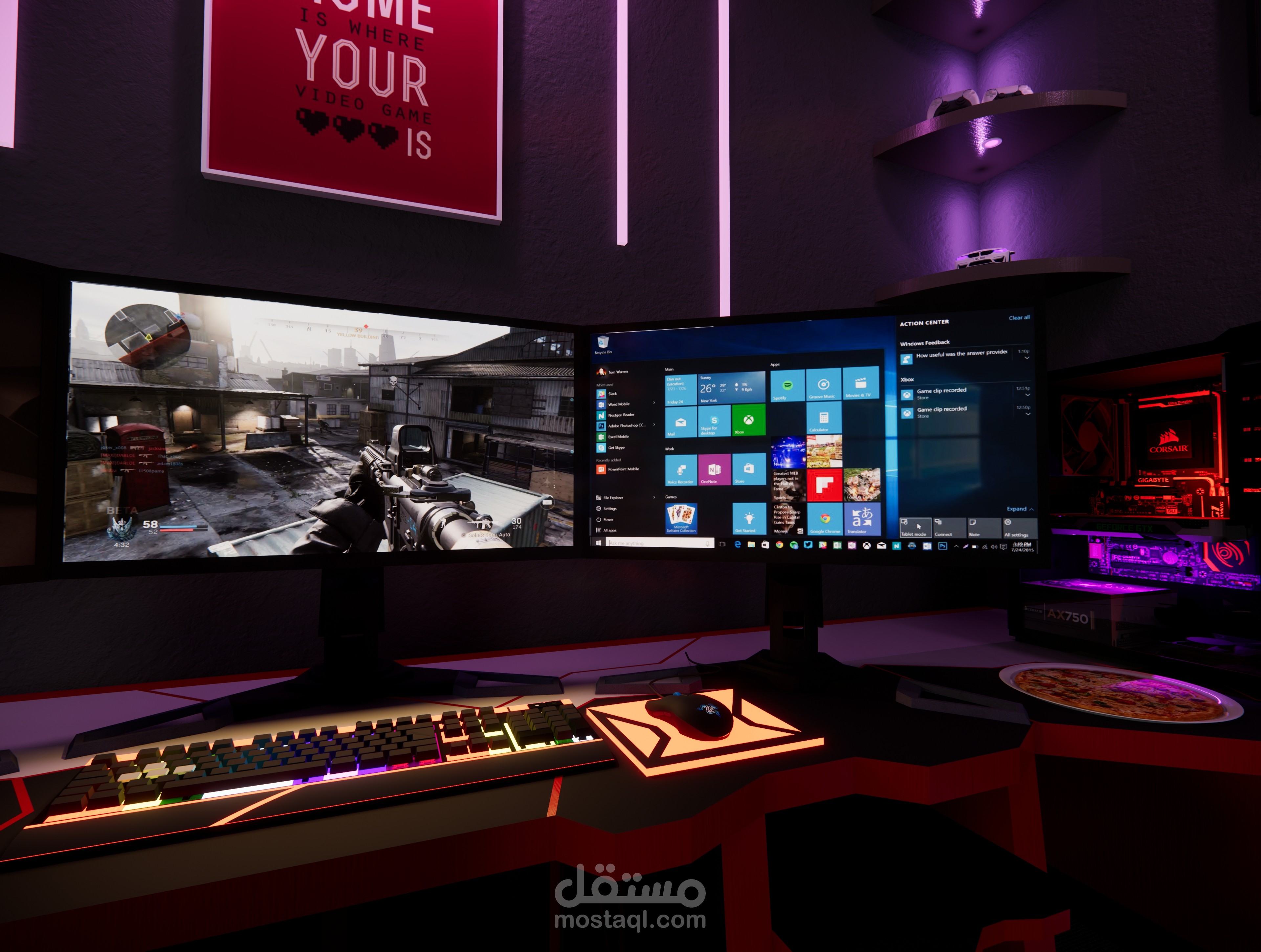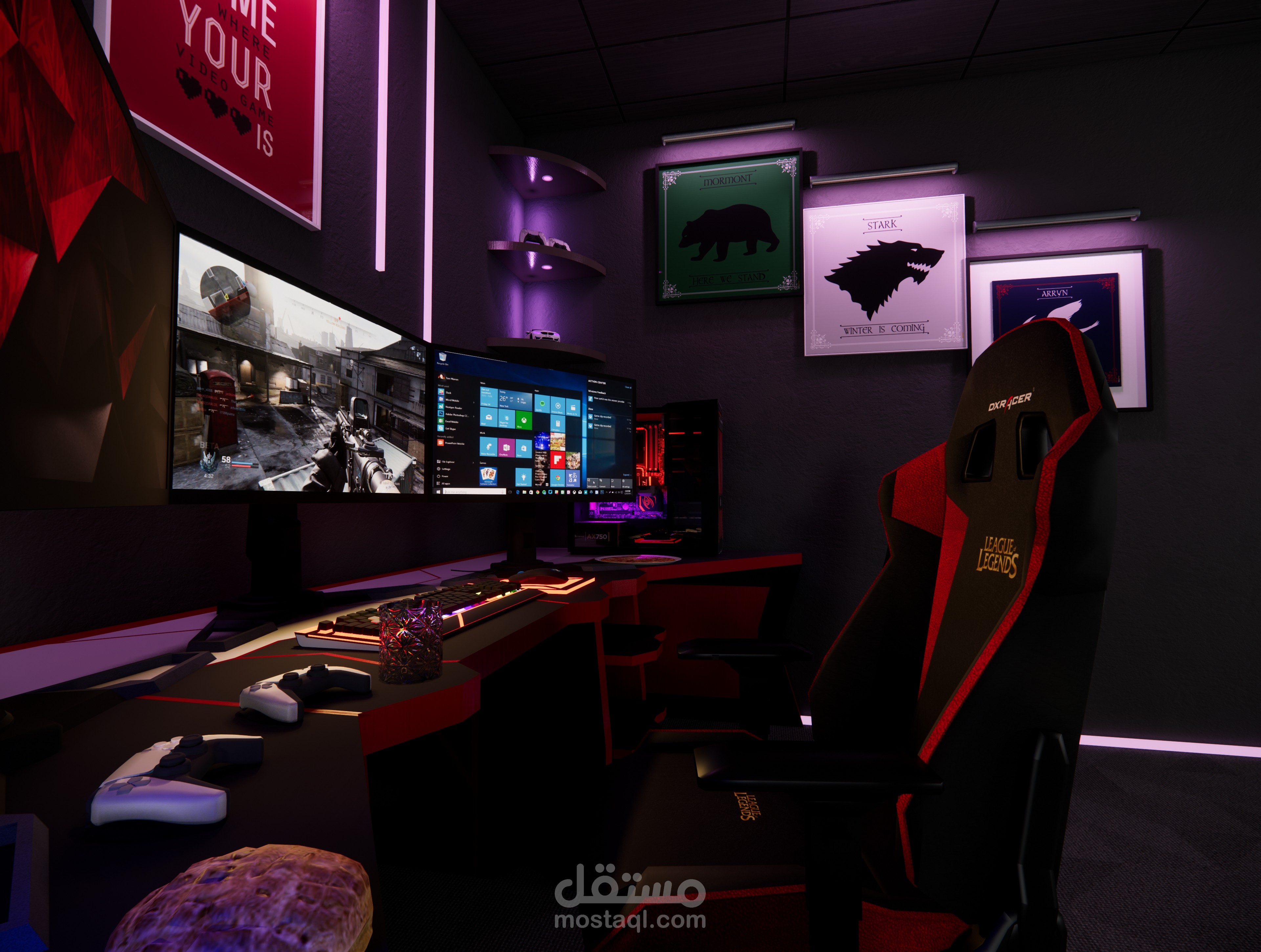 جزء من غرفة طفل بها Gaming Setup مع مراعاة تقليل الاضاءات لتناسب العميل وتخدم الفراغ المصمم.