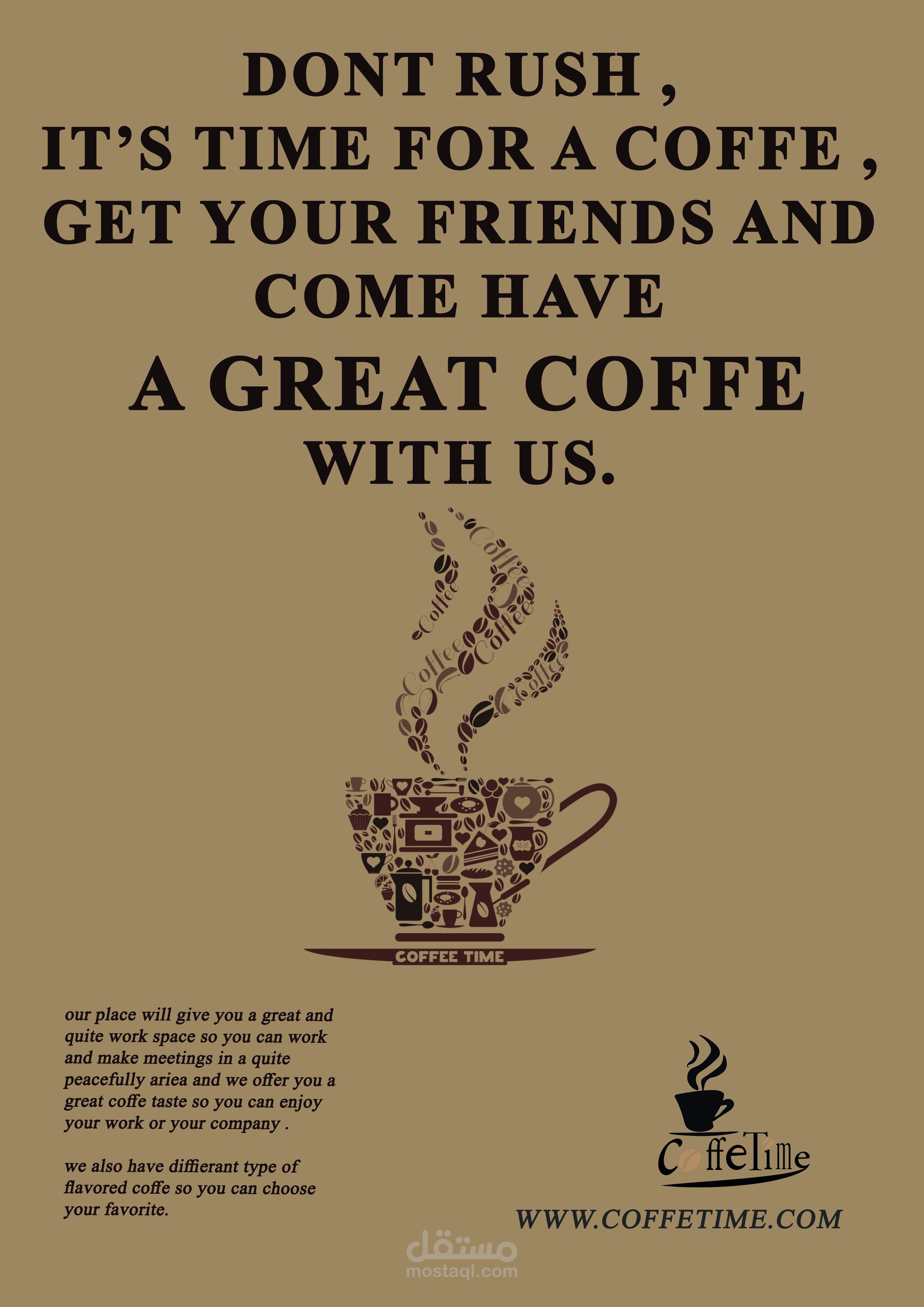 flayer for a coffee shop to attract people to join the coffee shop and had a great time with them and tell them in a very simple way why they should come to our place? what we have special and different than others in the same market. so, I used photoshop and illustrator here and put the logo of the place and the web site so people can easily reach, it's just for training project not in real