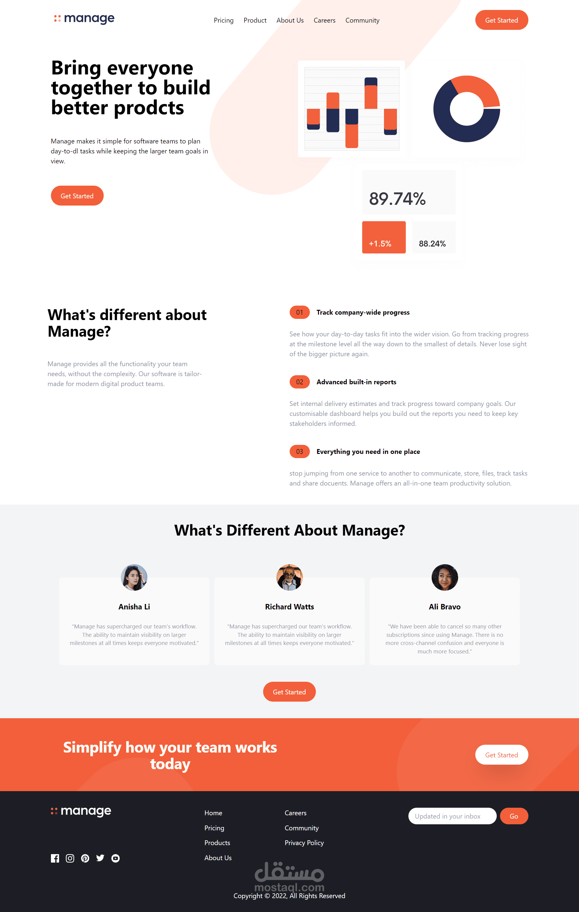 صفحة هبوط خاصة لشركة Manage للتعريف بالشركة وعرض بعض المميزات واراء بعض الزبائن.
