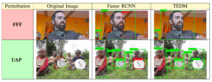 Deep neural network approaches have demonstrated high performance in object recognition (CNN) and detection (Faster-RCNN) tasks, but experiments have shown that such architectures are vulnerable to adversarial attacks (FFF, UAP): low amplitude perturbations, barely perceptible by the human eye, can lead to a drastic reduction in labelling performance. This article proposes a new context module, called Transformer Encoder Detector Module, that can be applied to an object detector to (i) improve the labelling of object instances; and (ii) improve the detector’s robustness to adversarial attacks. The proposed model achieves higher mAP, F1 scores and AUC average score of up to 13% compared to the baseline Faster-CNN