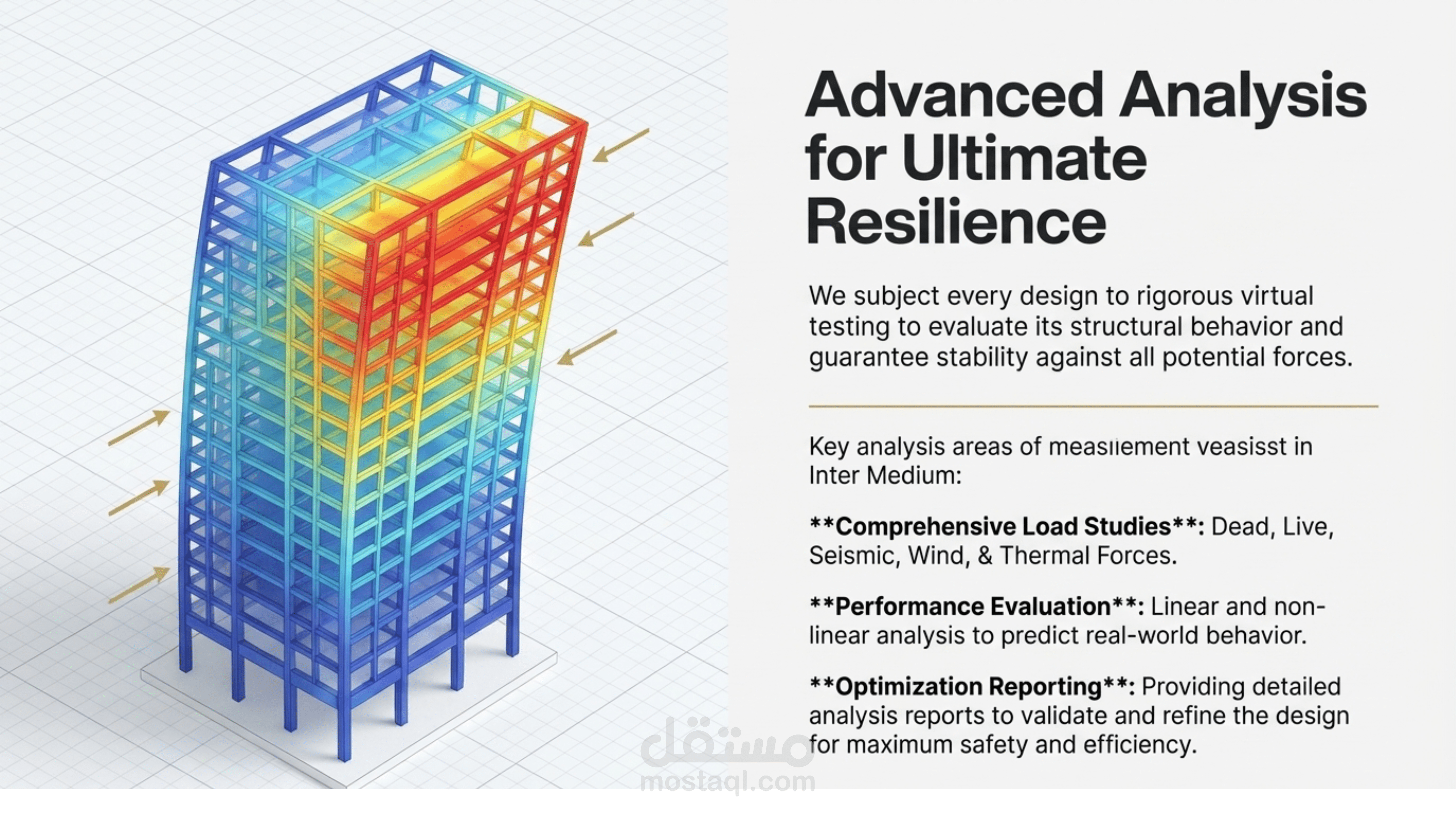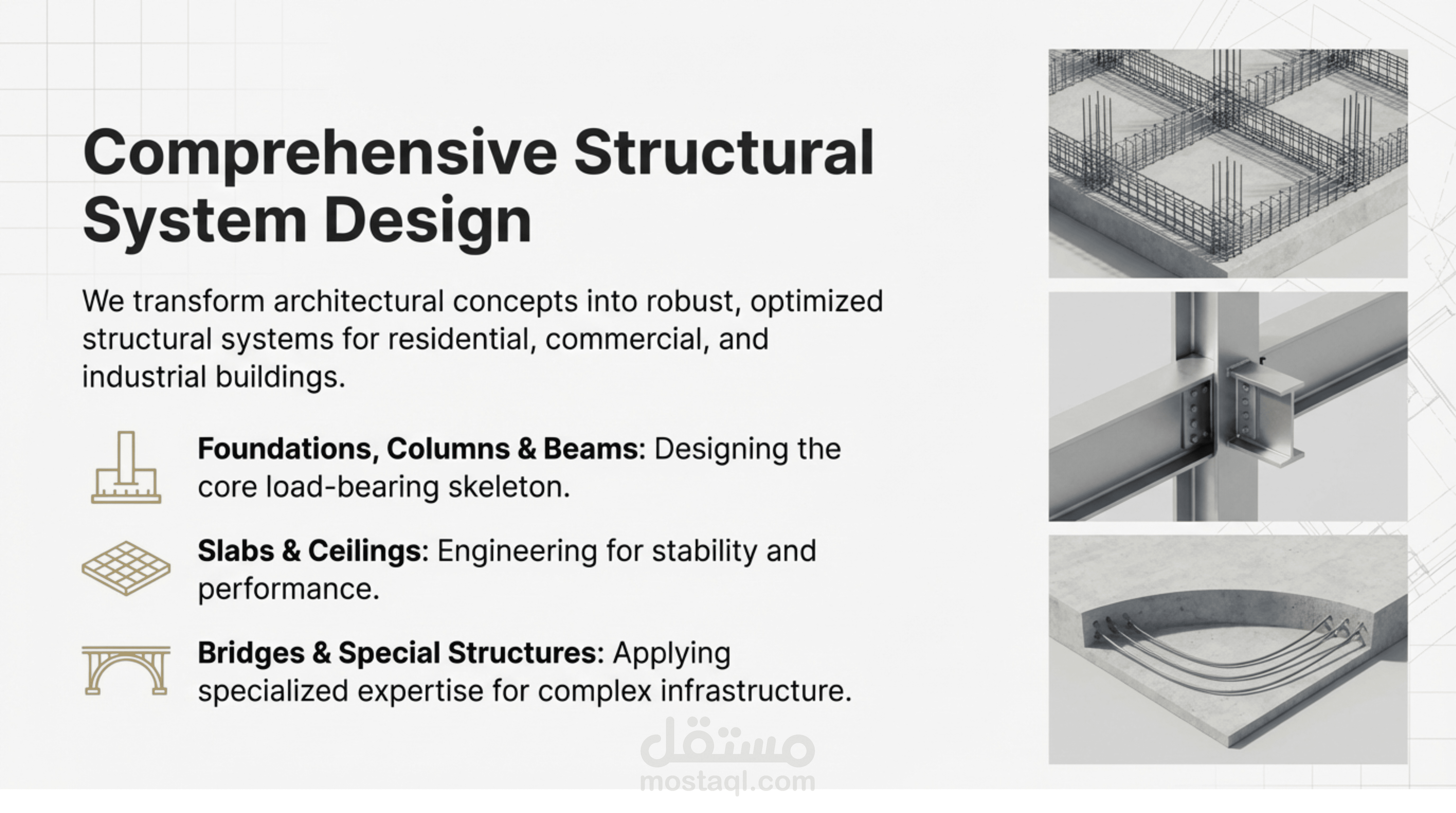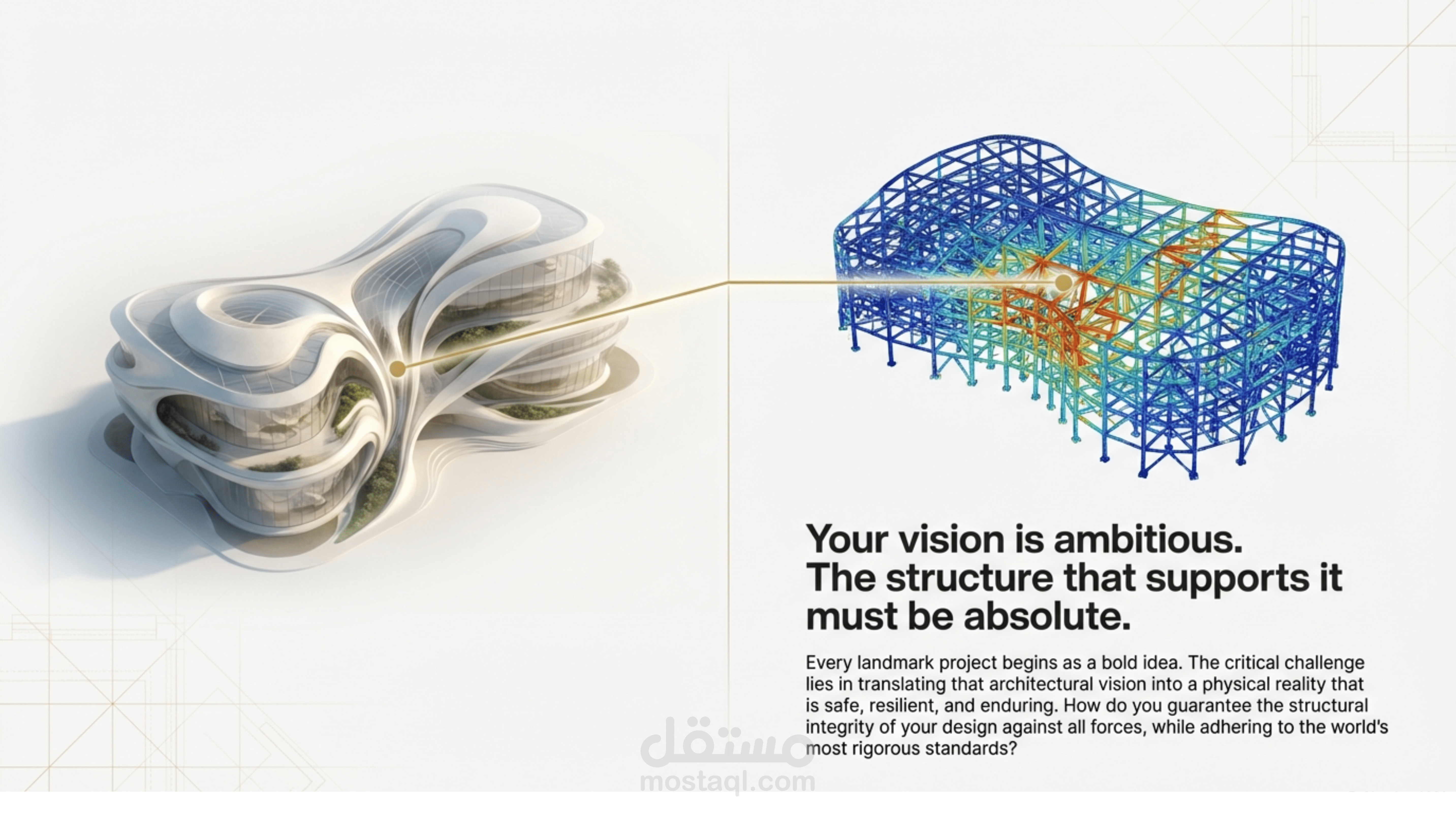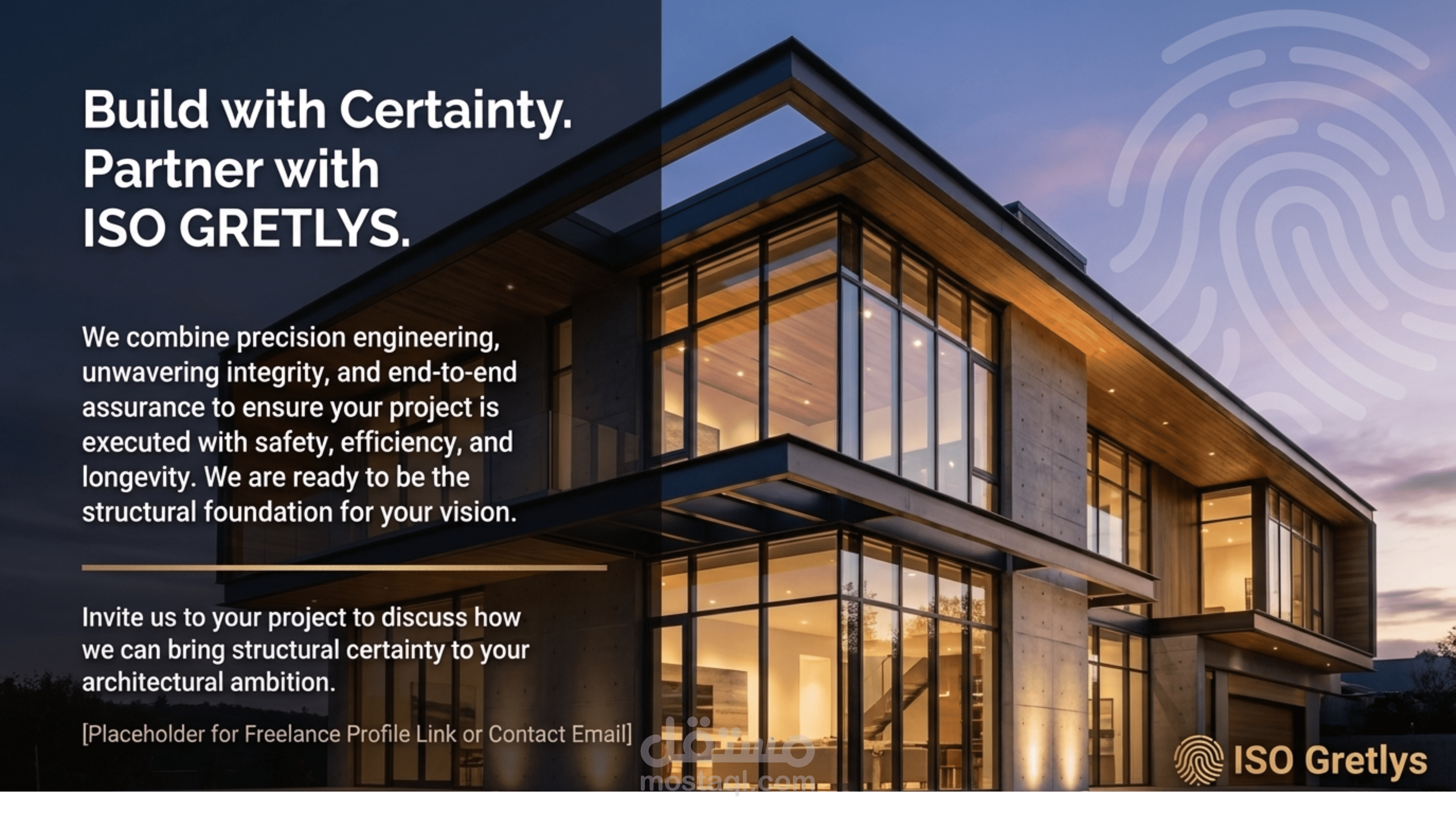 الخلاصة: يمثل المستند ملفاً لكيان هندسي يدمج بين الخبرة العميقة (أكثر من 20 عاماً) والتقنيات الحديثة (BIM & ISO Standards)، مقدماً حلاً شاملاً للمالكين يبدأ من دراسة الجدوى وصولاً إلى التشغيل وفض المنازعات، مع التزام صارم بالجودة والمعايير العالمية