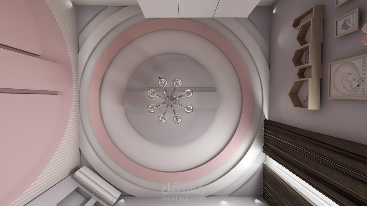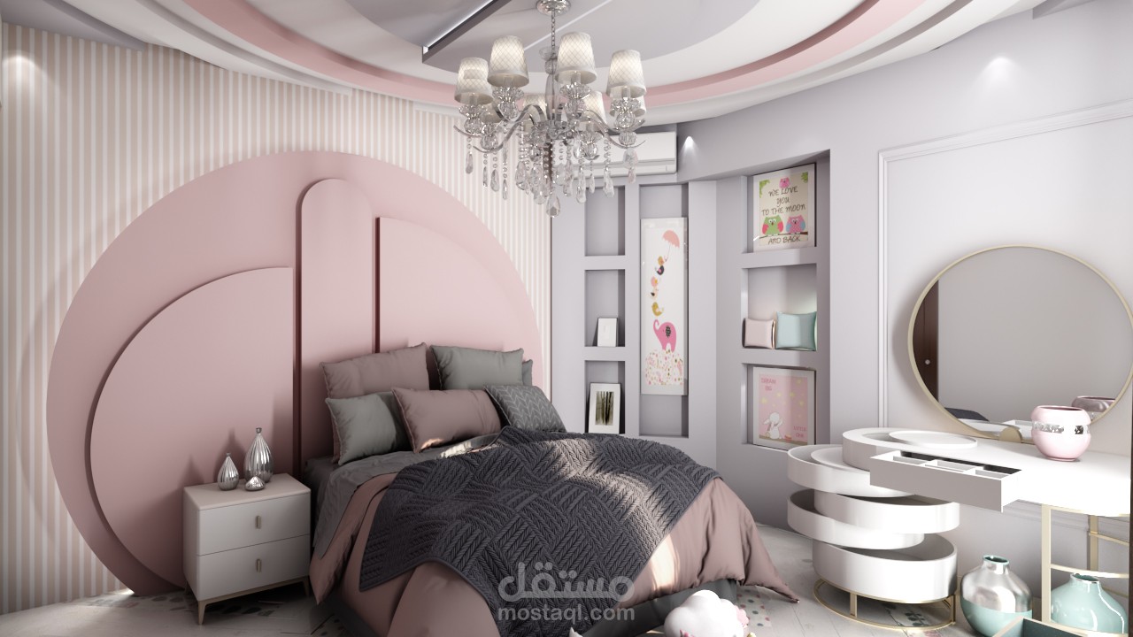 تصميم لغرفة بنت , تصميم مودرن , يتميز التصميم بالألوان الهادئه مع الانحناءات