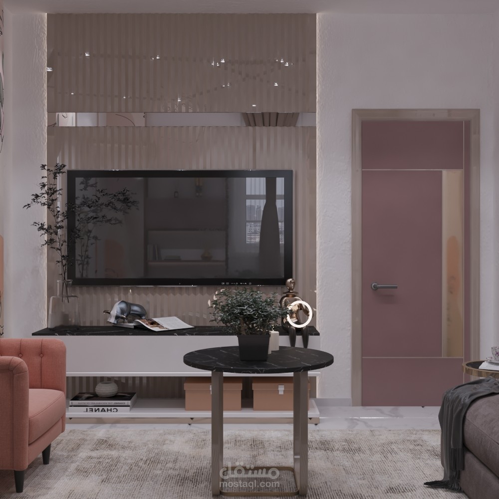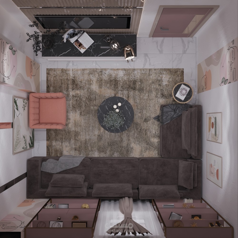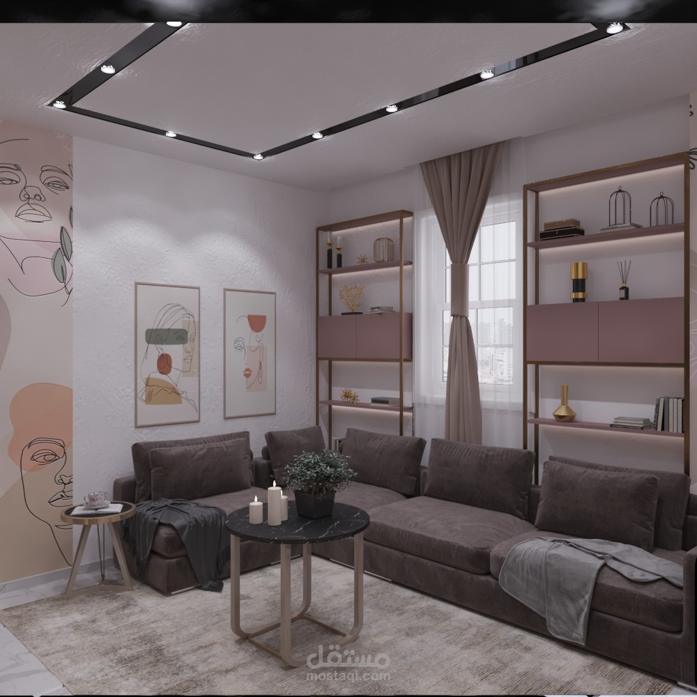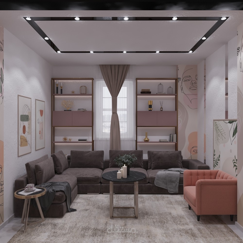 تصميم لغرفة معيشه عصريه جديده وفقا لبلتة الوان محددة و هادئه للشعور بالراحة و الانسجام داخل الغرفه