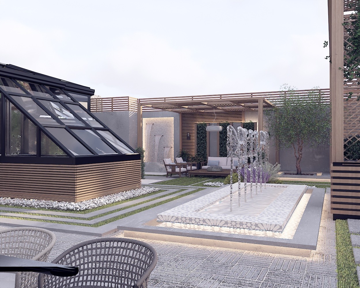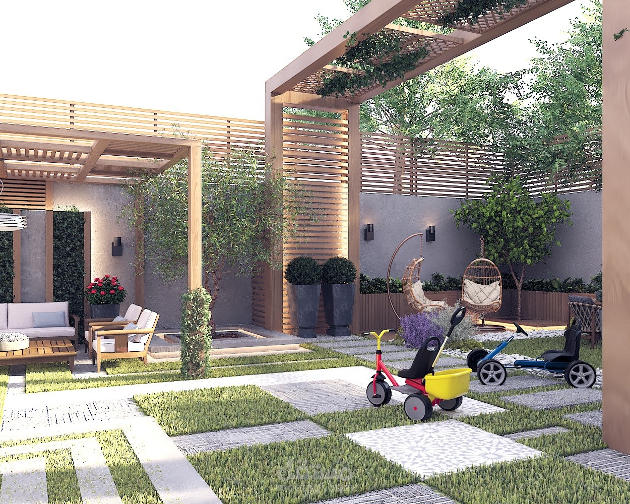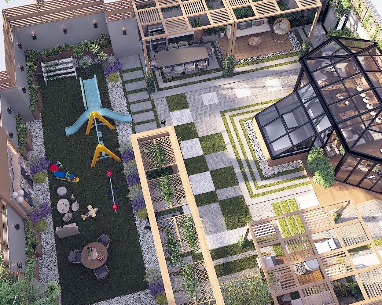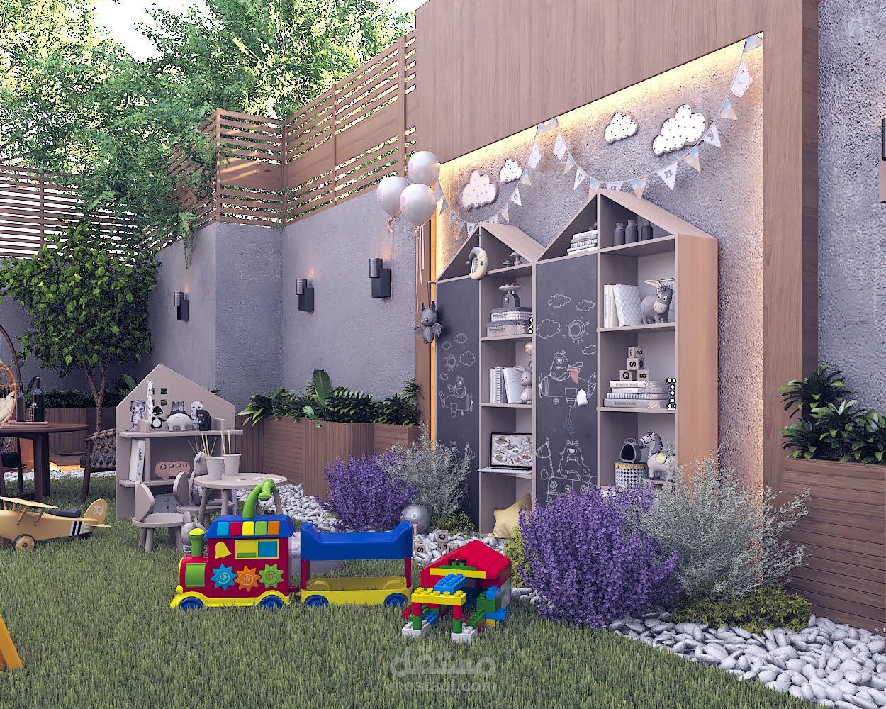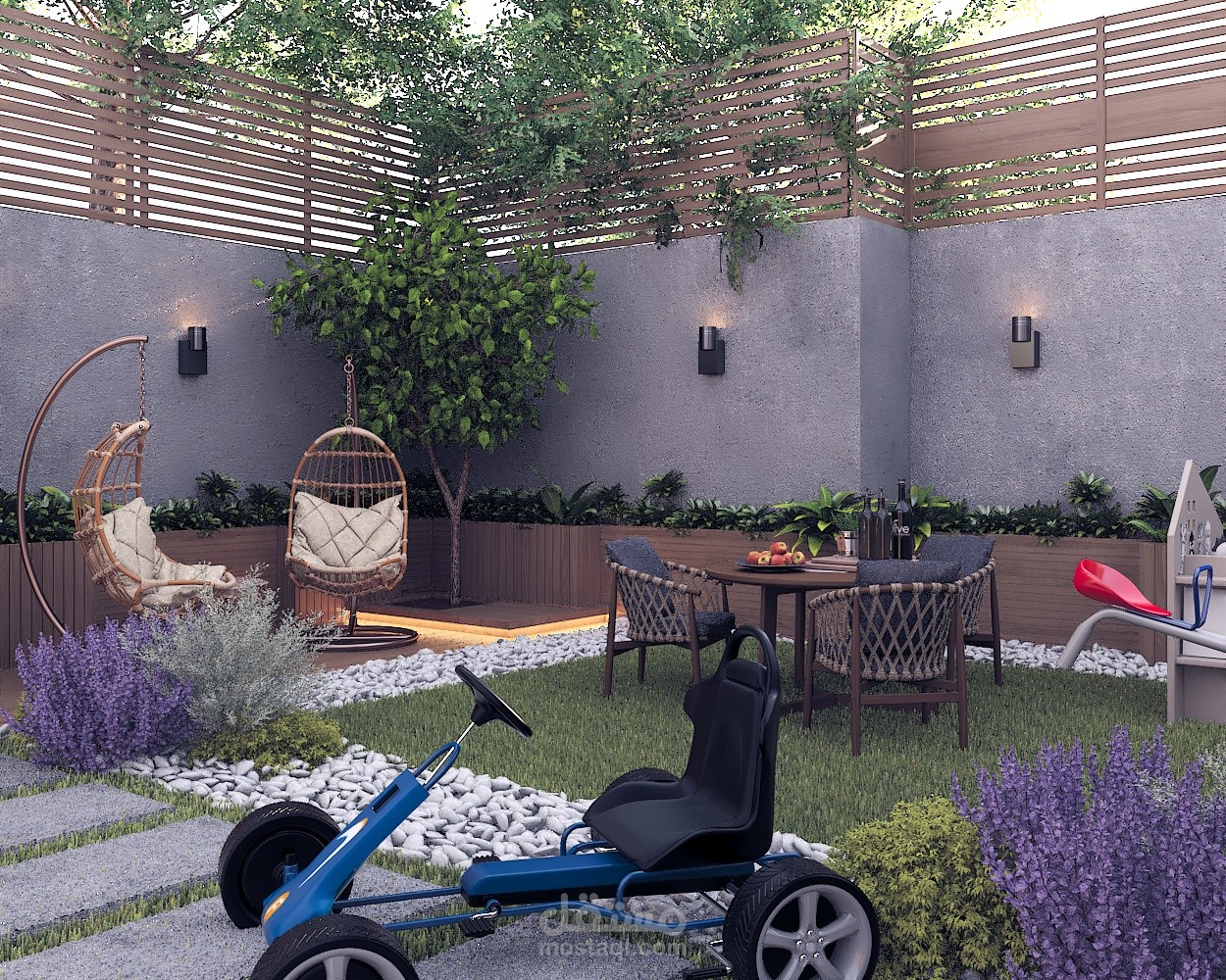 تصميم حديقة روف علي متطلبات العميلة حيث طلبت جلسة عاءلية ومنطقة للعب الاطفال و جزء لجلسة طعام و باربيكيو
