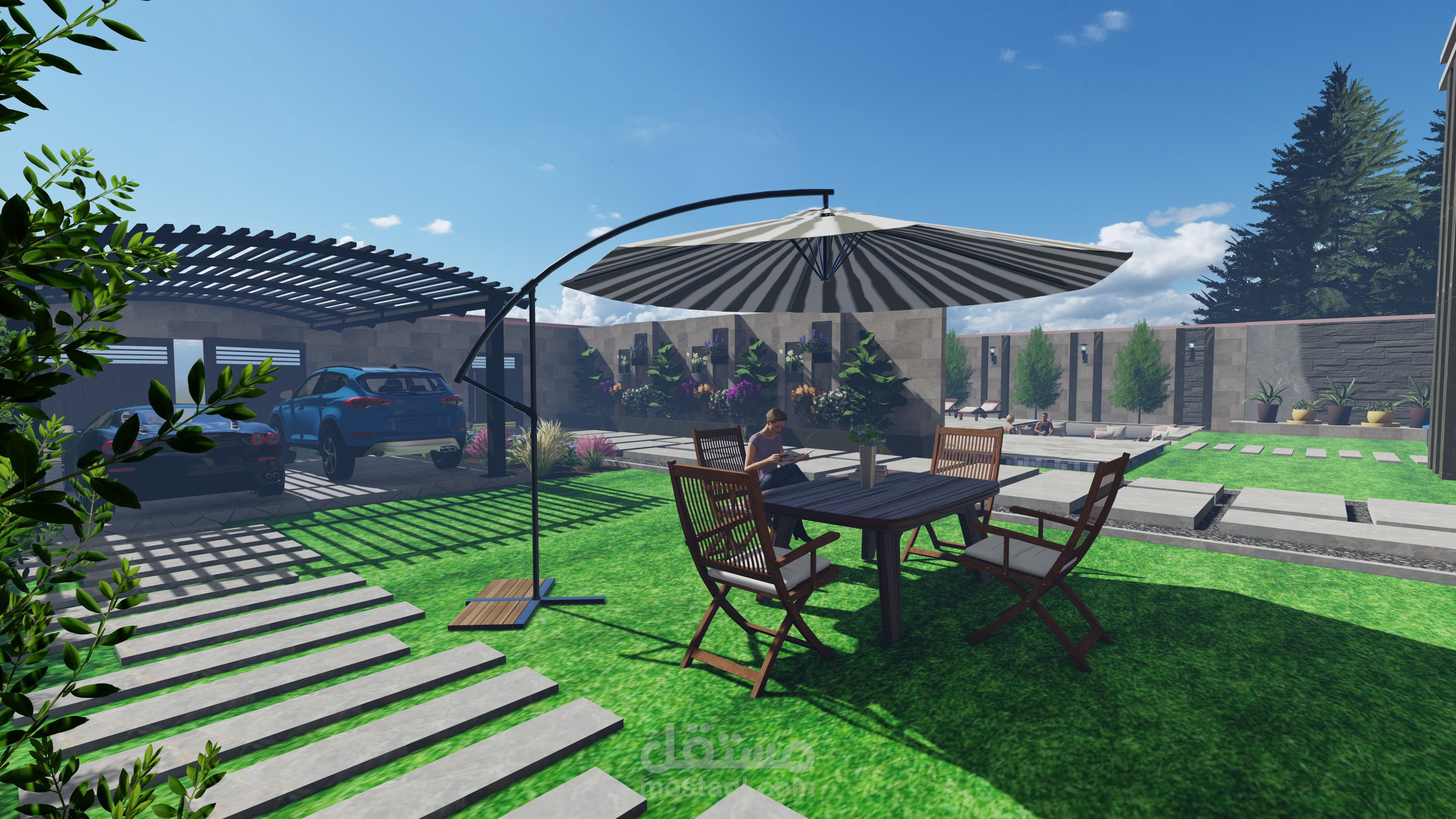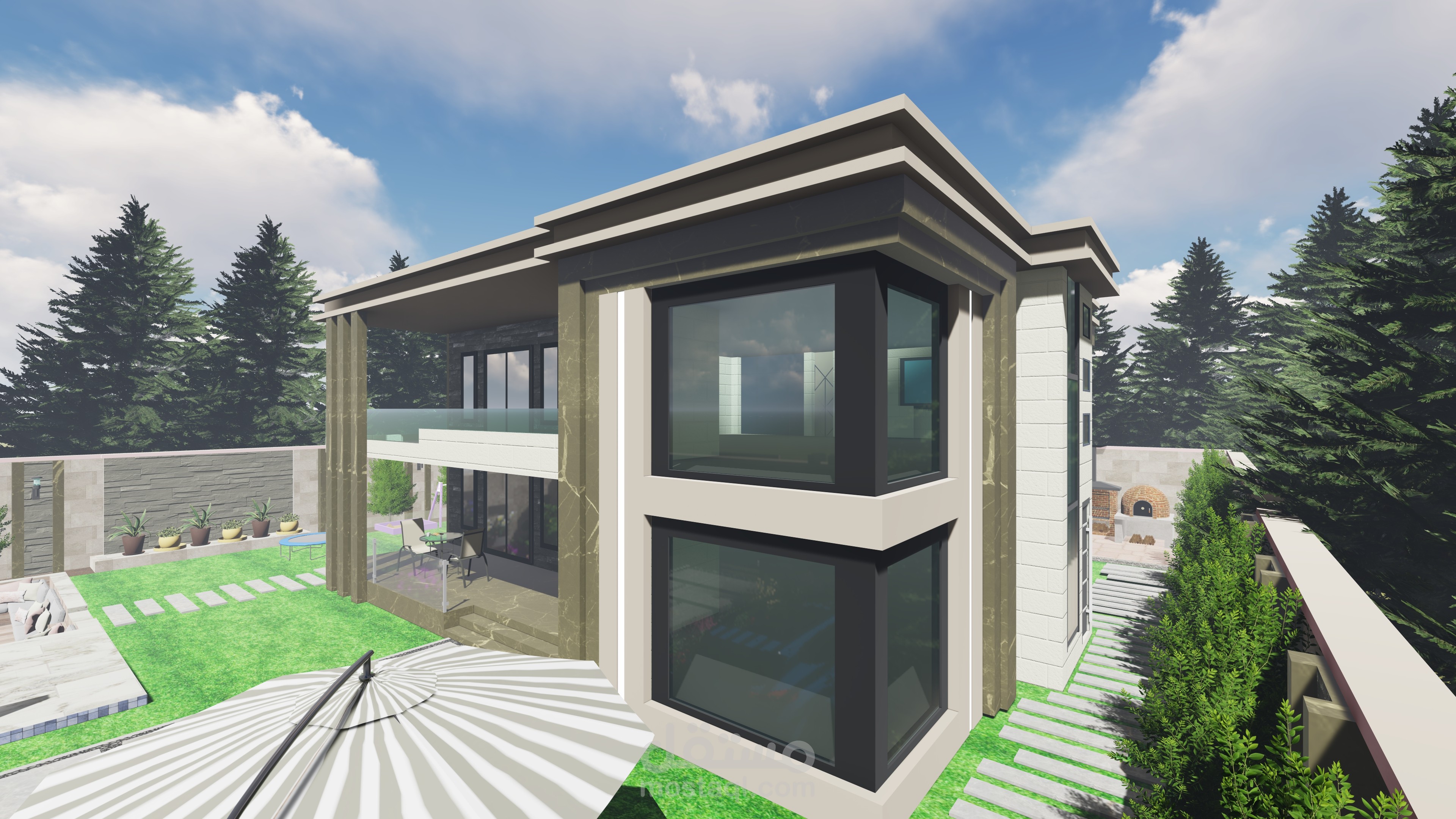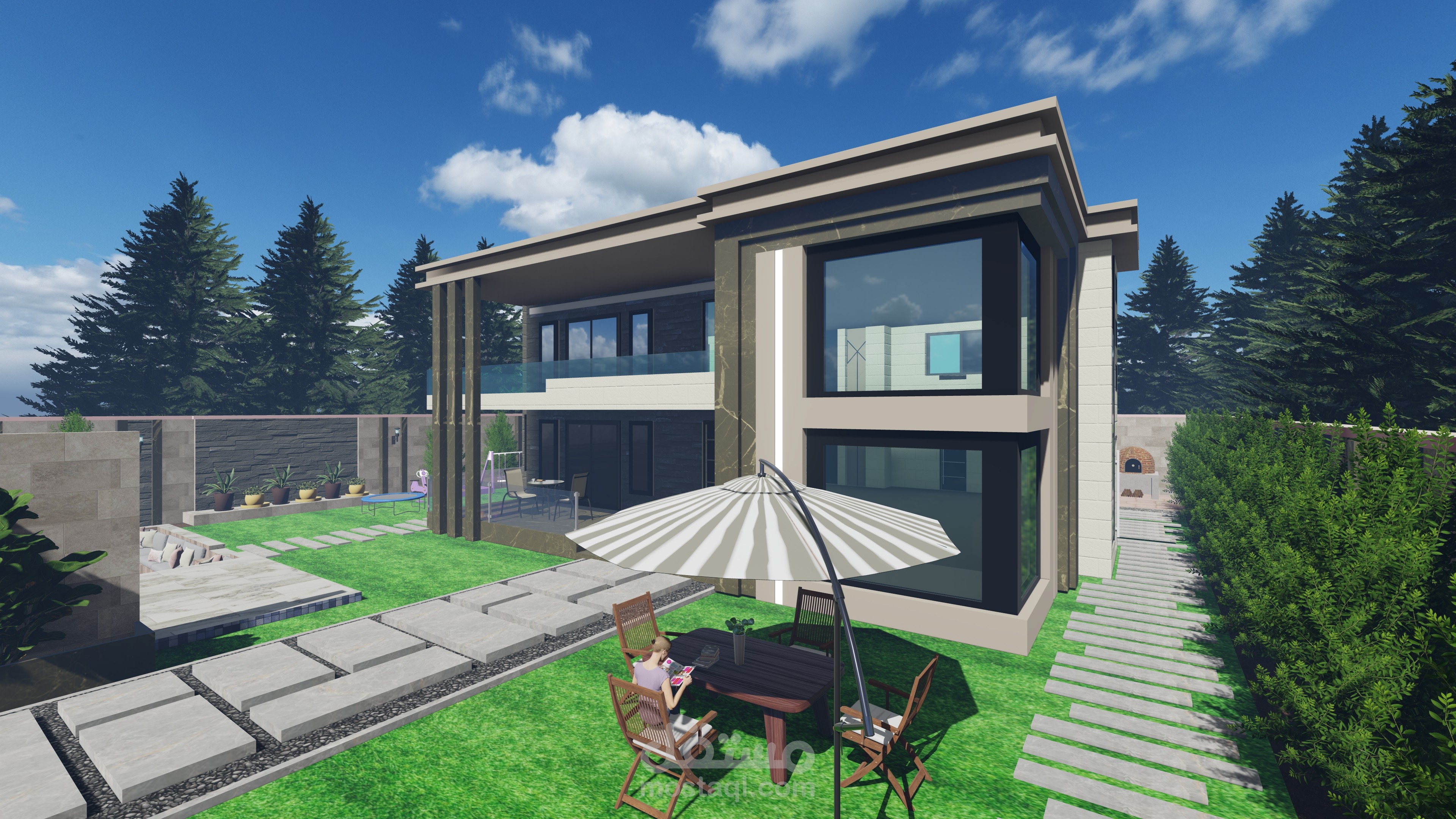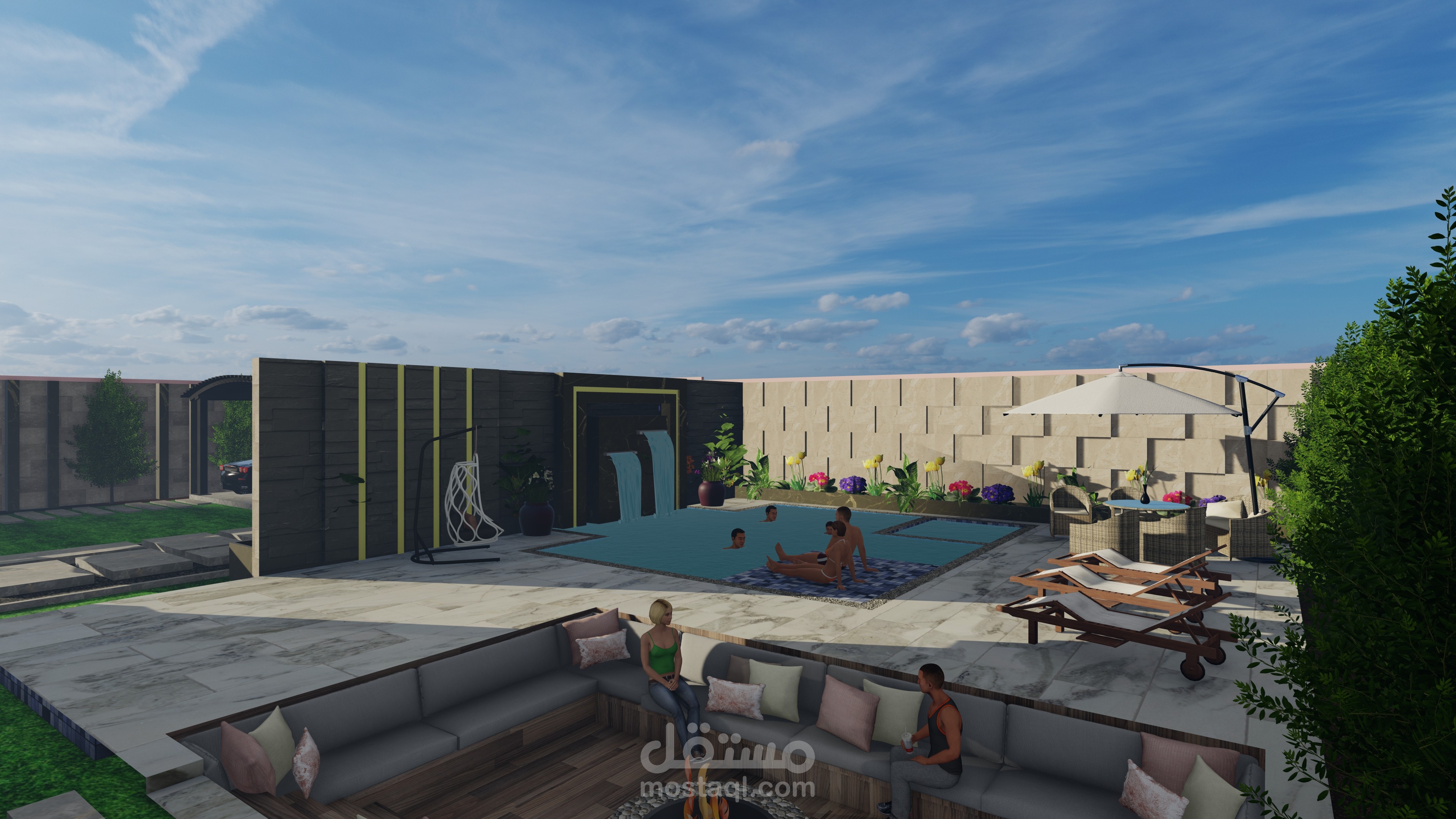 تصميمي لفيلا صغيرة مع مسبح وجلسات عائلية وحديقة