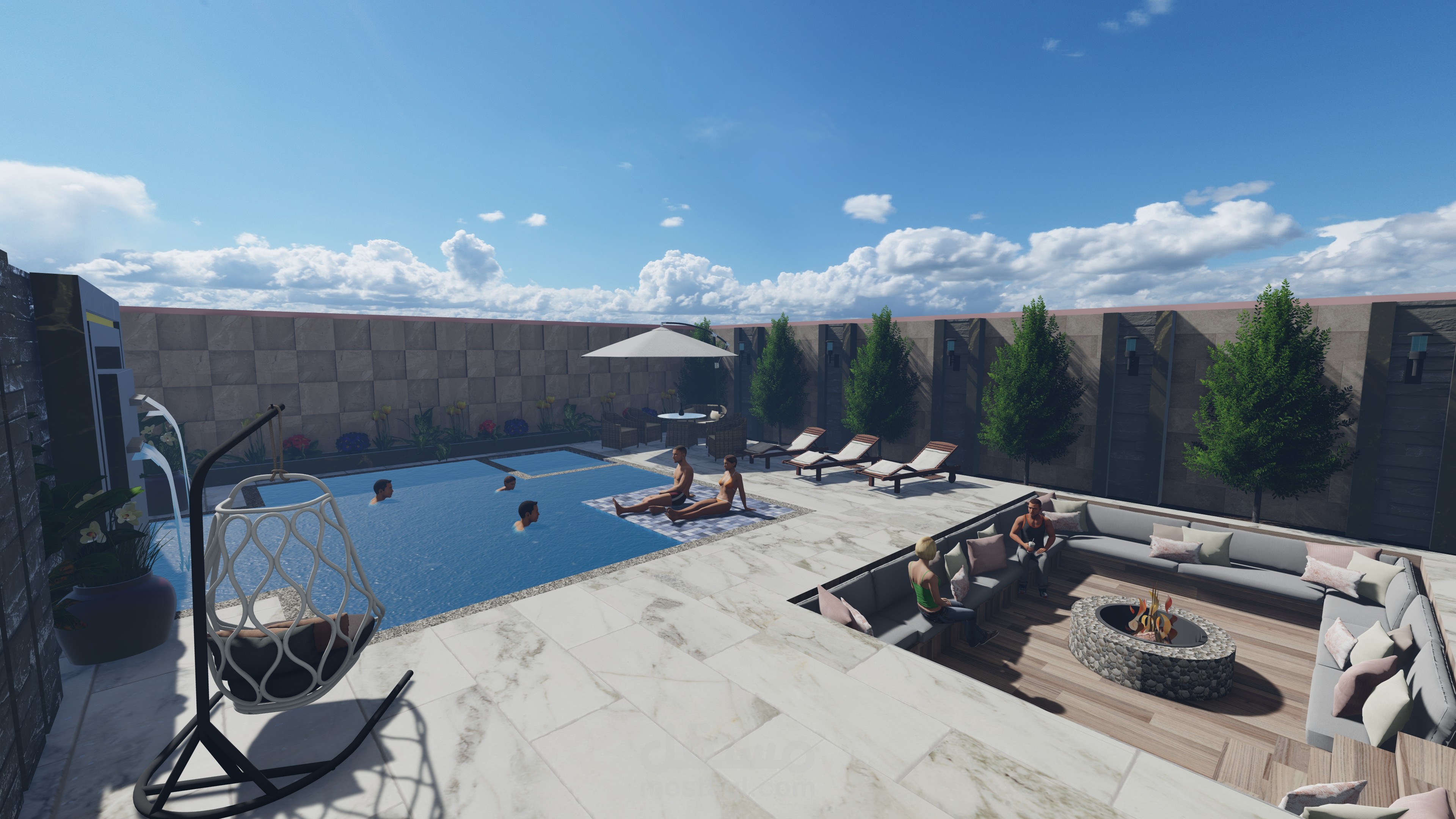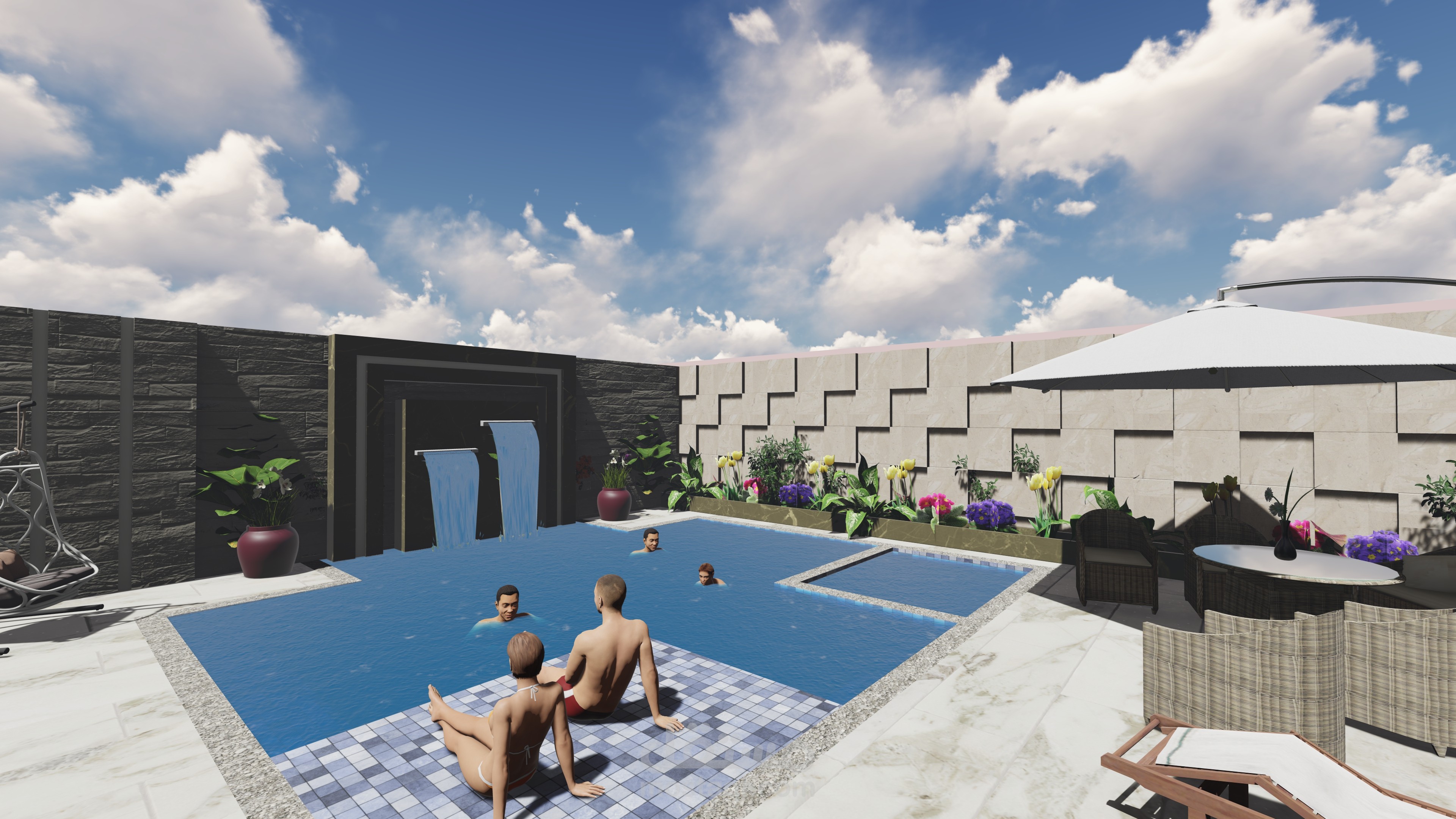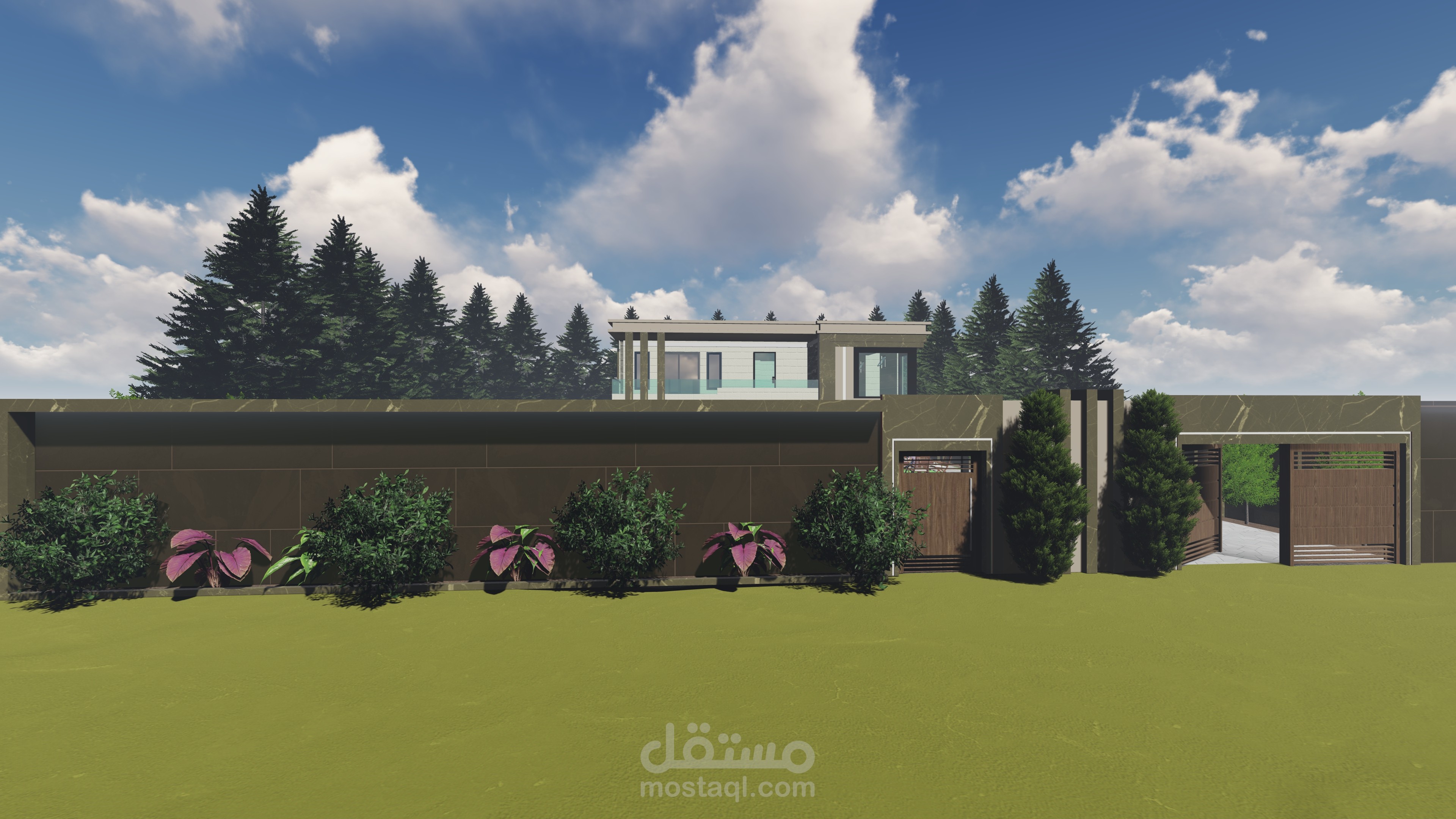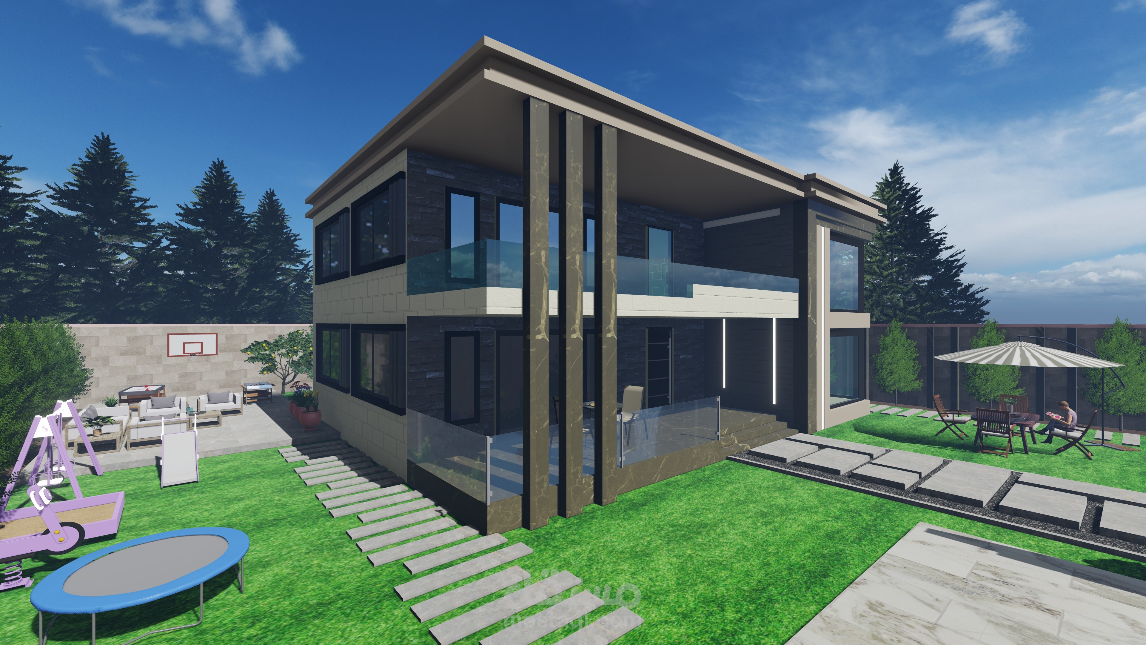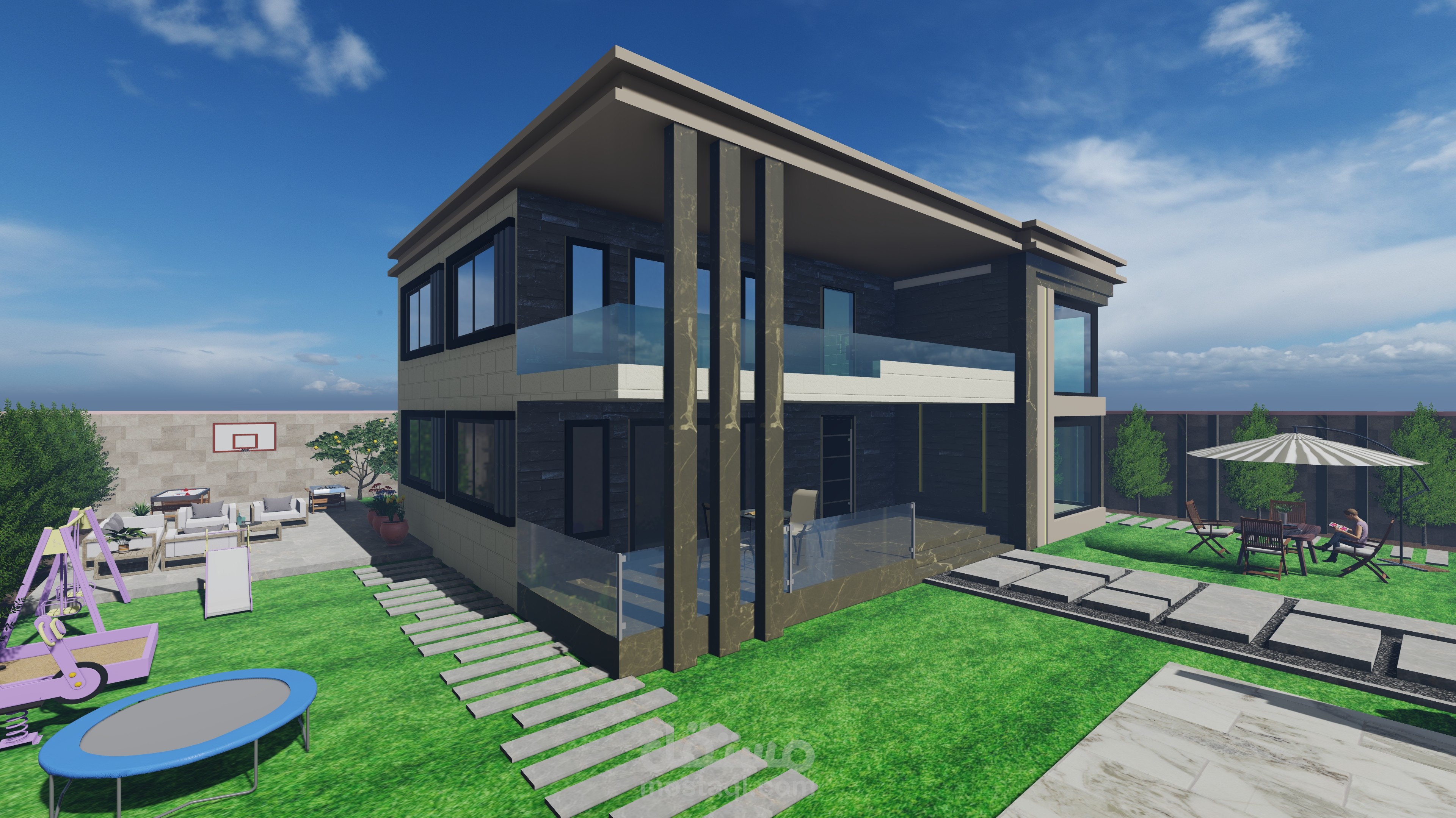 تصميمي لفيلا صغيرة مع مسبح وجلسات عائلية وحديقة