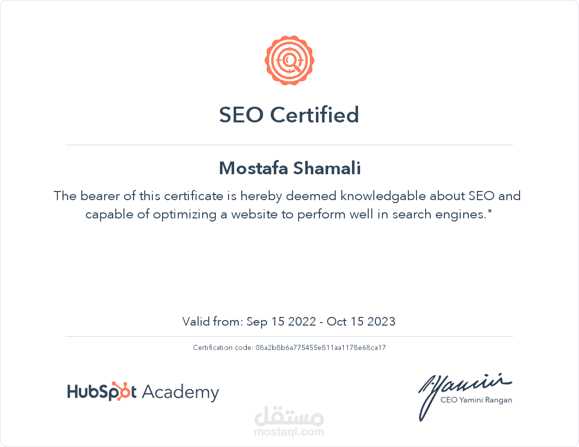 شهادة من موقع HubSpot في مجال الSEO .