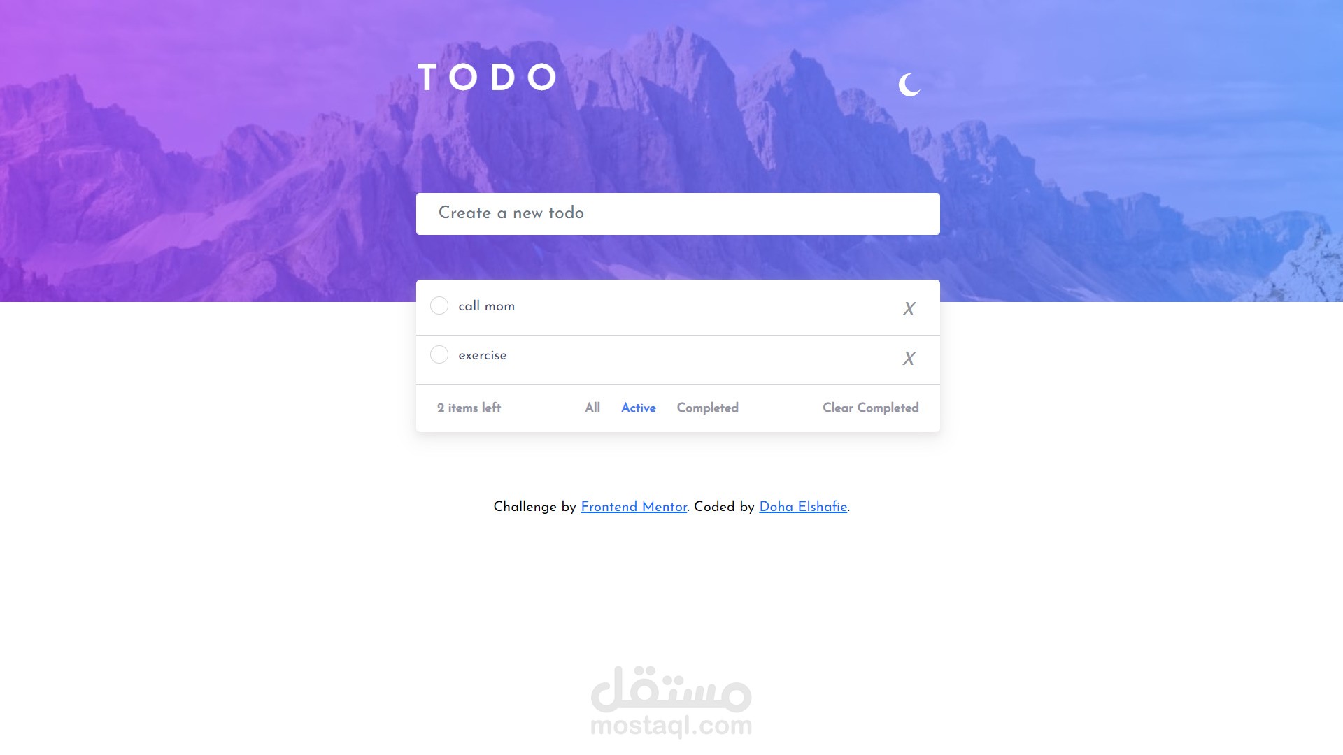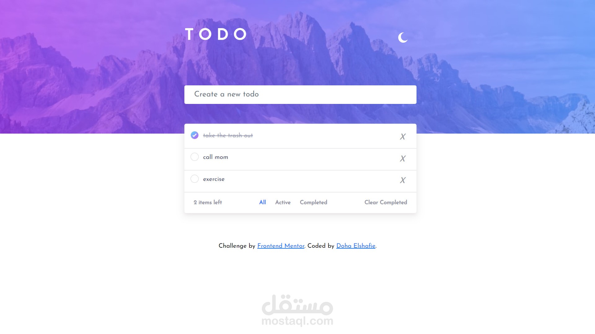 هذا موقع/تطبيق الكتروني يساعد المستخدم علي عمل قائمة مهامه ، مع مميزات مثل تحديد المنتهي منها و عدد المهام المتبقية، و في هذا الموقع/التطبيق الاكتروني ميزة ال dark mode ، و بالطبع انه متجاوب مع احجام الشاشات المختلفة.