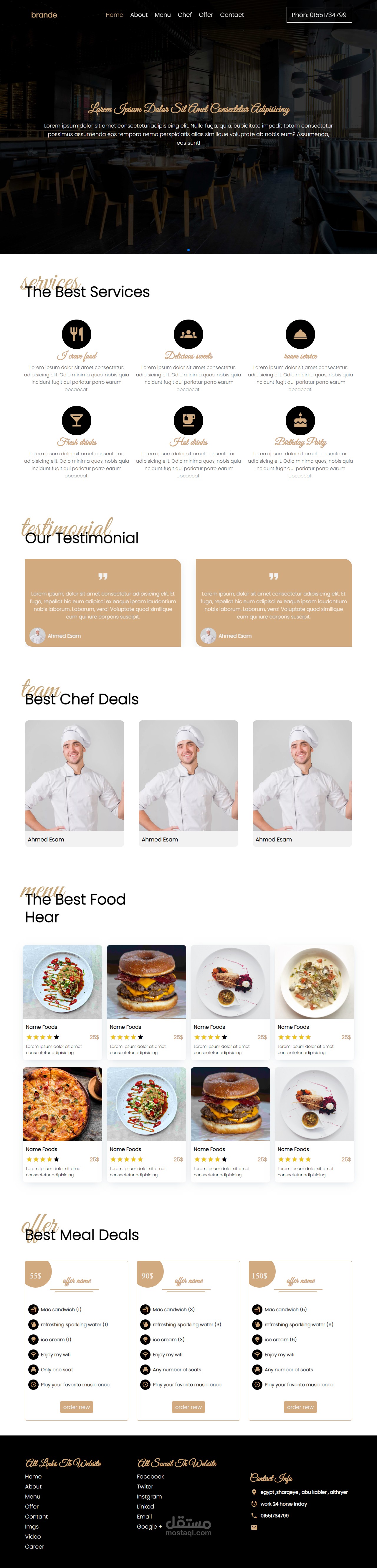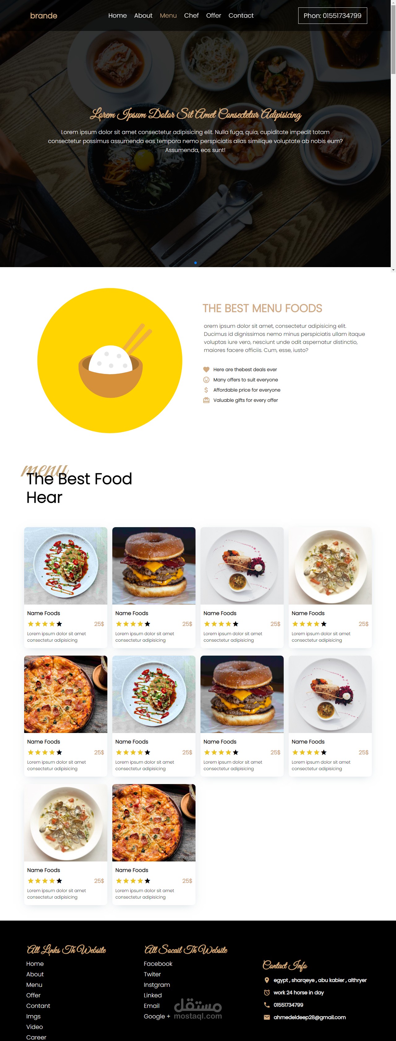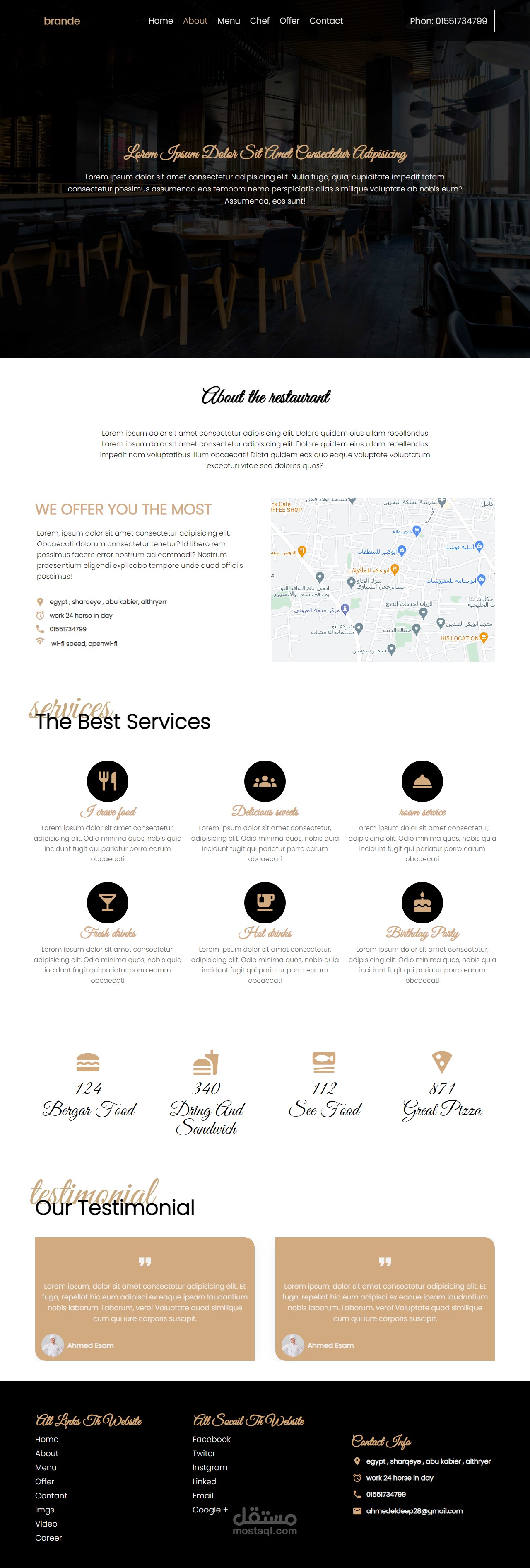 موقع مطعم وكافيتريا بشكل جذاب وعالي الأداء يعرض تفاصيل عن المطعم ويعرض الأطعمة التي يقدمها ويقدمها على الوجبات