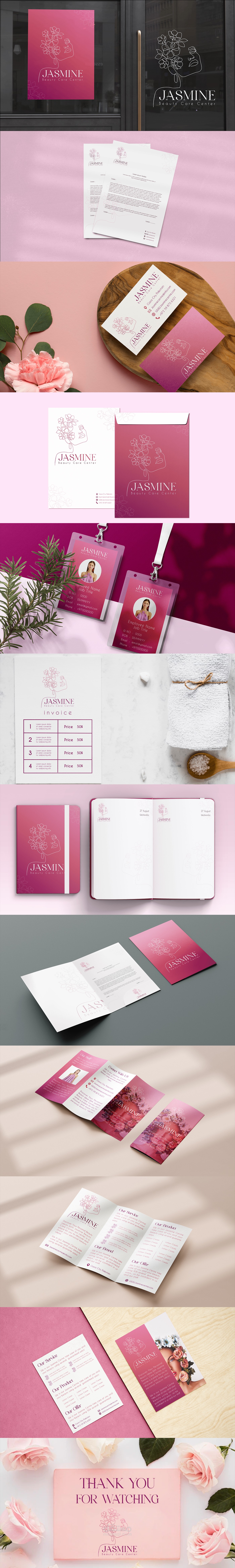 تصميم جميع اجزاء الهوية البصرية ل Jasmine Beauty Care Centre بتصاميم جذابة وألوان رائعة .