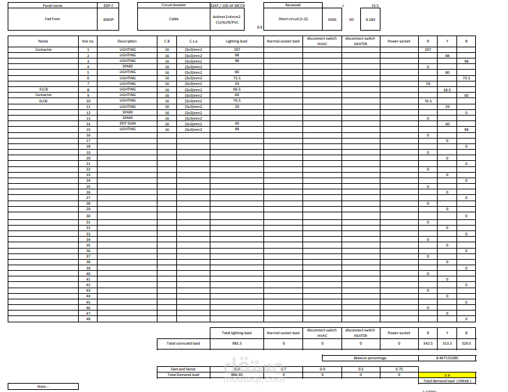 حسابات الاحمال و المساحات و حساب الCircuit breaker باستخدام الاكسل