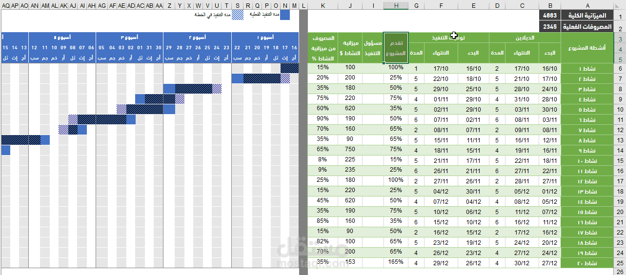 إعداد مخطط زمني لمشروع يوضح مراحل خطة العمل والتوقيت الحقيقي لسير العمل