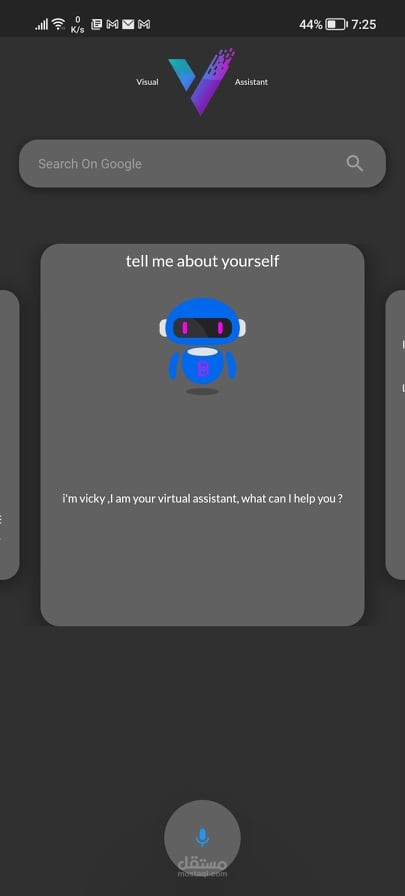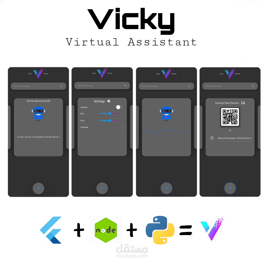 مساعد تقني افتراضي تم تصميم الواجهات الامامية باستخدام لغة Flutter & Dart و تم استخدام Node.js في انشاء ال API من اجل تبادل البيانات بين التطبيق و المخدم و تم استخدام لغة Python في انشاء و تدريب النموذج من اجل فهم الاوامر الصوتية و ارجاع استجابة صوتية او تنفيذية.