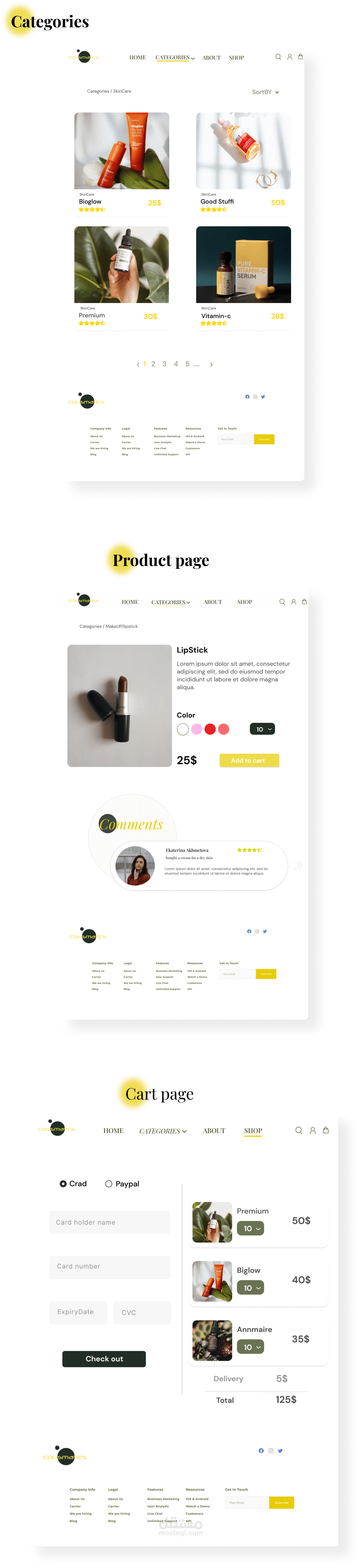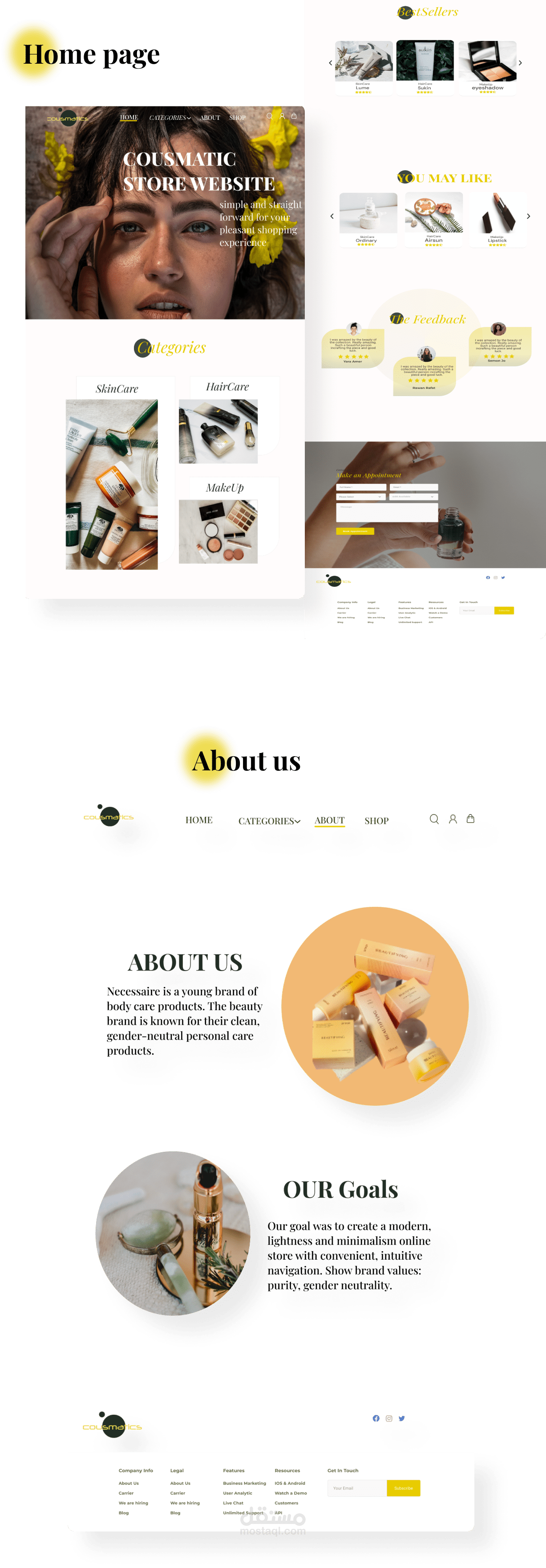 تصميم موقع ويب يعرض للمستخدم خدمة انتقاء أفضل منتجات العناية بالبشرة وكل ما يخص المرأة ويمكن المستخدم من الاطلاع على أحدث مستجدات شركة التصنيع في الأسواق وإتمام عملية اختياره وشراؤه ودفعه بطريقة إلكترونية تخدم راحة الزبون ،يتضمن تفاصيل المنتج ويحتوي على نصوص وصور ورسومات ومتجاوب مع جميع واجهات المستخدم.