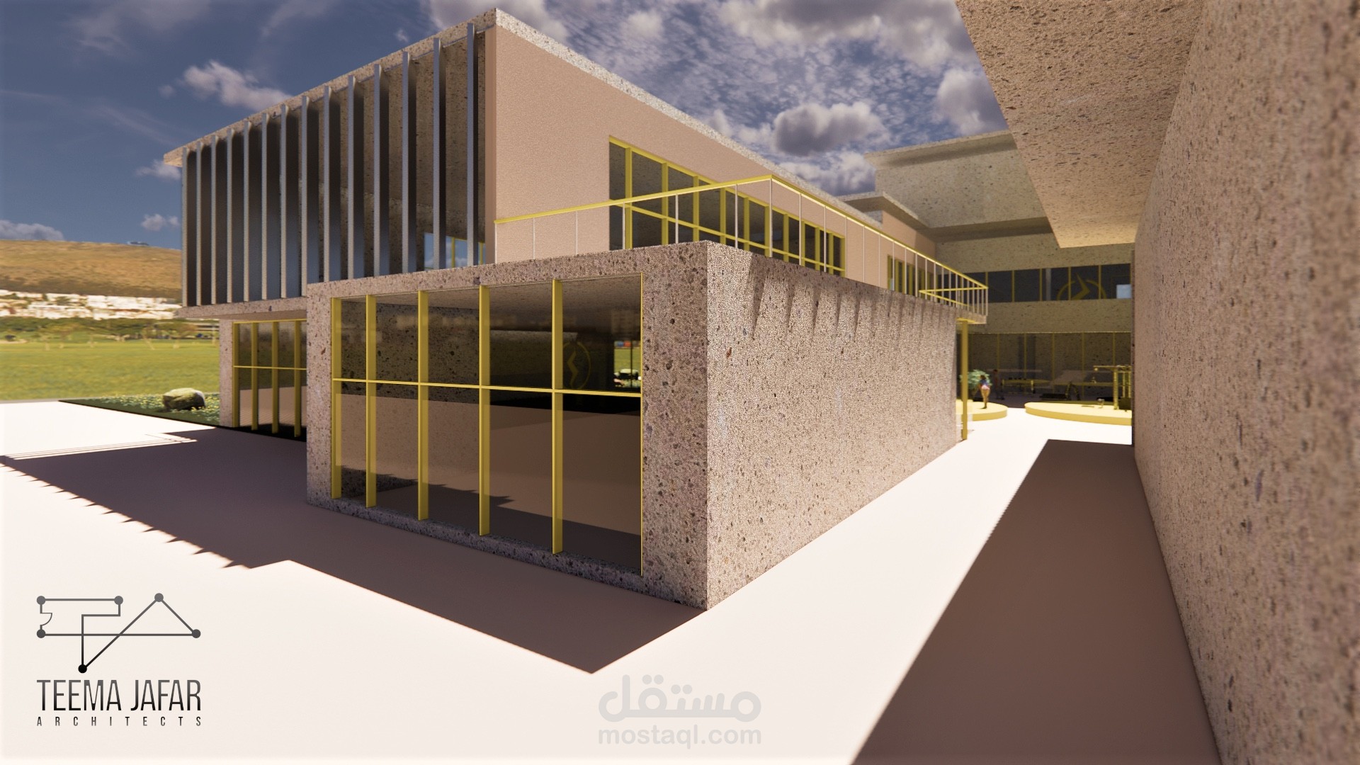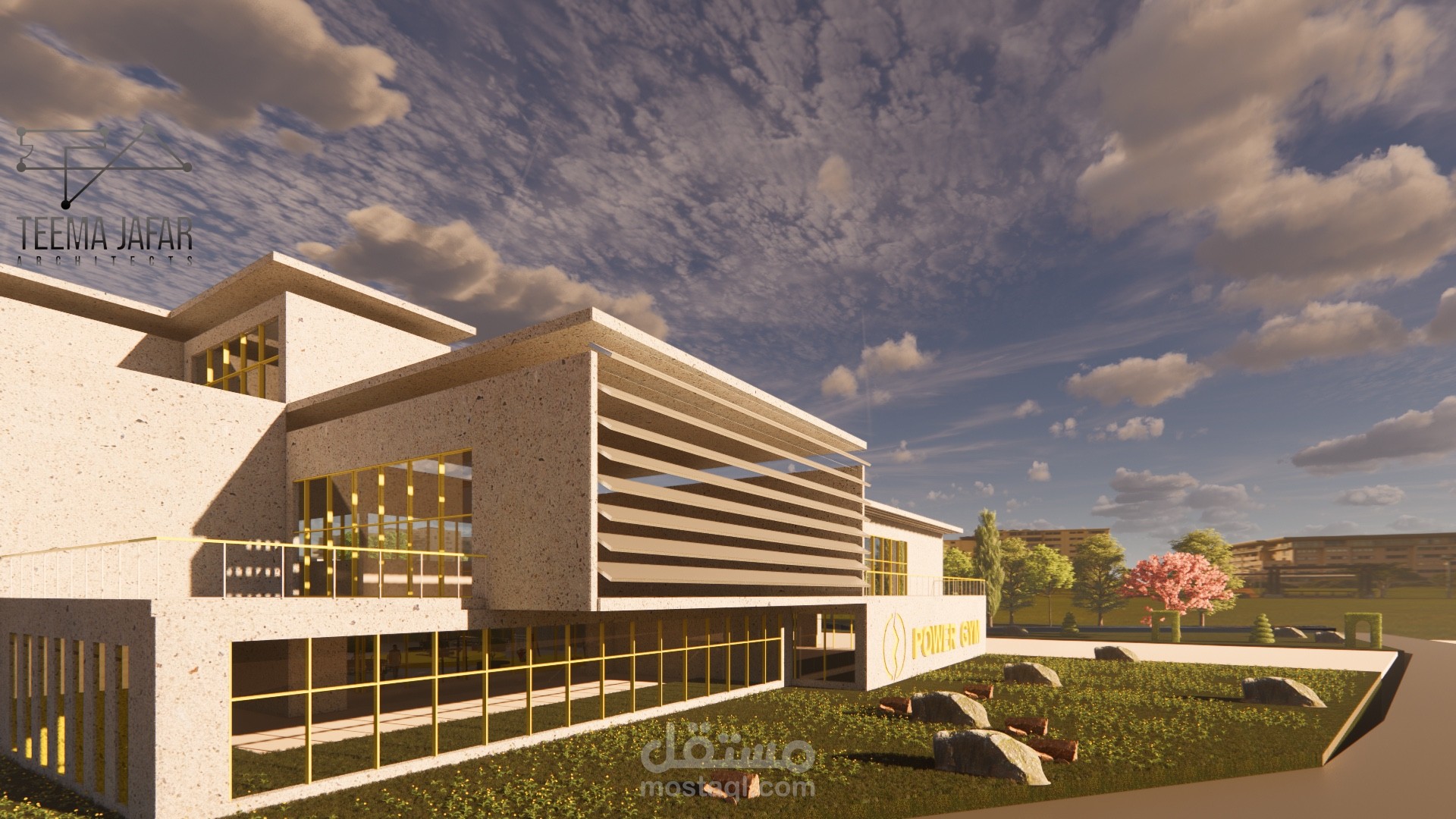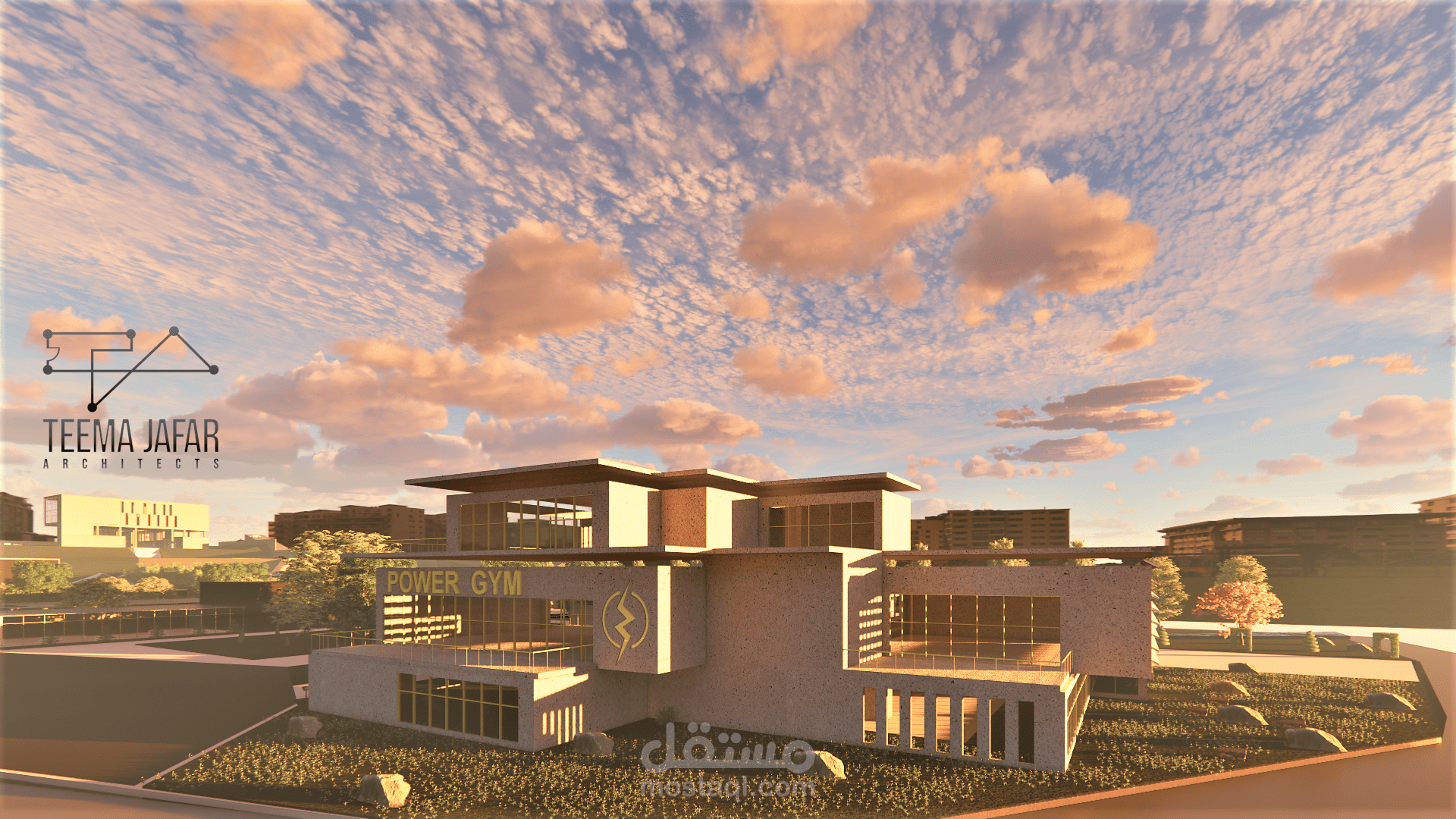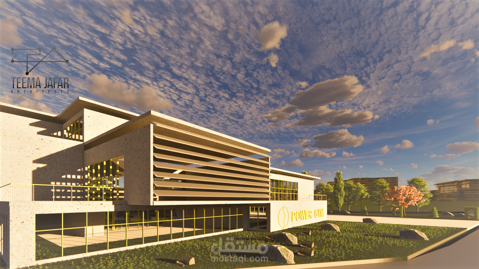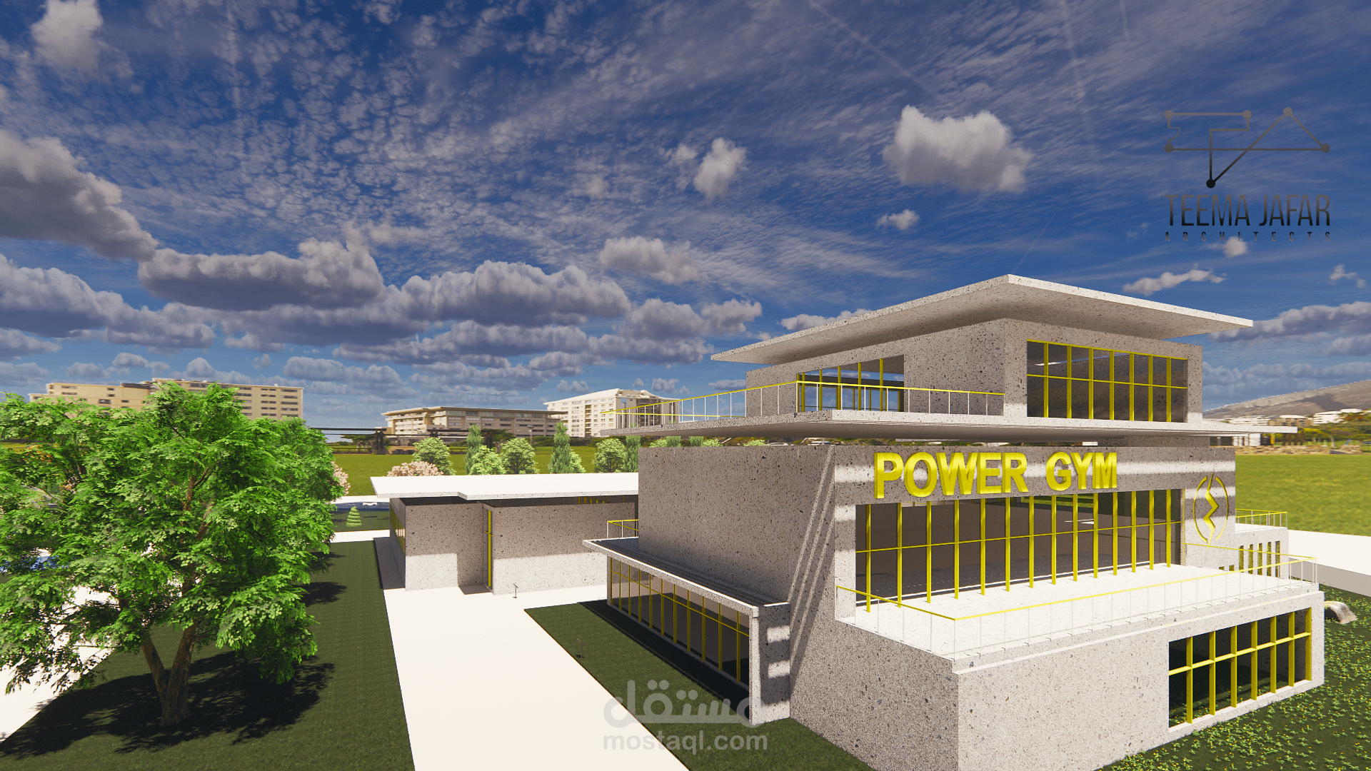 تصميم لجيم خارجي و داخلي مع اخذ اهمية ال circulation و التدرج بالتنقل بعين الاعتبار في النادي الرياضي ، كما انني خلقت رابط بين النادي الرياضي الخارجي و الداخلي عن طريق عمل فناء يحتوي النادي الرياضي الخارجي و يخلق روح التنافس بين اللاعبين من خلال توجيه الانظار للفناء.