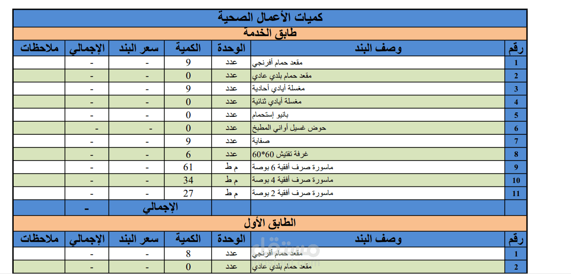 تم عمل جداول حساب كميات تفصيلية ببرنامج الاكسيل تتضمن كميات