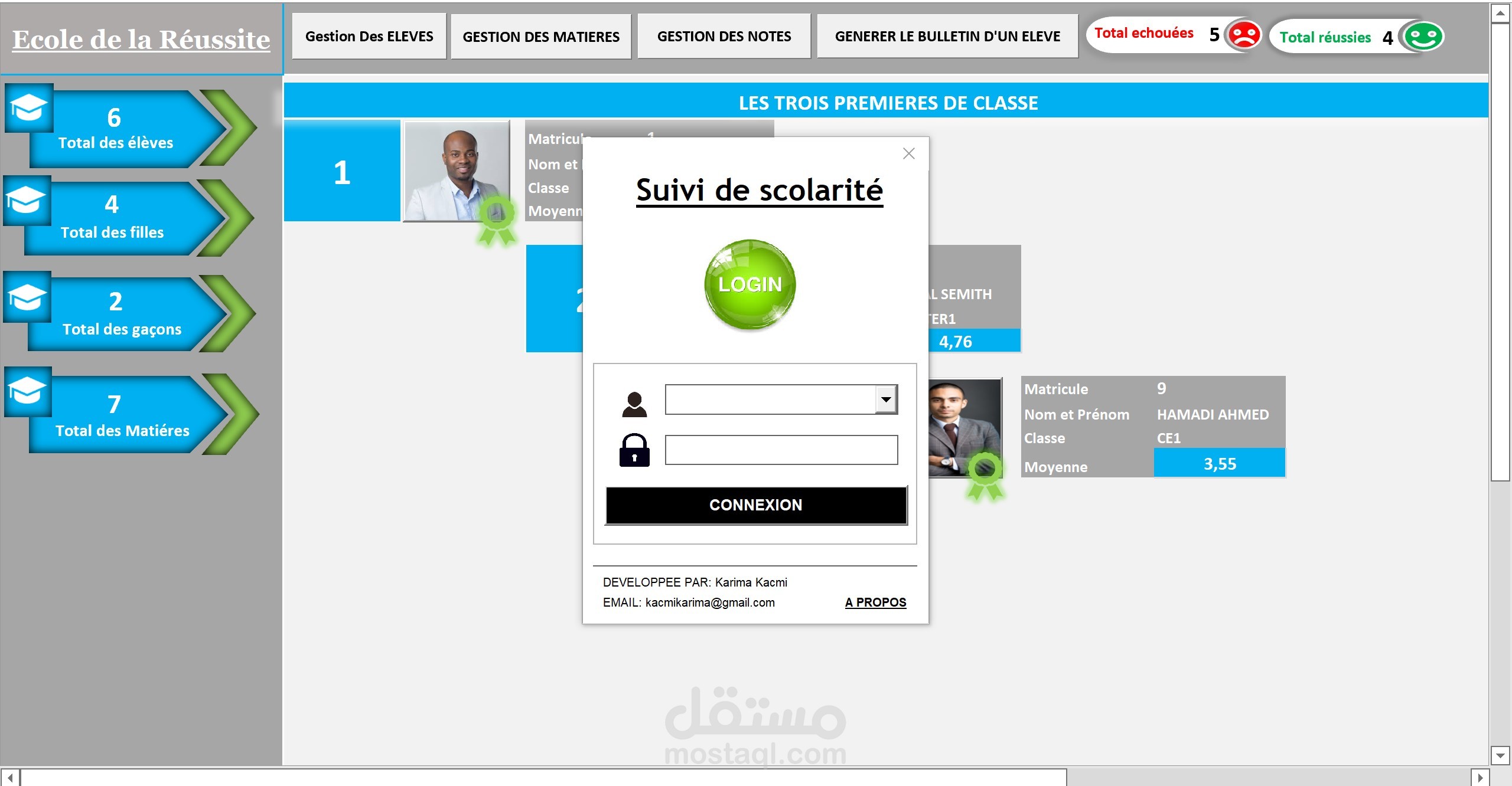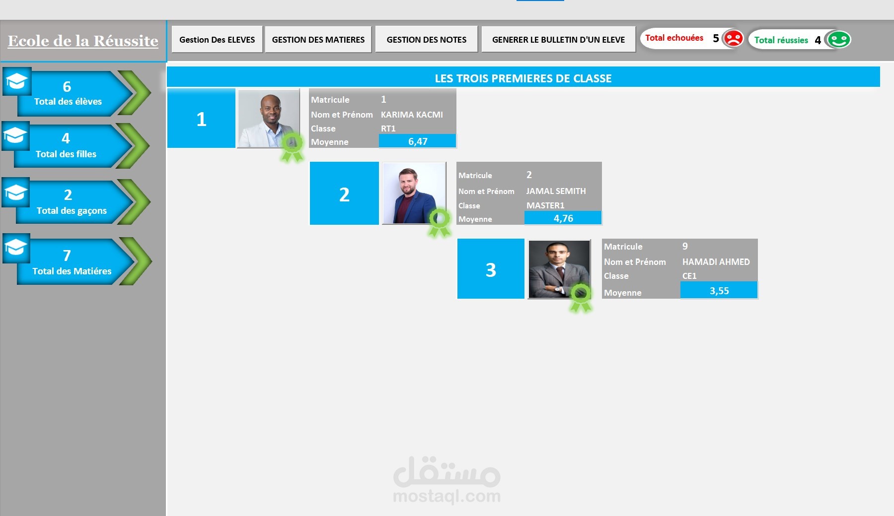 -استخلاص التلاميذ المتفوقين في القسم اتوماتيكيا على الداشبورد الرئيسي مع الصور و تفاصيل عنهم.