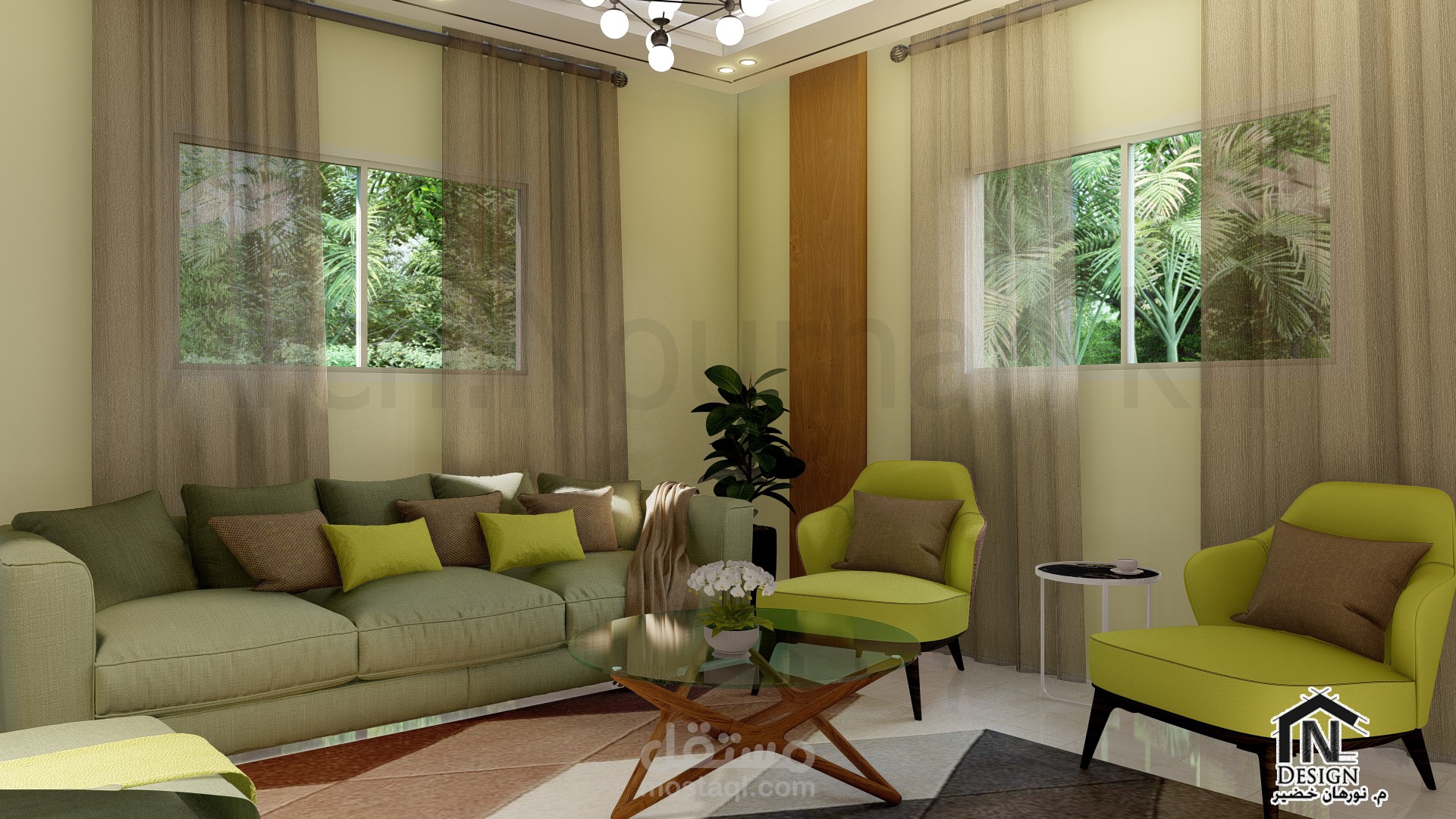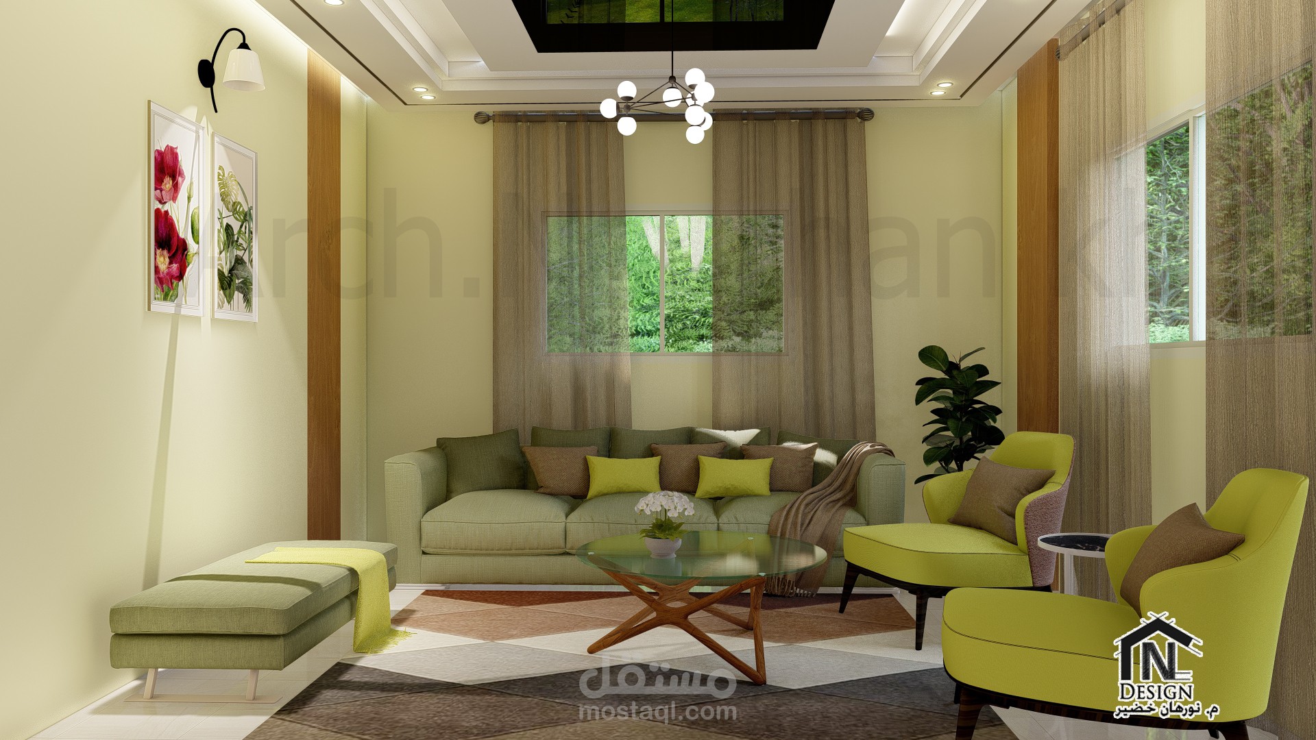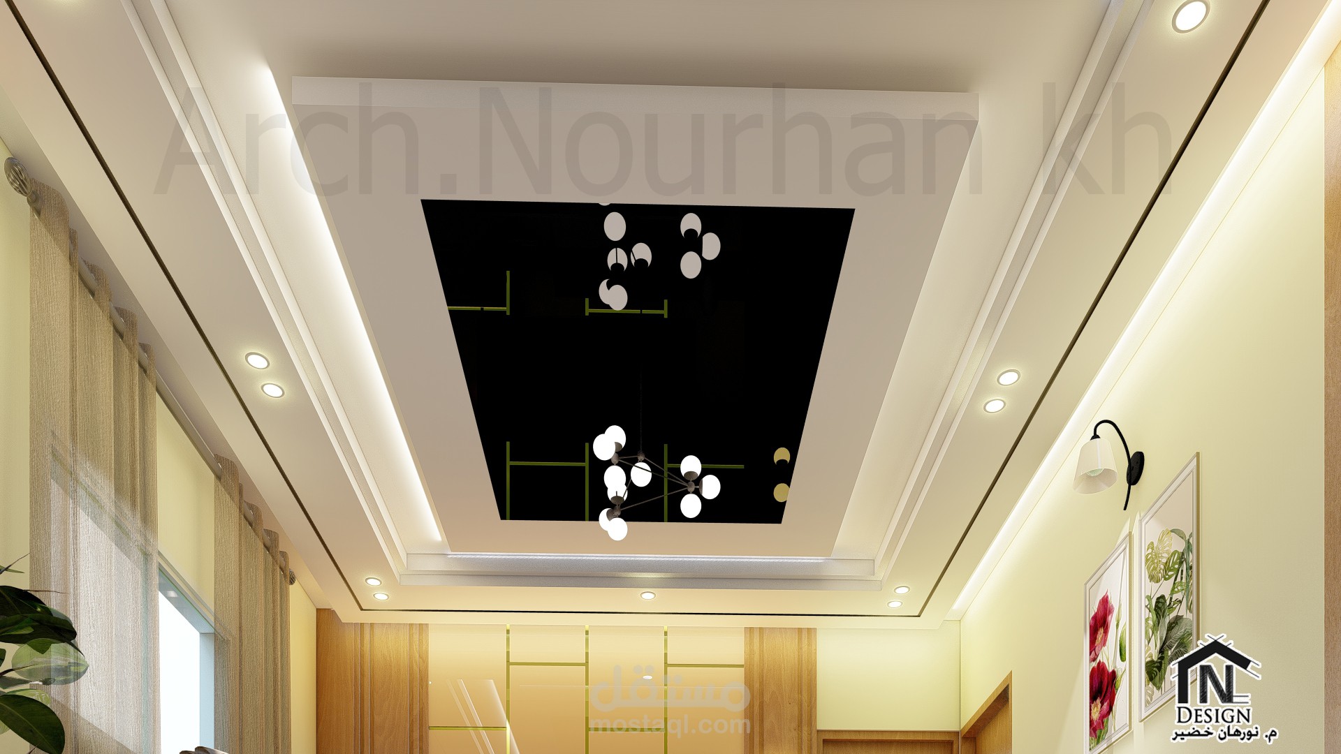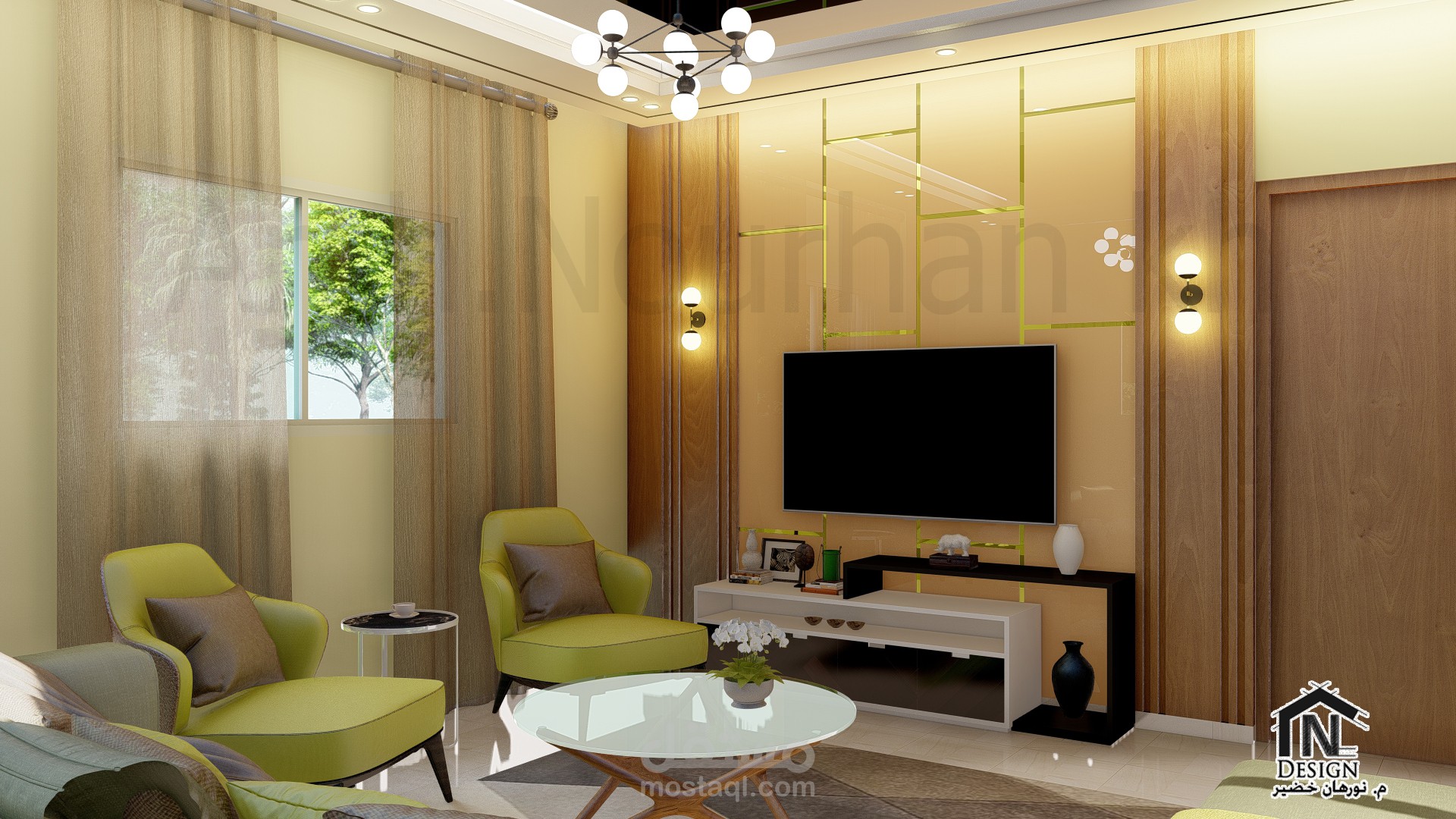 تصميم داخلي لغرفة ضيوف على الطراز الحديث مستخدمة الألوان الخشبية مع بديل الرخام وجعل منطقة خلف التلفزيون نقطة جذب للفراغ.