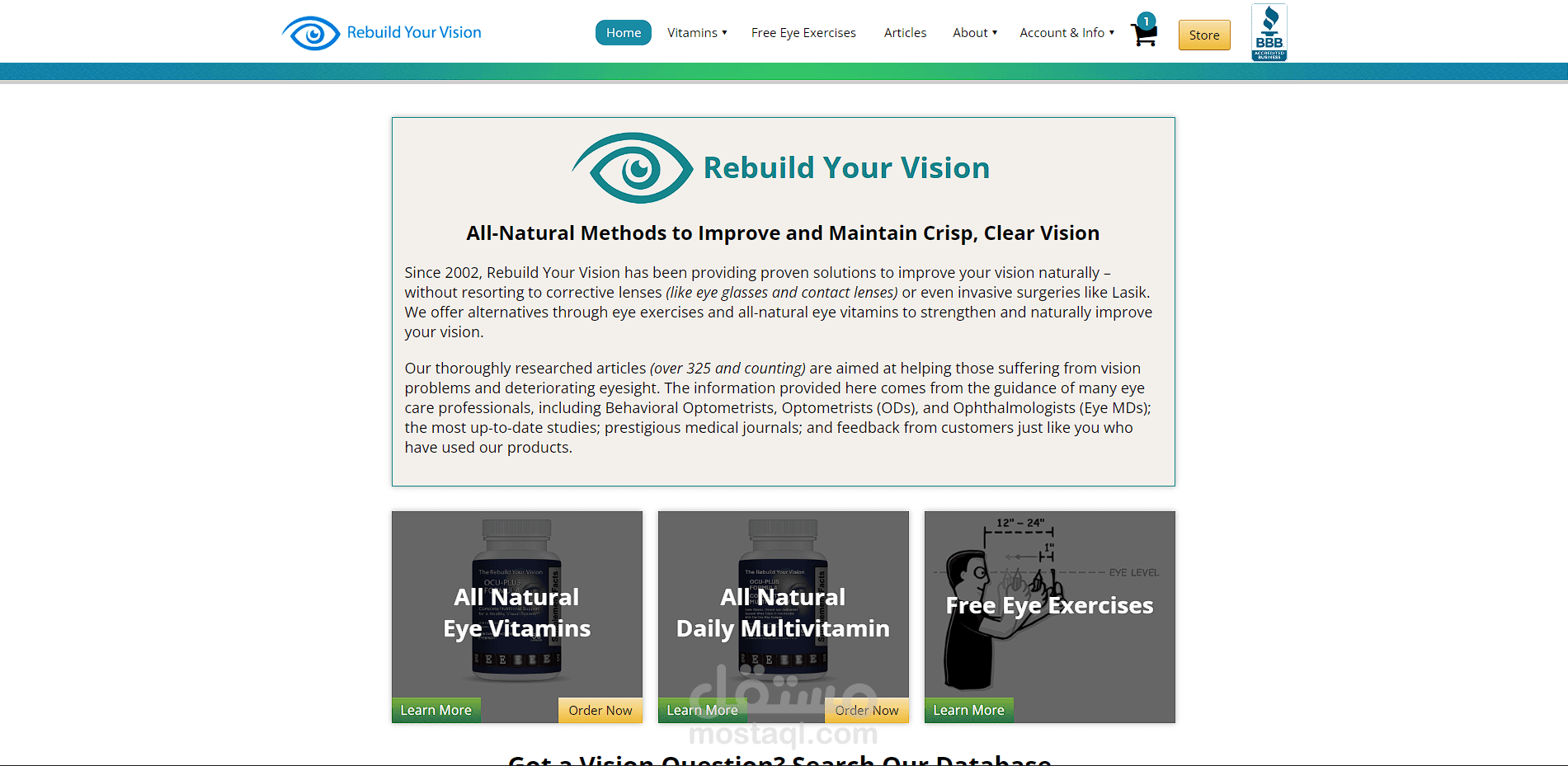 Since 2002, Rebuild Your Vision has been providing proven solutions to improve your vision naturally – without resorting to corrective lenses (like eye glasses and contact lenses) or even invasive surgeries like Lasik. We offer alternatives through eye exercises and all-natural eye vitamins to strengthen and naturally improve your vision.