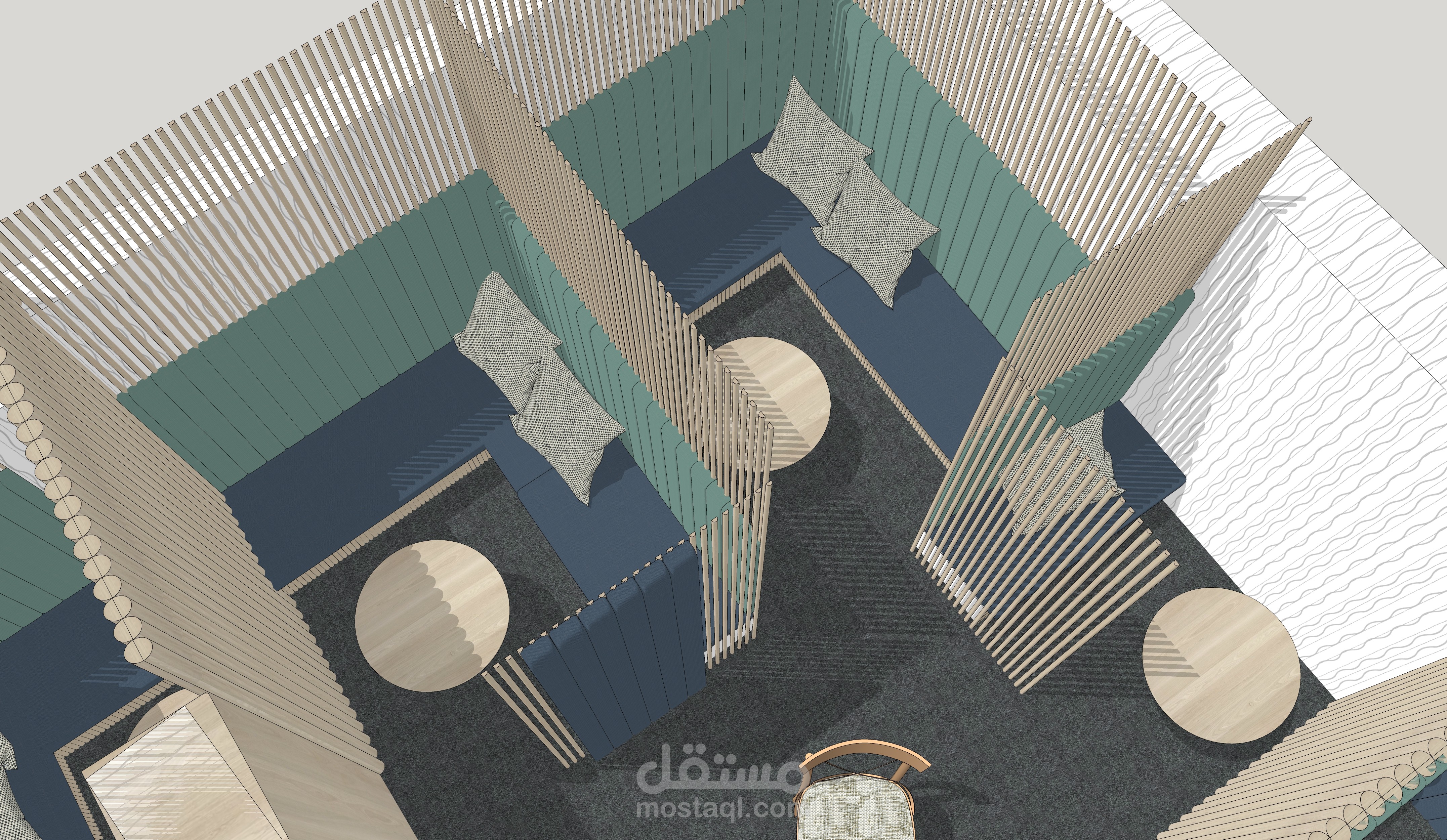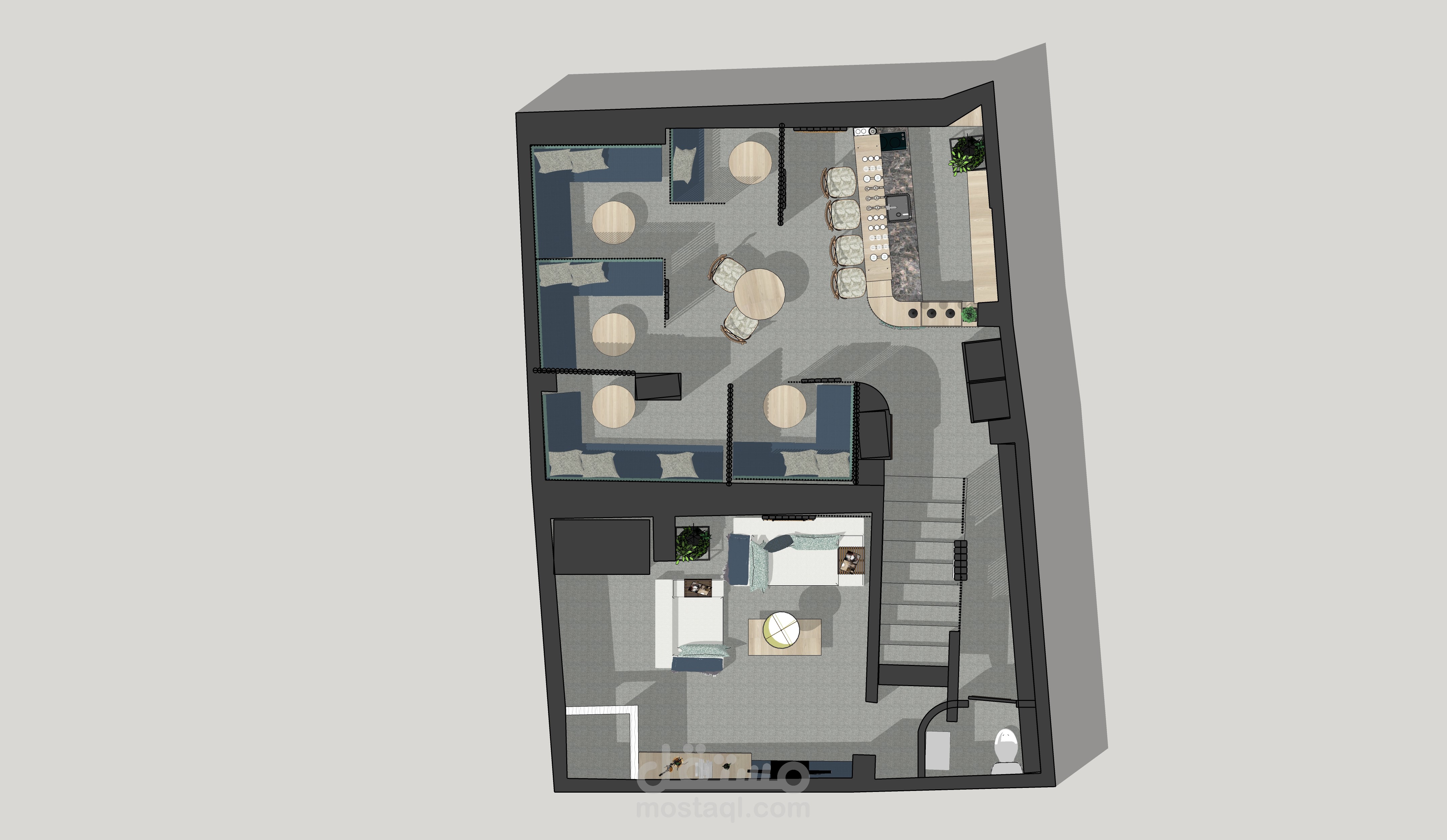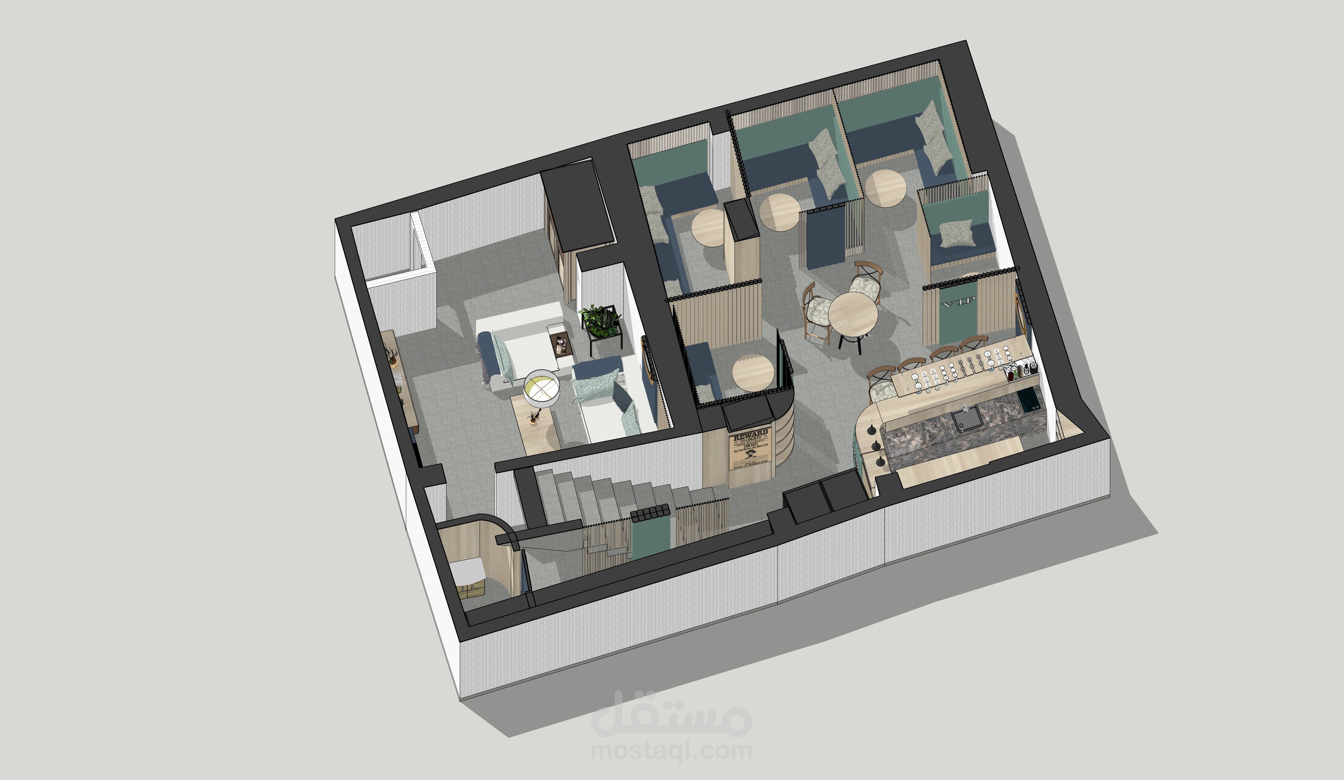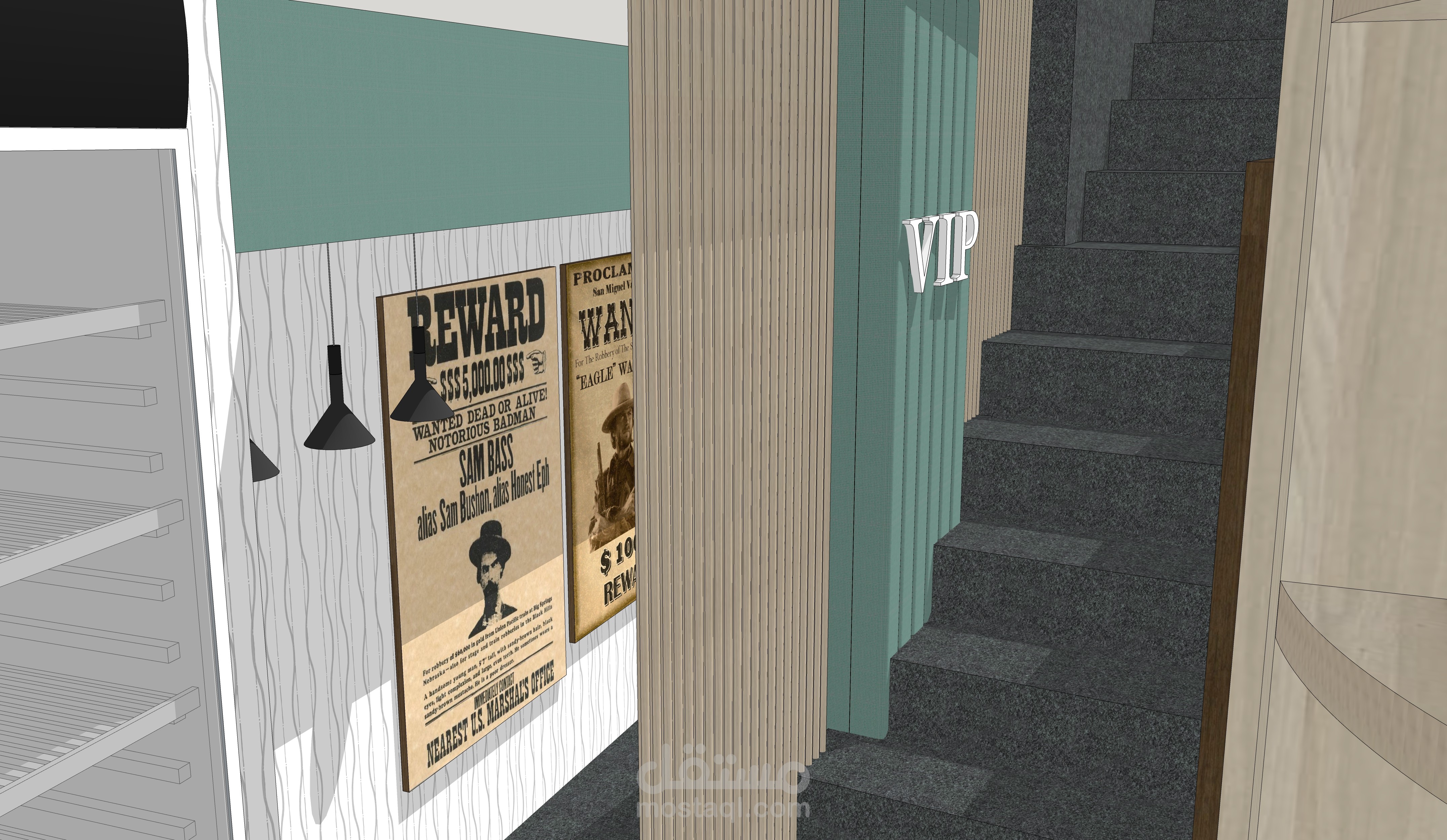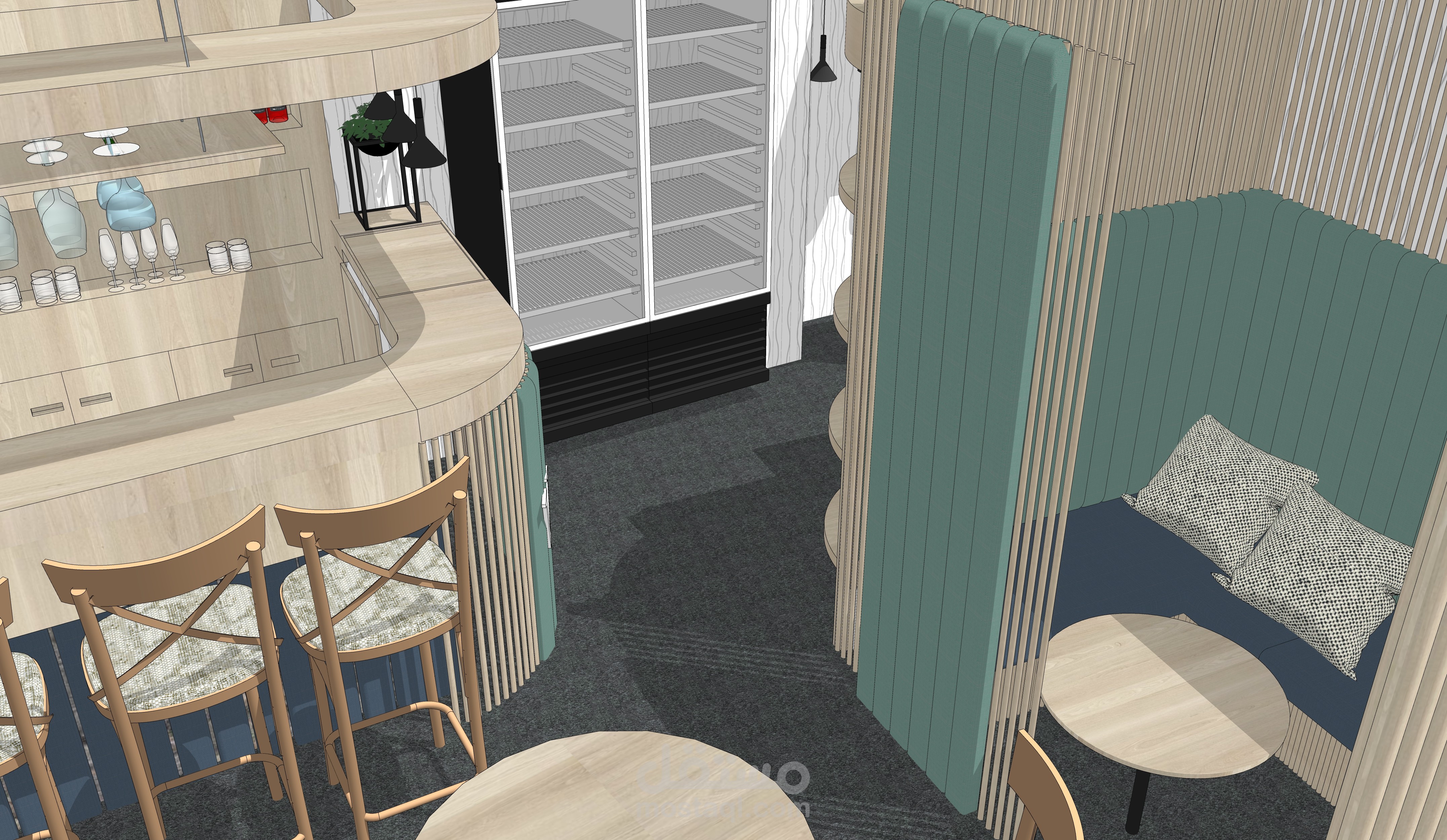 يوجد هذا المقهى في شارع العابد بدمشق.. في منطقة تعود لخمسينيات القرن الماضي, في منسوب القبو لأحد الأبنية , المساحة التقريبية 65 متر مربع و بارتفاع سقف 208 م . تم تصميم هذا المقهى بعد دراسة الموقع و المكان بعناية , على نمط الطراز الخمسيني و لكن بأساليب و حلول عصرية تناسب الموقع و حاجة الزبون.