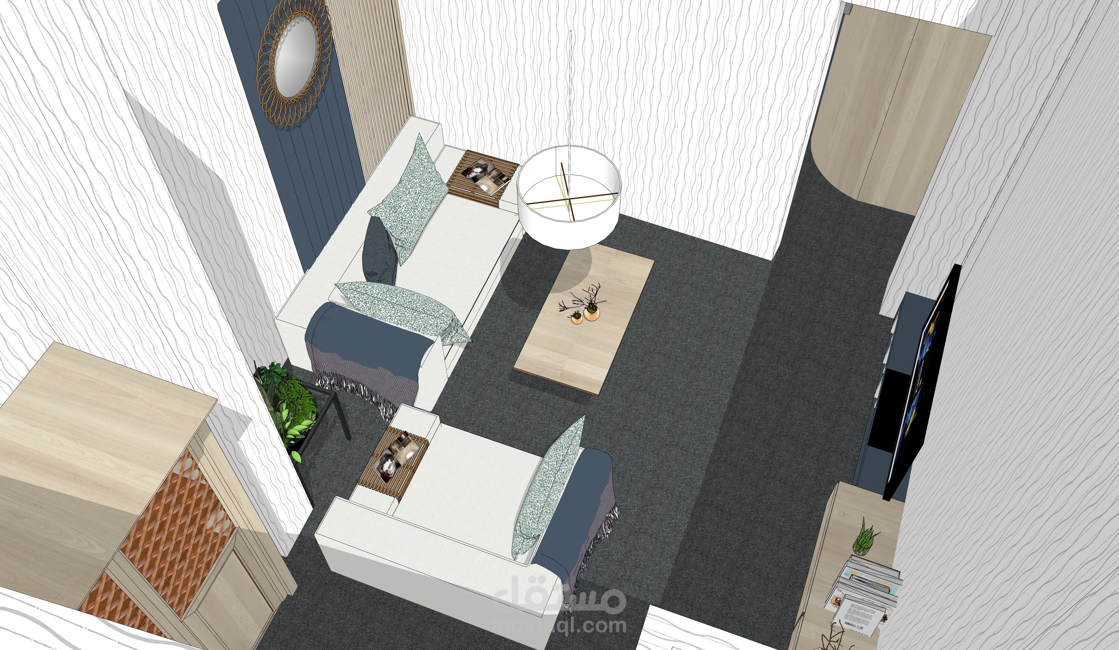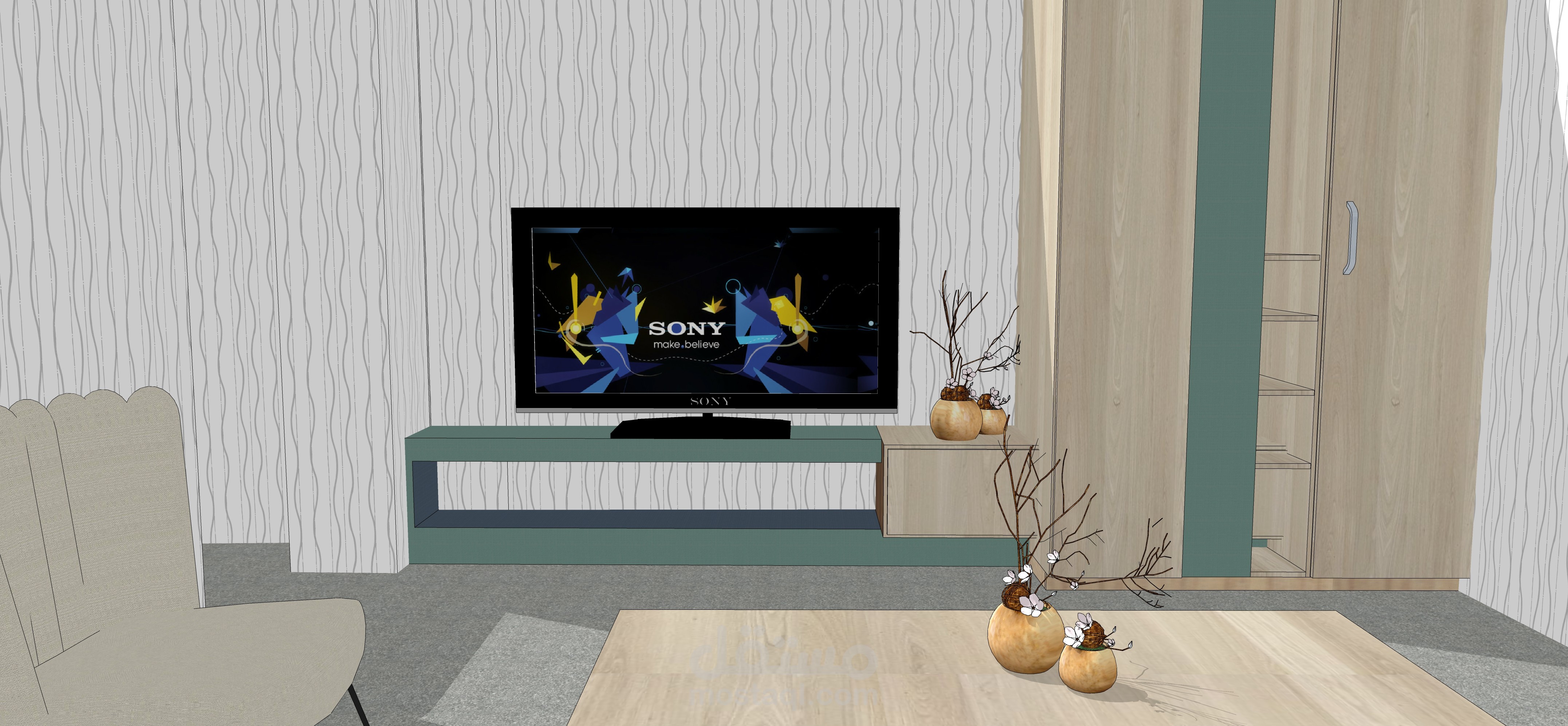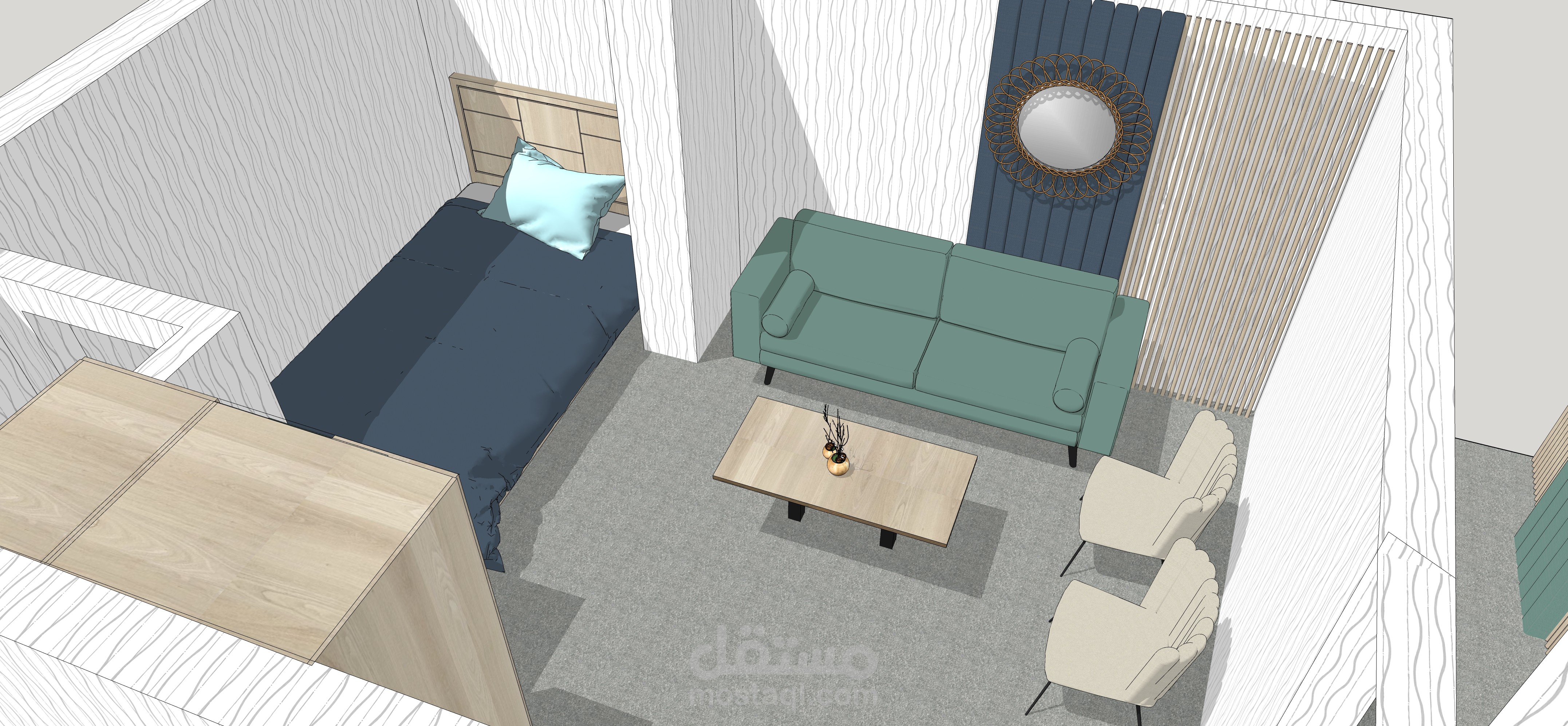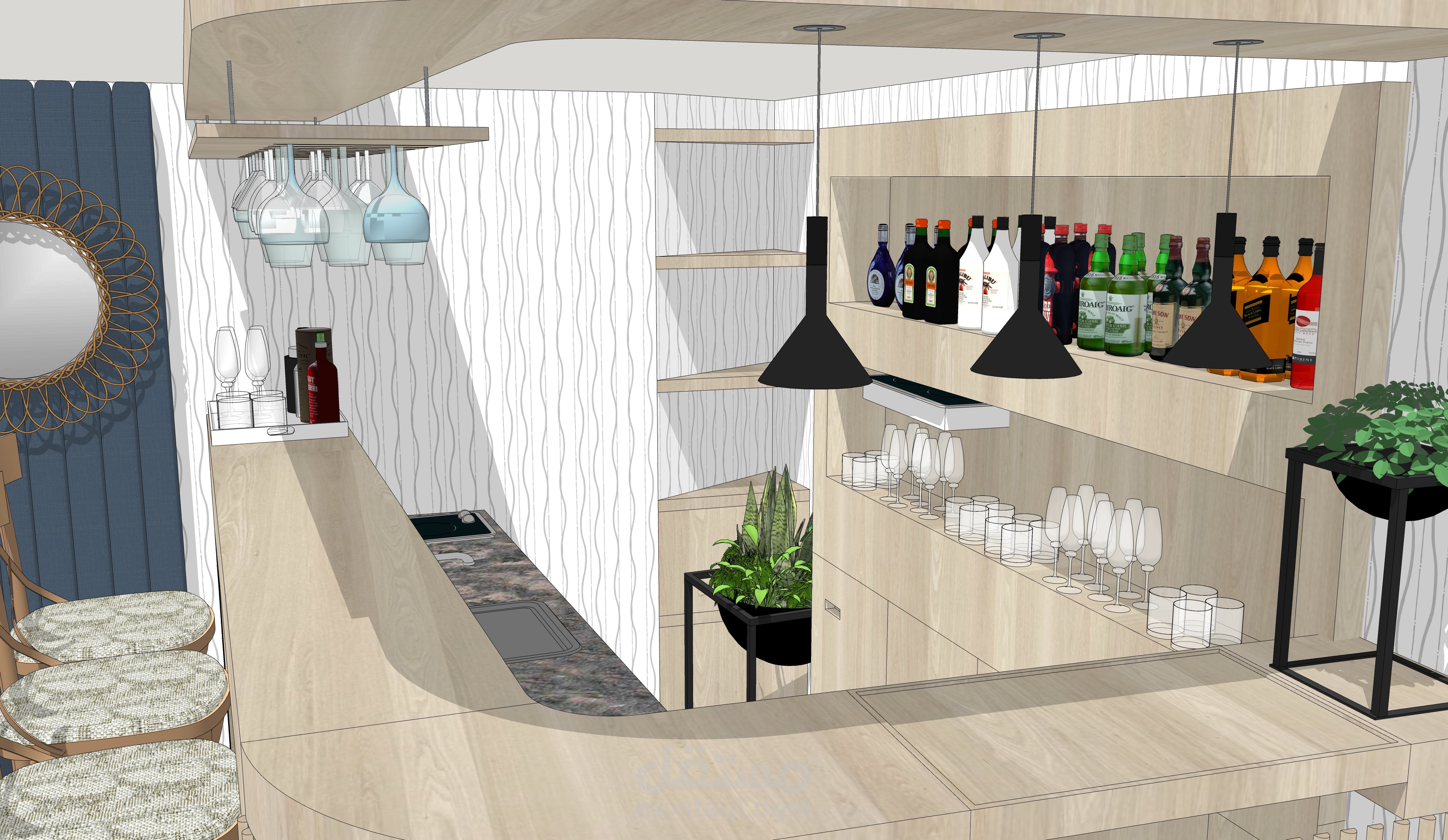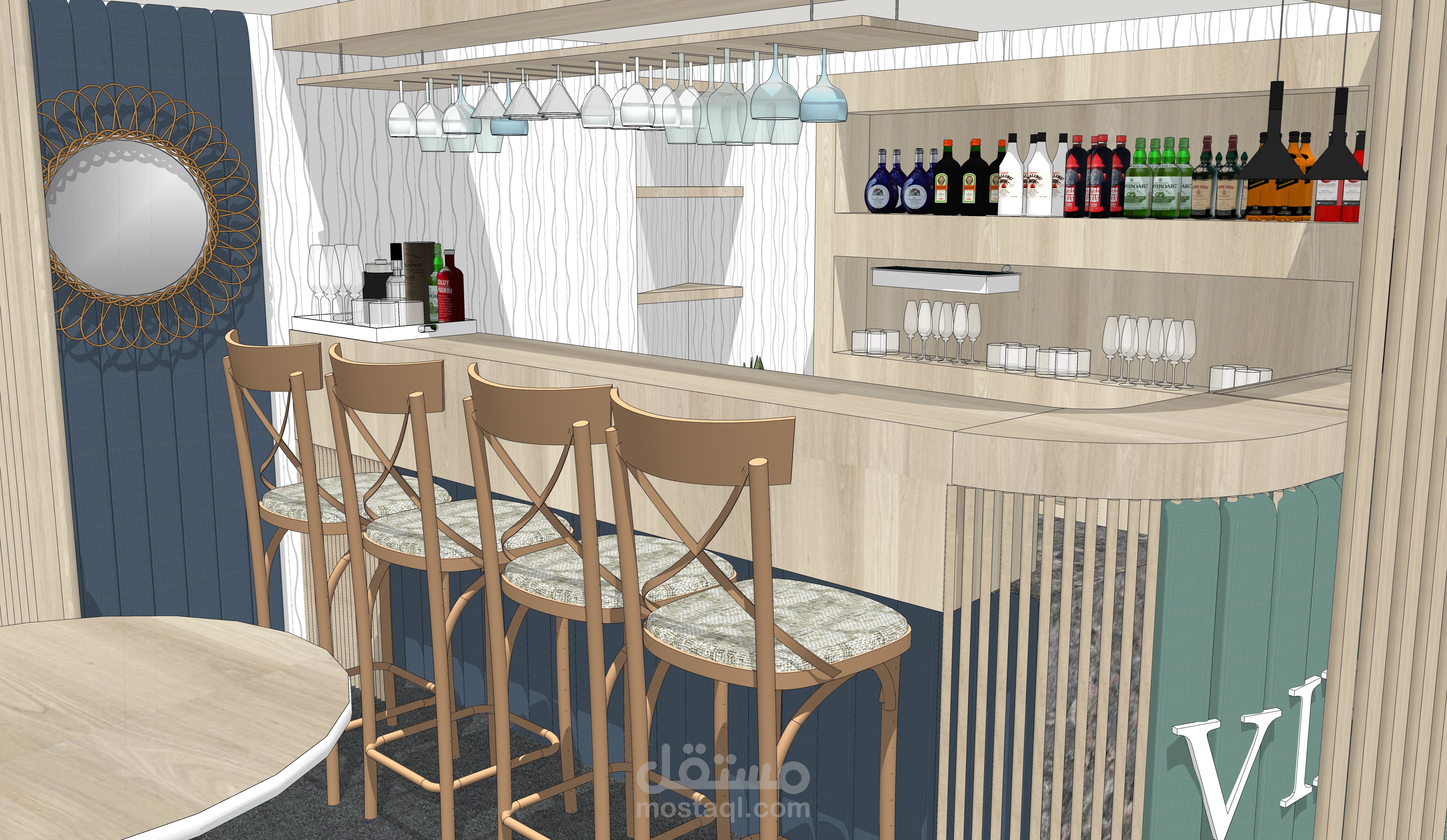 يوجد هذا المقهى في شارع العابد بدمشق.. في منطقة تعود لخمسينيات القرن الماضي, في منسوب القبو لأحد الأبنية , المساحة التقريبية 65 متر مربع و بارتفاع سقف 208 م . تم تصميم هذا المقهى بعد دراسة الموقع و المكان بعناية , على نمط الطراز الخمسيني و لكن بأساليب و حلول عصرية تناسب الموقع و حاجة الزبون.