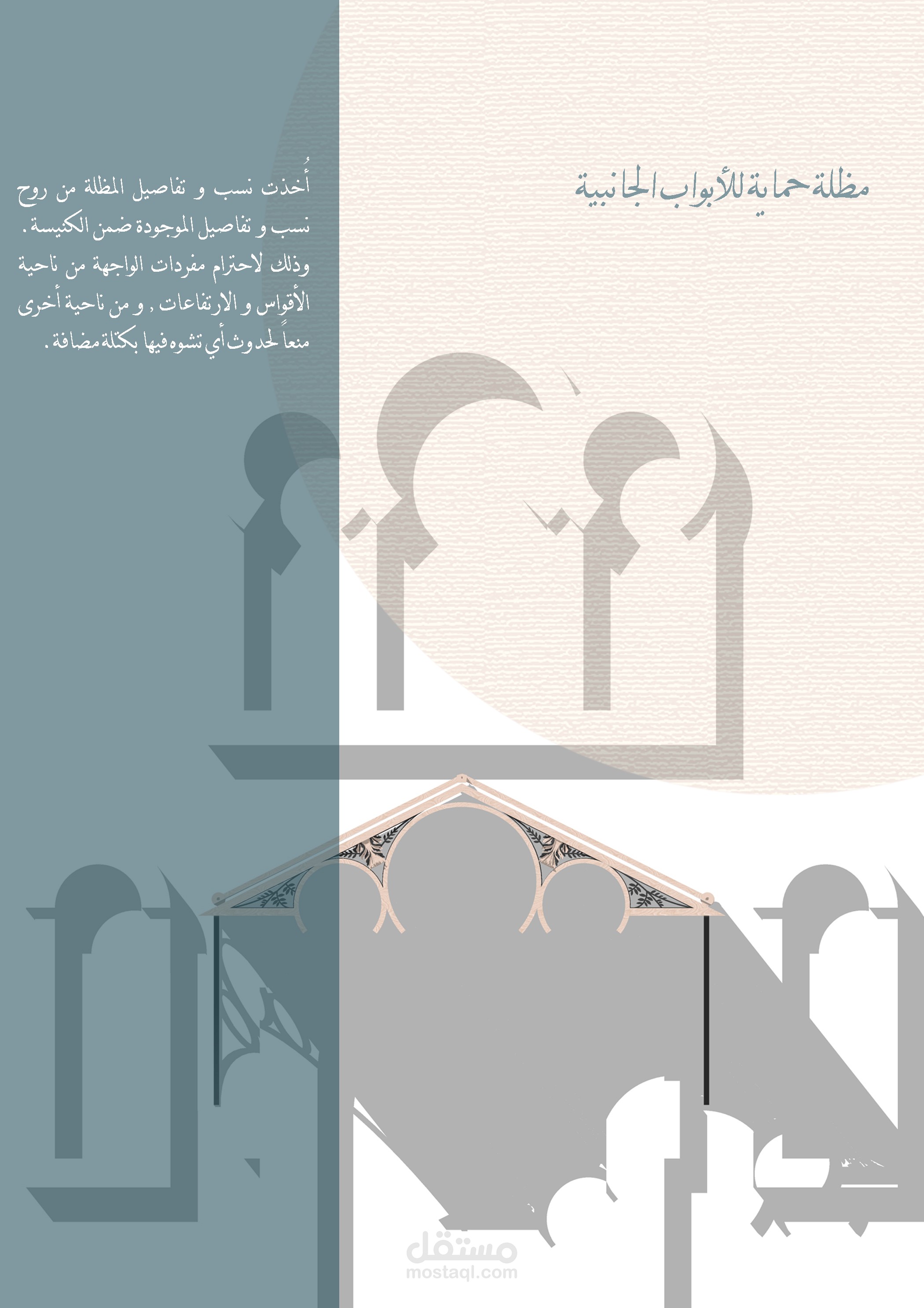 أُخذت نسب و تفاصيل المظلة من روح نسب و تفاصيل الموجودة ضمن الكنيسة. وذلك لاحترام مفردات الواجهة من ناحية الأقواس و الارتفاعات , و من ناحية أخرى منعاً لحدوث أي تشوه فيها بكتلة مضافة.