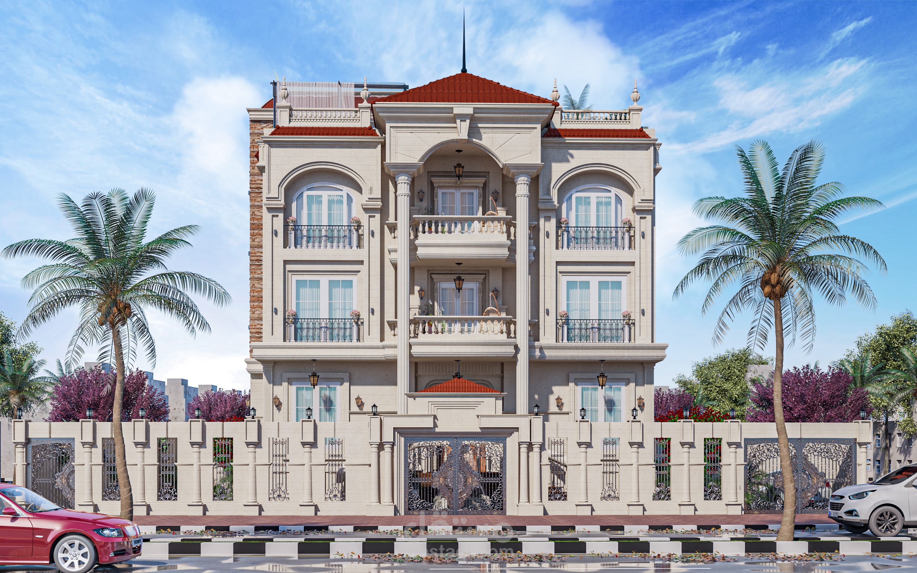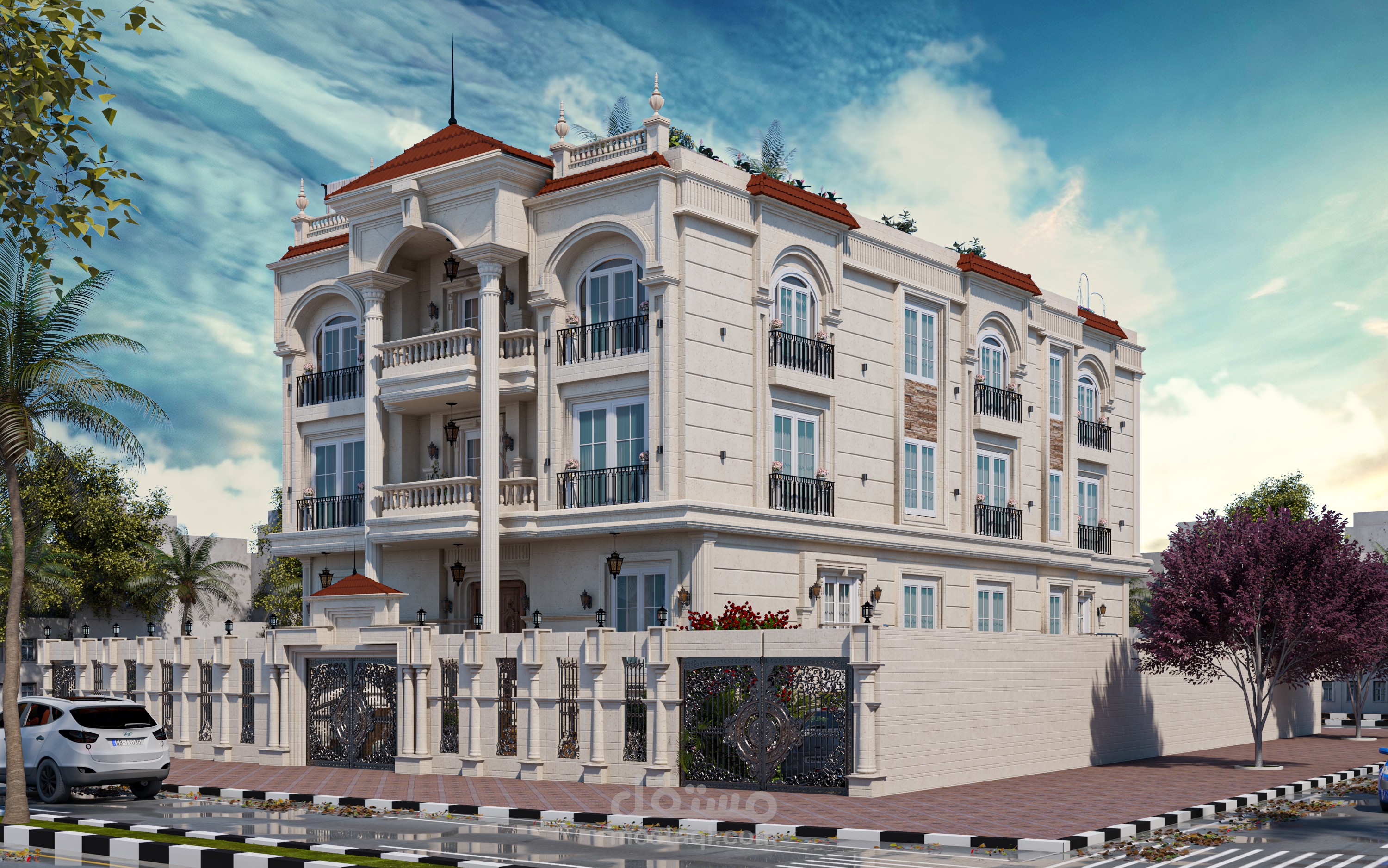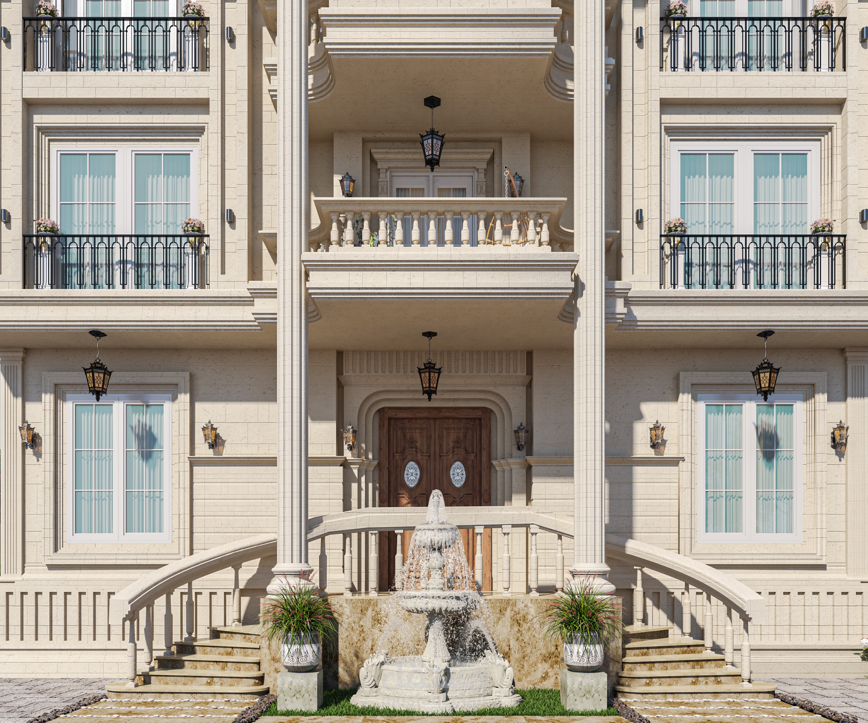 تصميم الفيلا بإستايل نيو كلاسيك لعميل سعودي حيث يجمع التصميم بين البساطه والجمال والتميز ويبرز الجمال عن طريق مزج مواد التشطيب بين حجر الهاشمي والدهانات وحجر المايكا