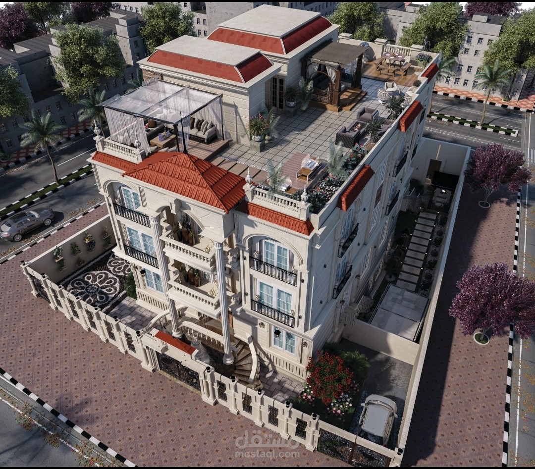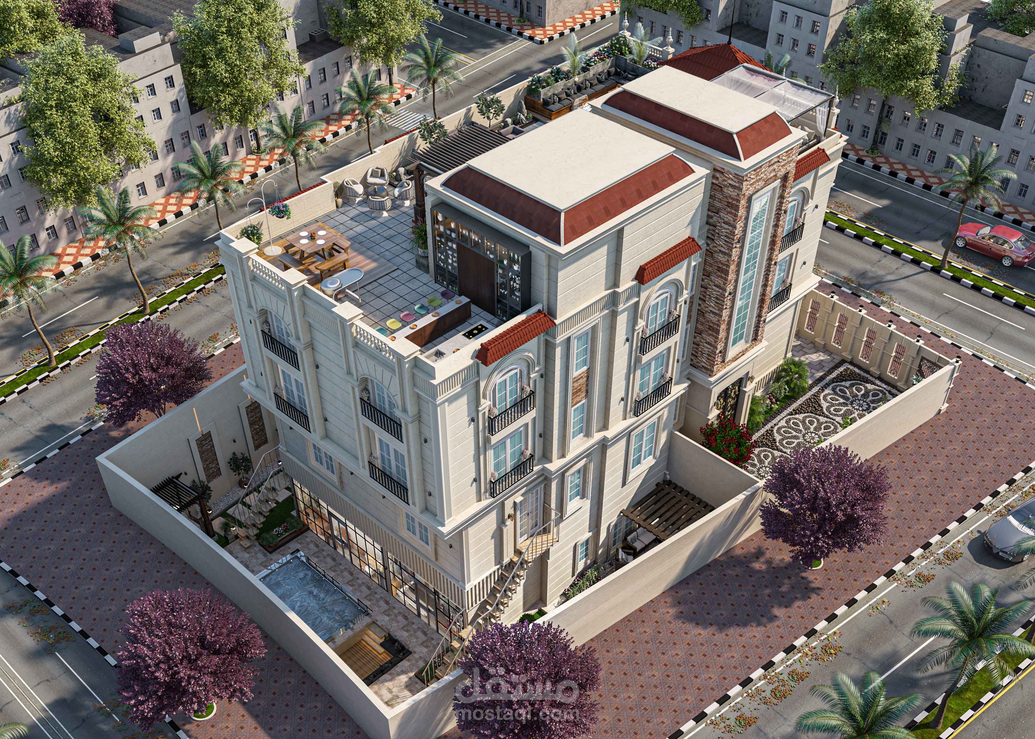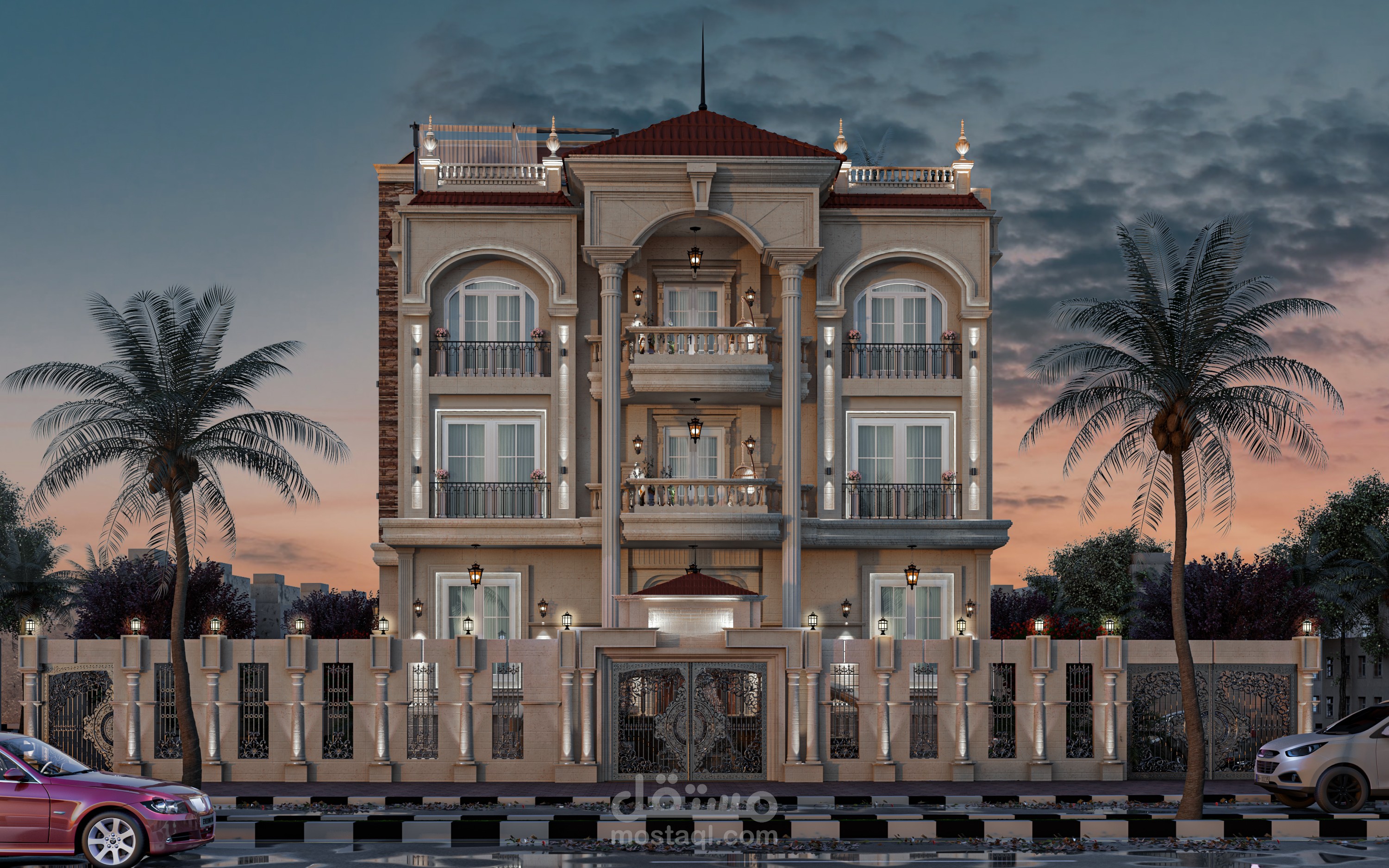 تصميم الفيلا بإستايل نيو كلاسيك لعميل سعودي حيث يجمع التصميم بين البساطه والجمال والتميز ويبرز الجمال عن طريق مزج مواد التشطيب بين حجر الهاشمي والدهانات وحجر المايكا