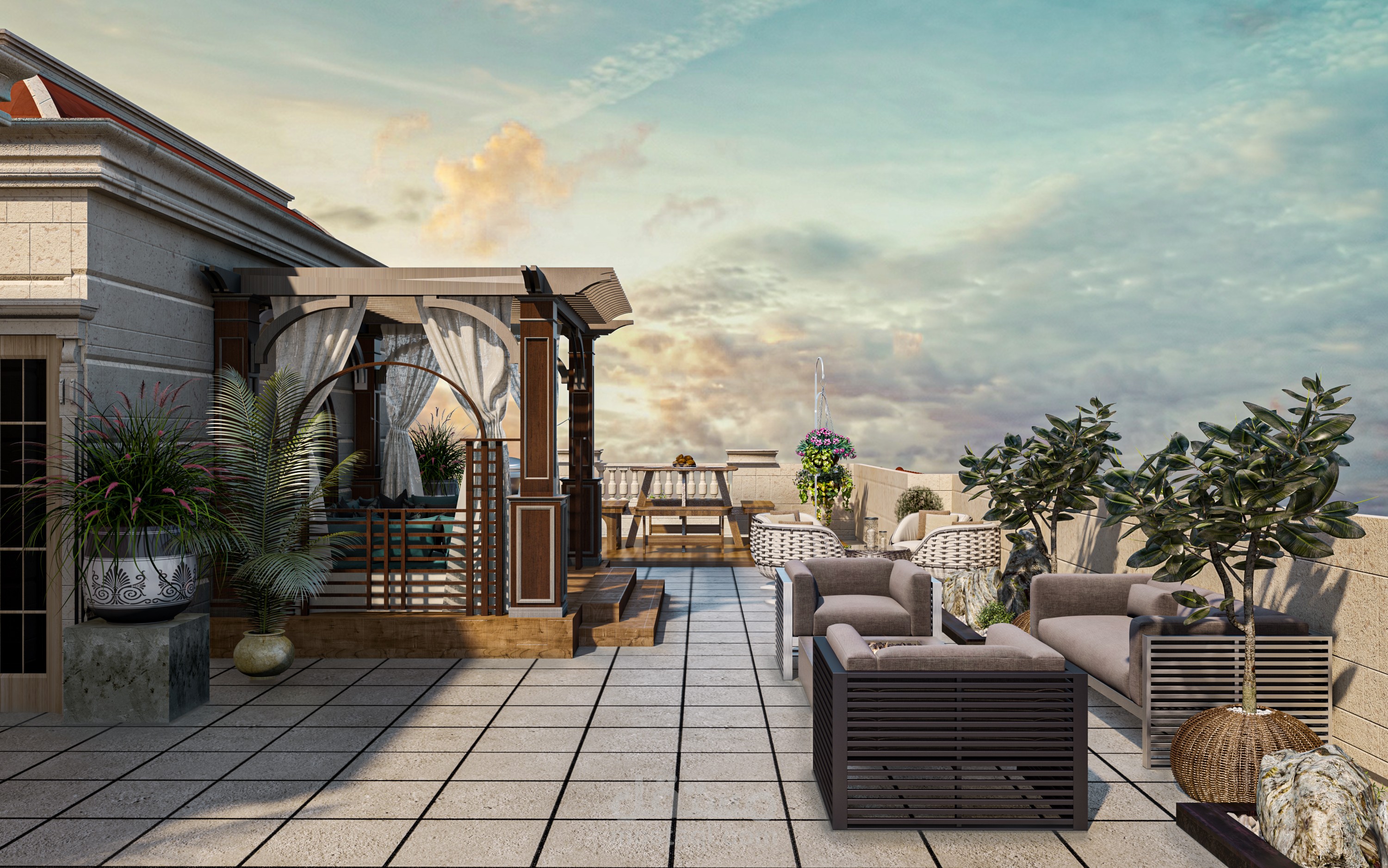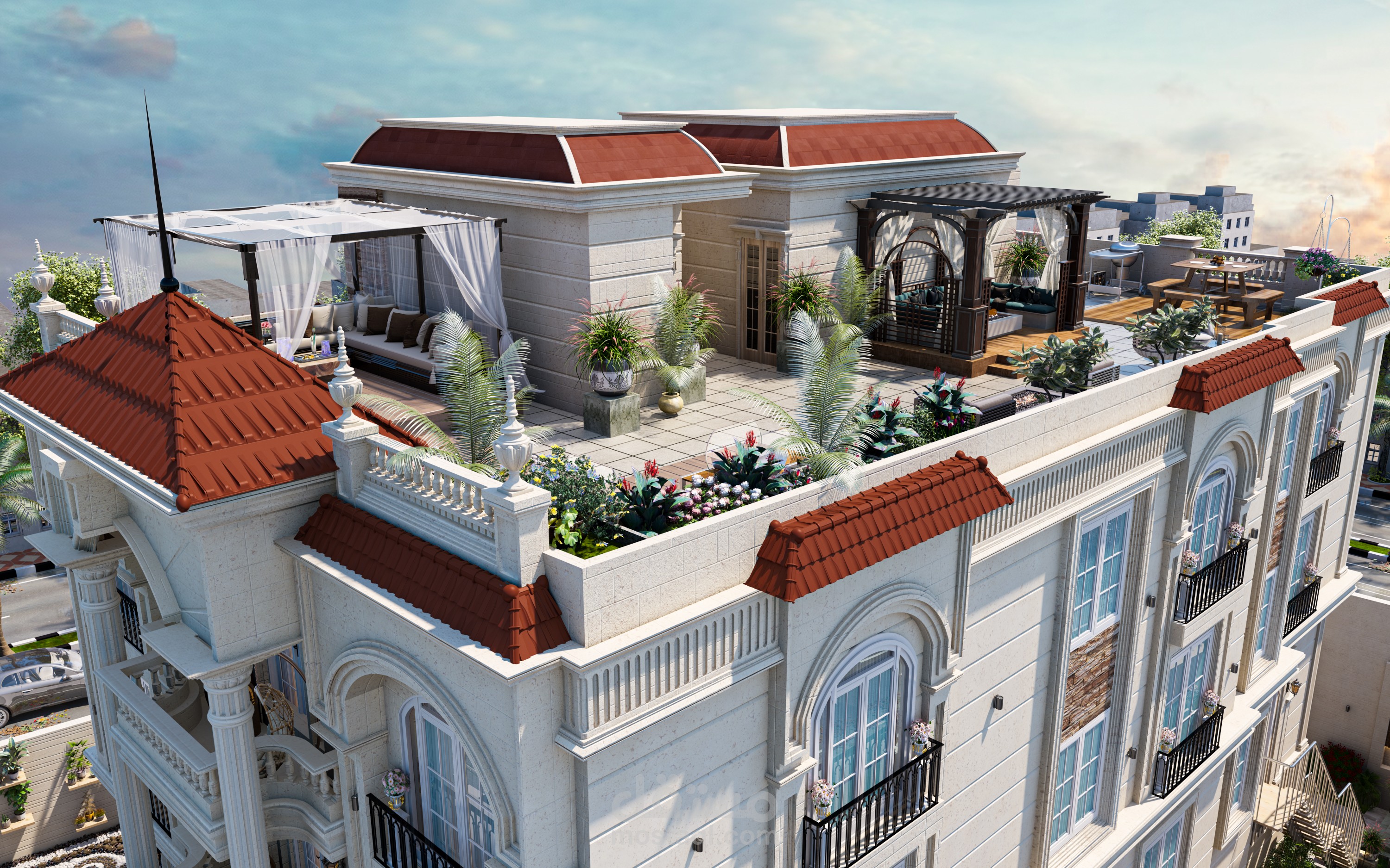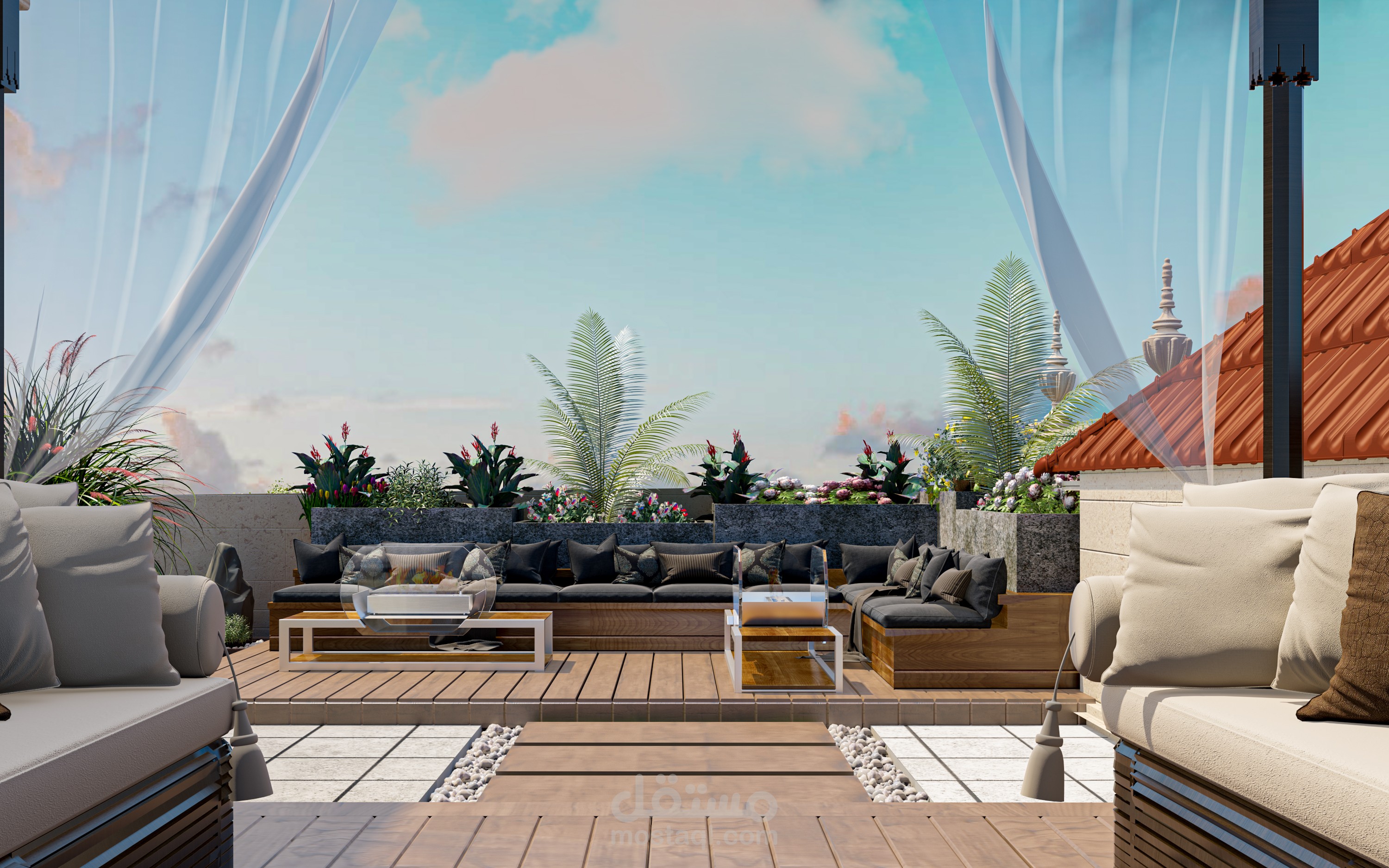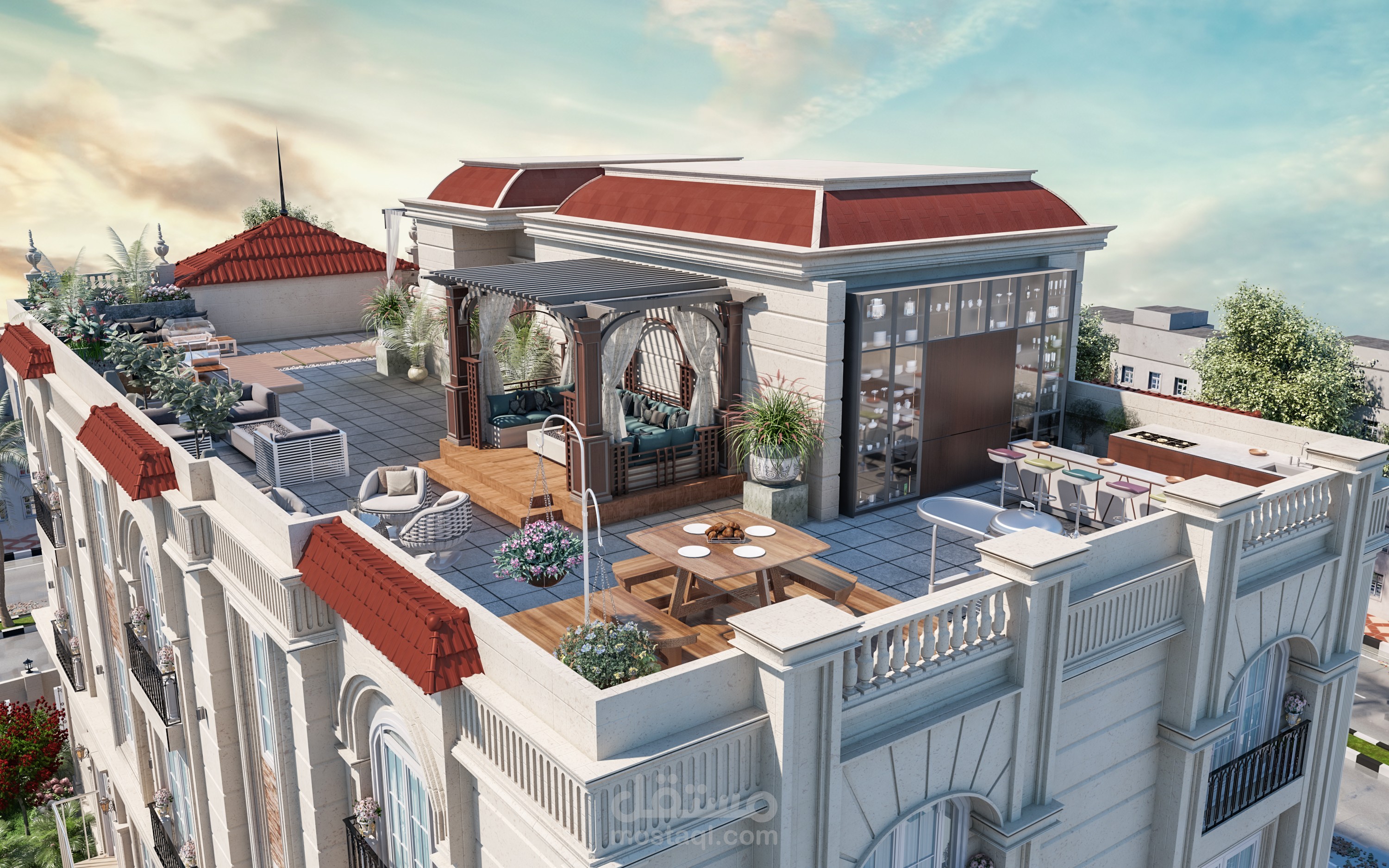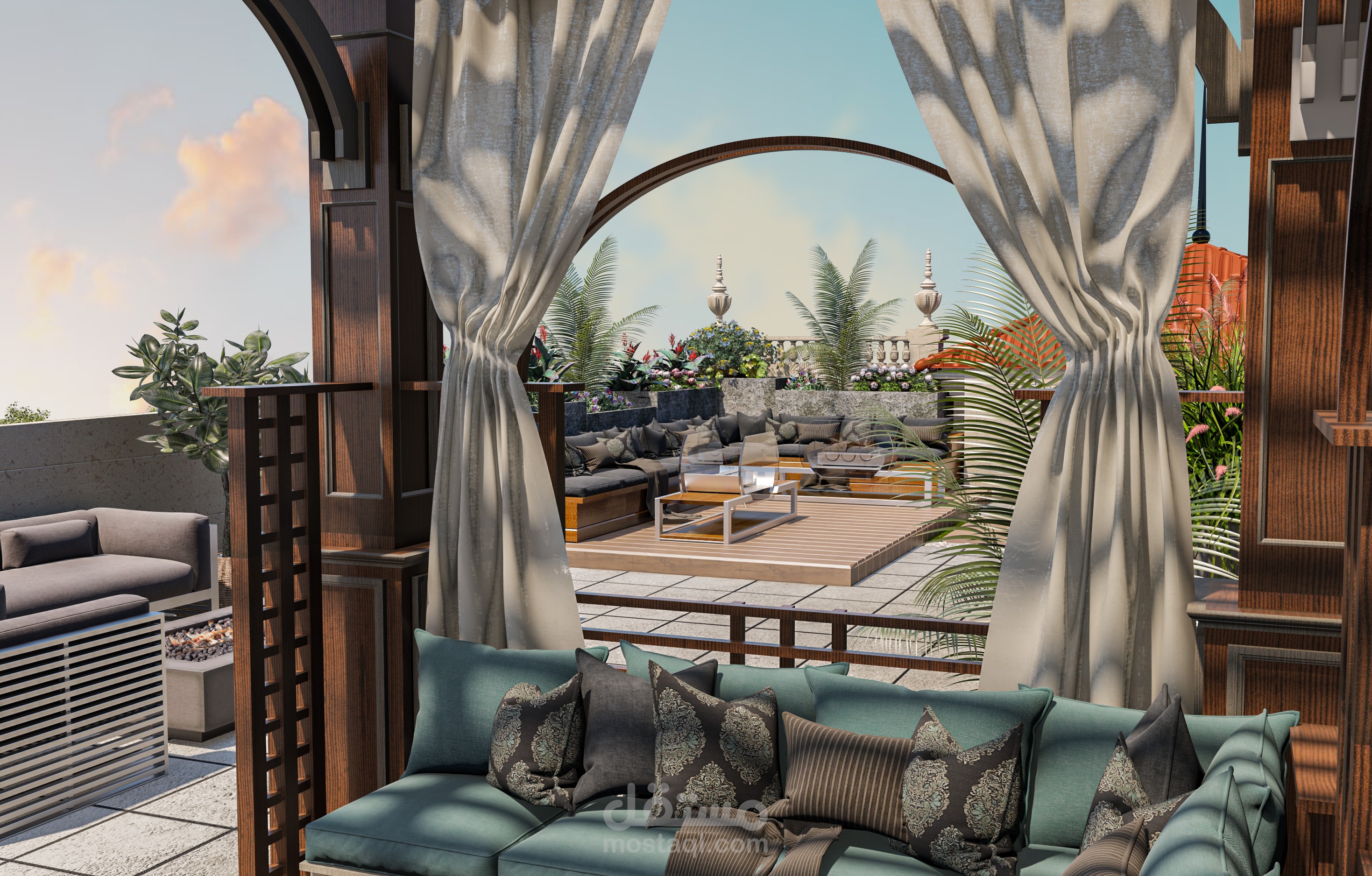 تم استغلال السطح لعمل برجولا ومكان مكشوف للجلوس ومطبخ صغير Open air