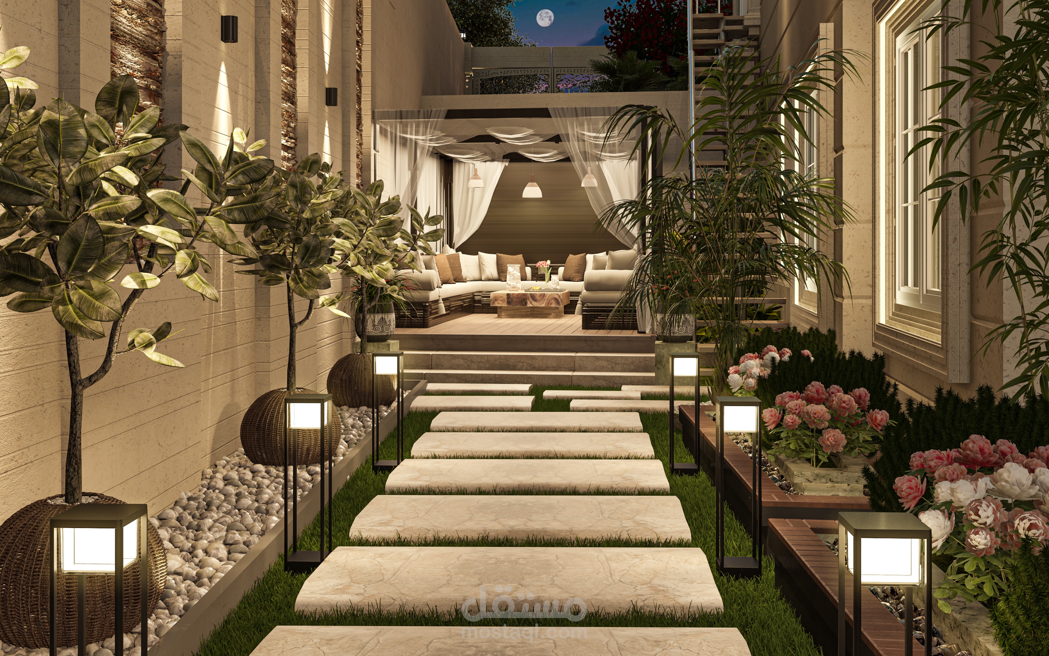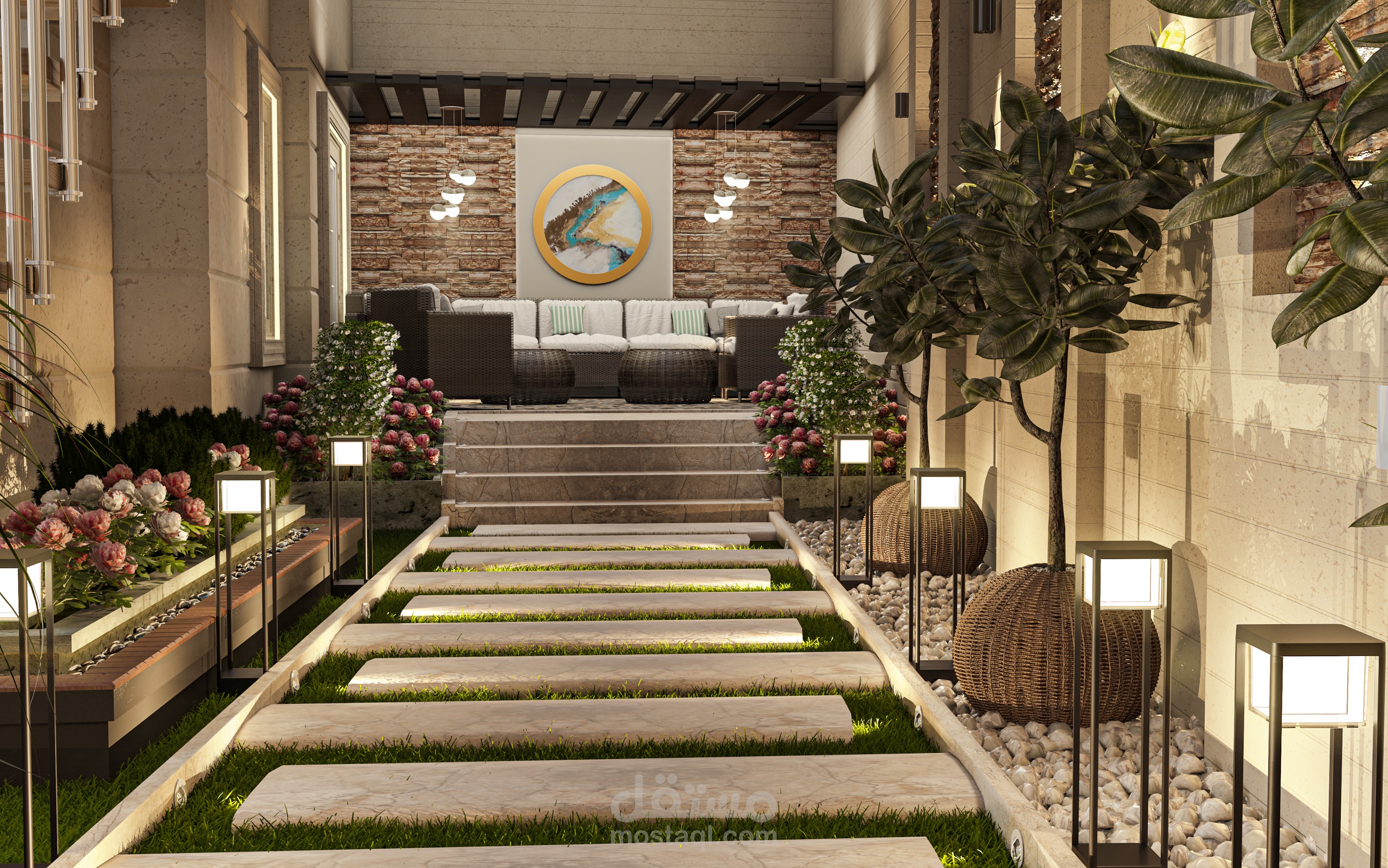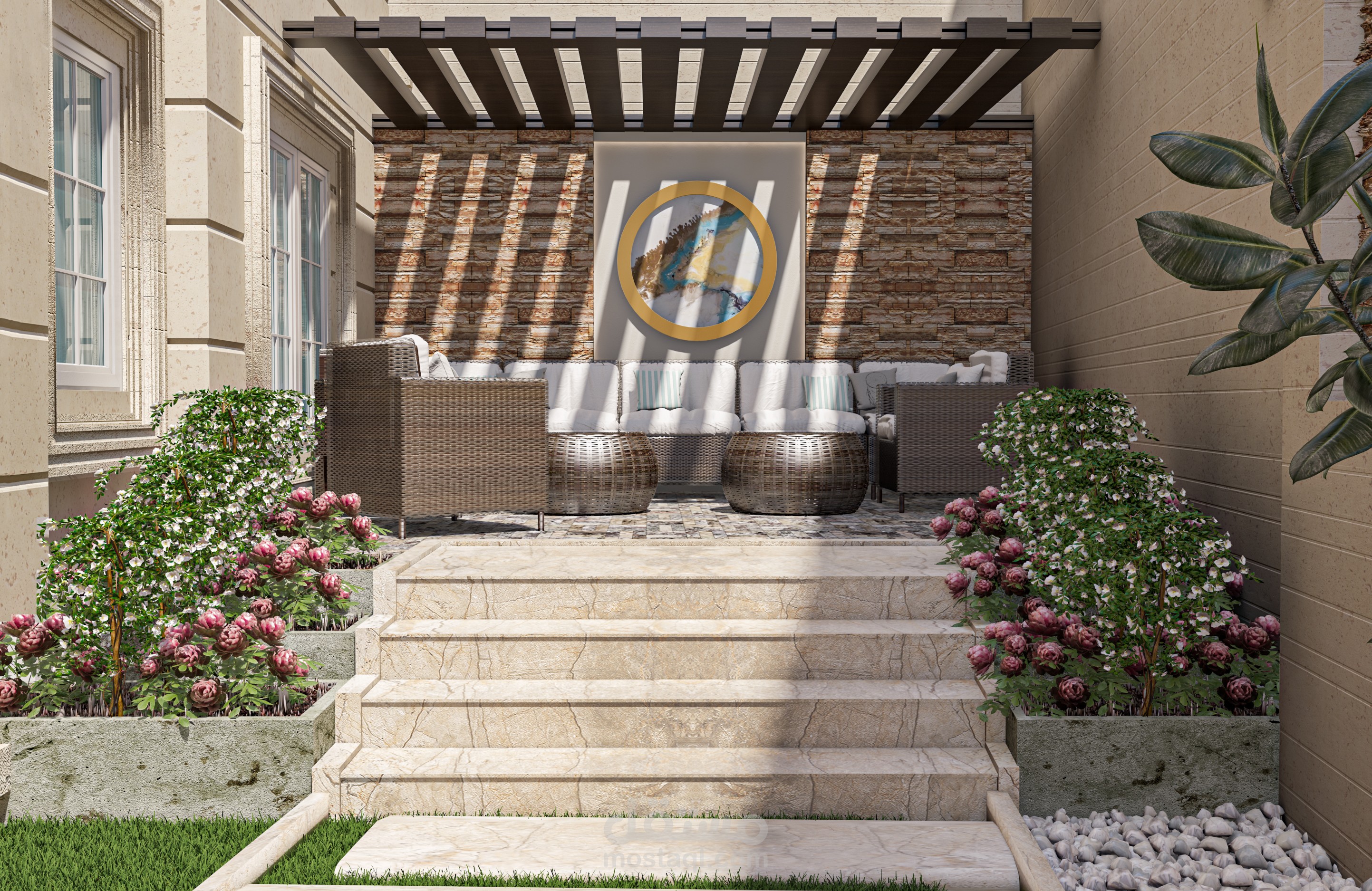 تم تصميم الحديقه علي مستويين حيث يحقق الخصوصيه الكبيره لحمام السباحه ومكان للشوي (Barbecue) ودمج بين الهارد السكيب والزرع وعمل مدخل البيت بالفسيفساء بتصميم فريد