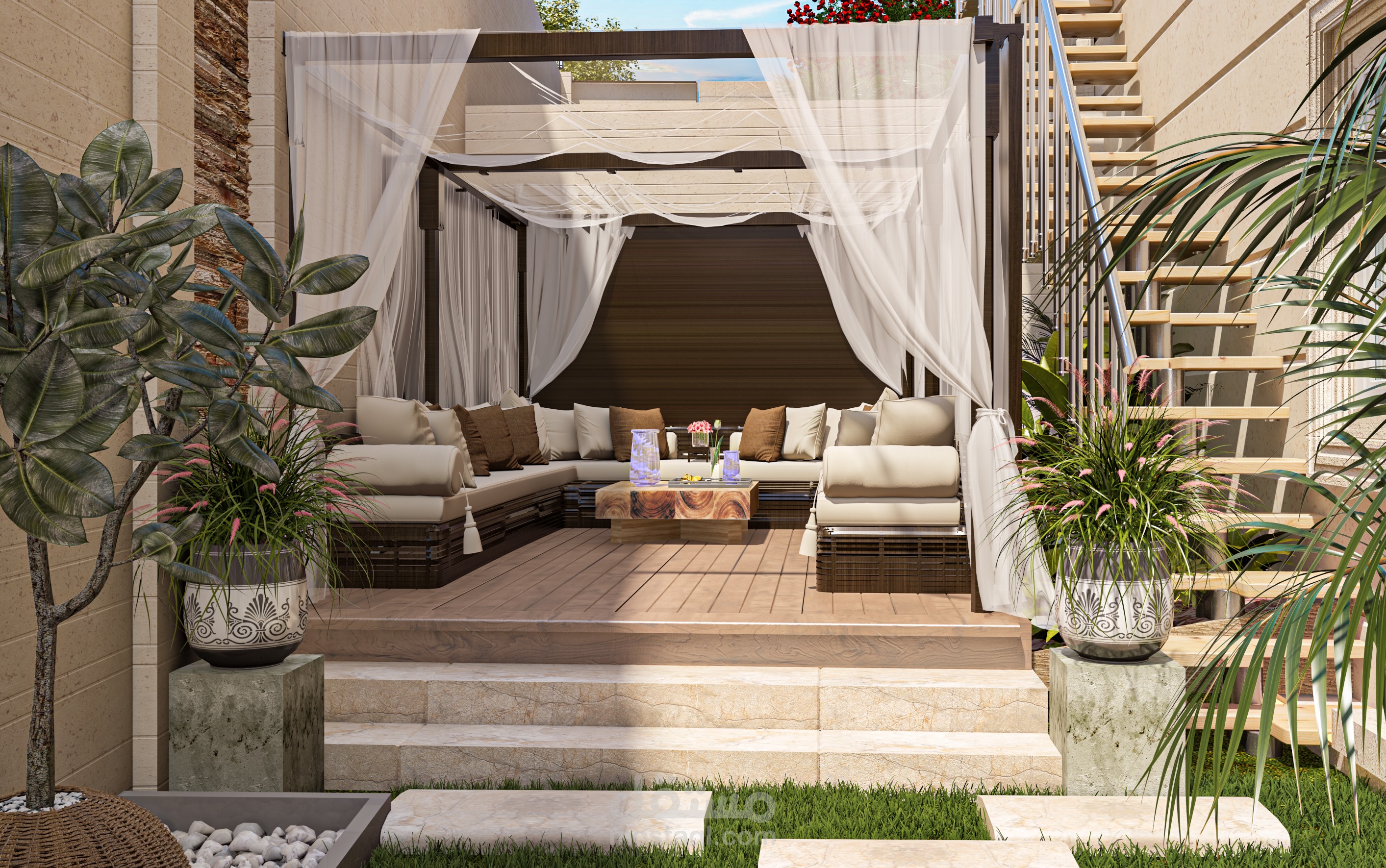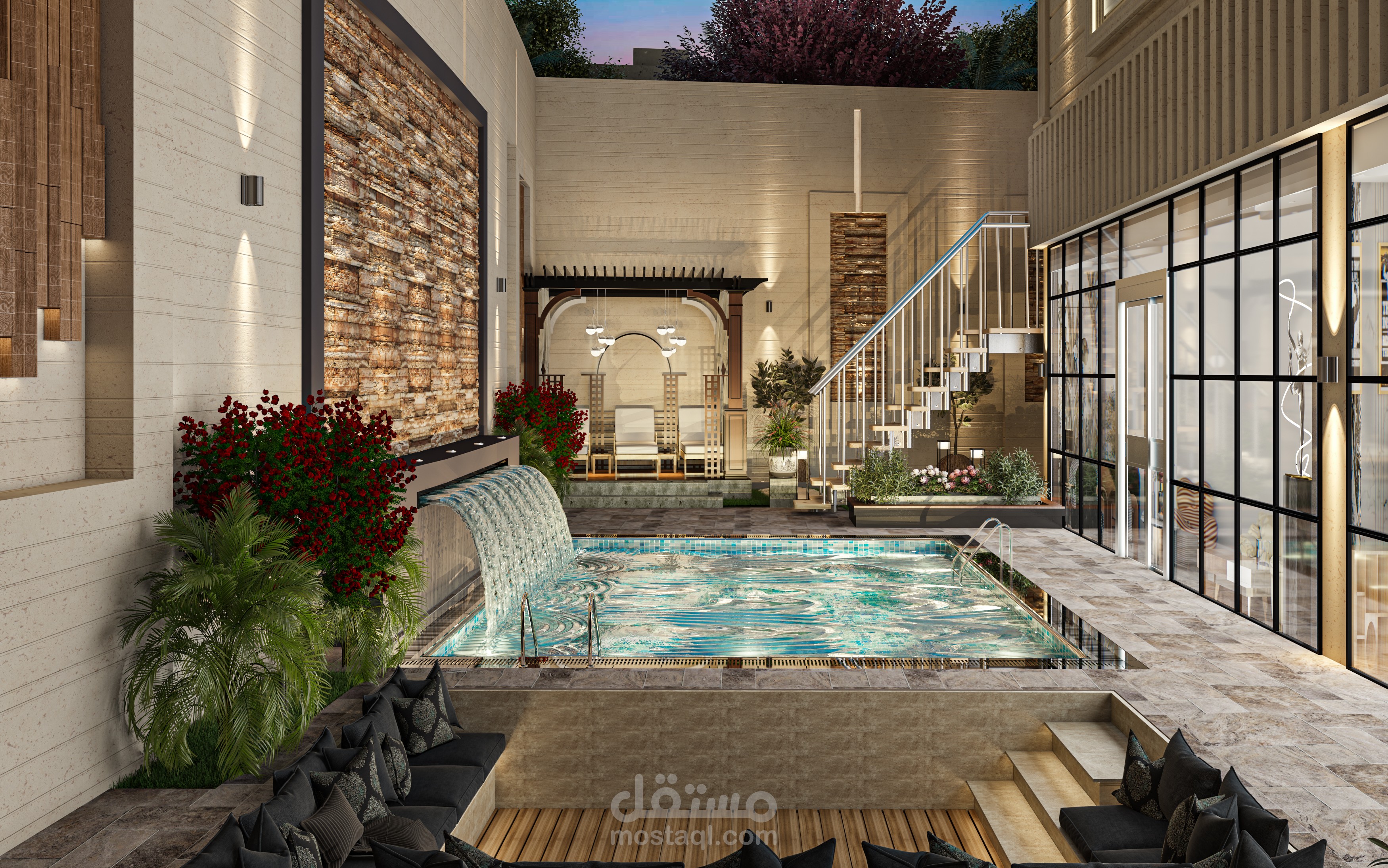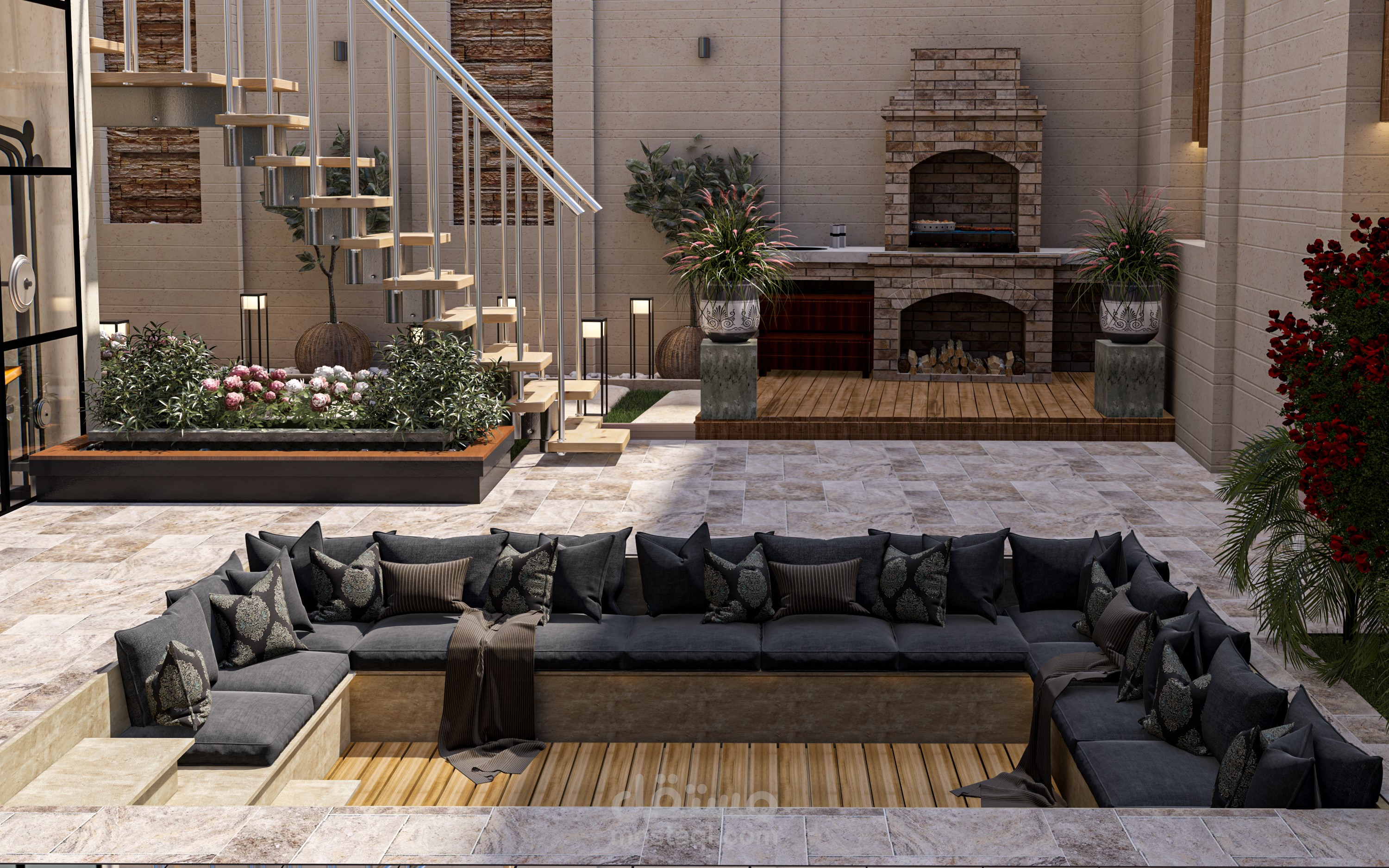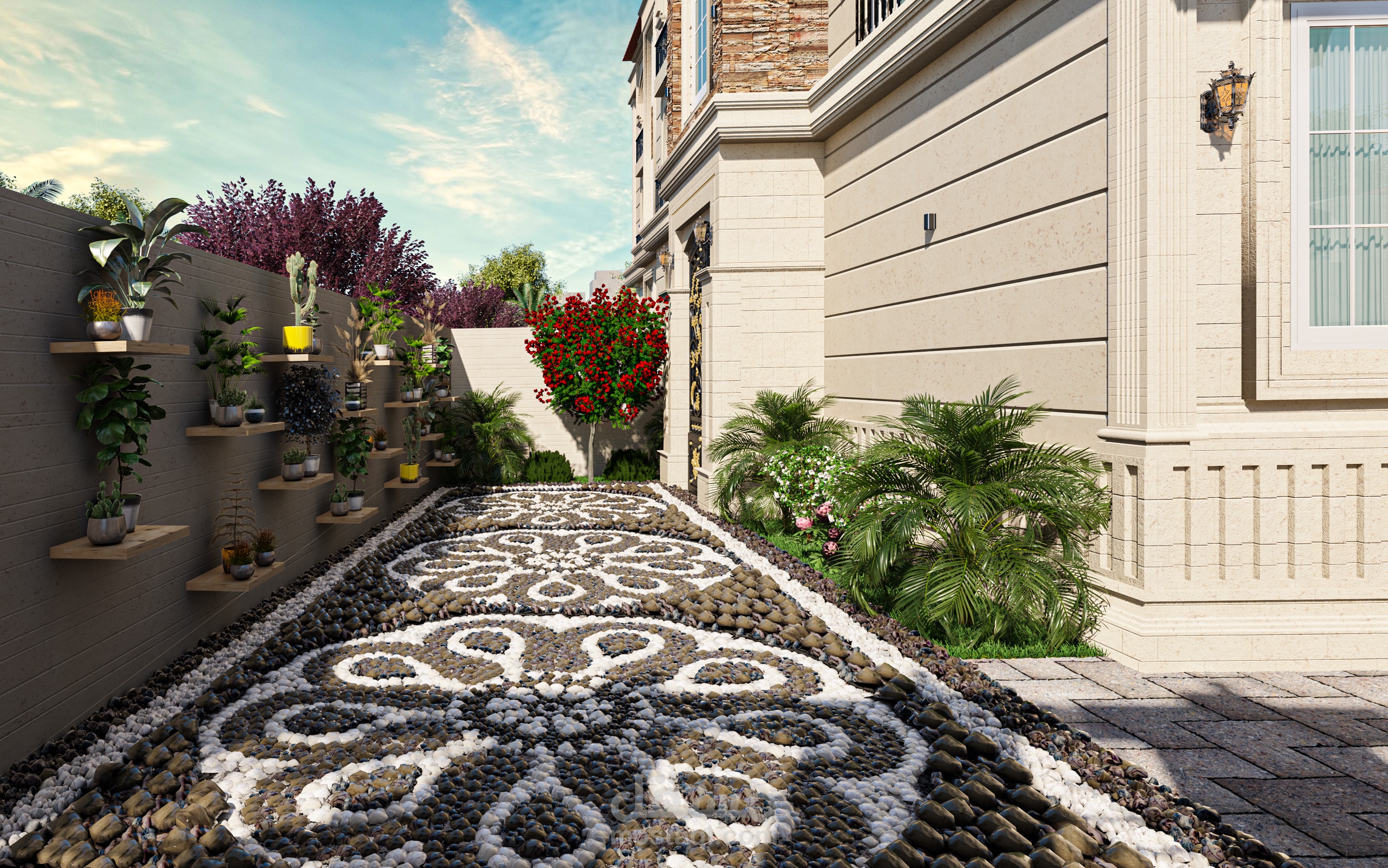 تم تصميم الحديقه علي مستويين حيث يحقق الخصوصيه الكبيره لحمام السباحه ومكان للشوي (Barbecue) ودمج بين الهارد السكيب والزرع وعمل مدخل البيت بالفسيفساء بتصميم فريد
