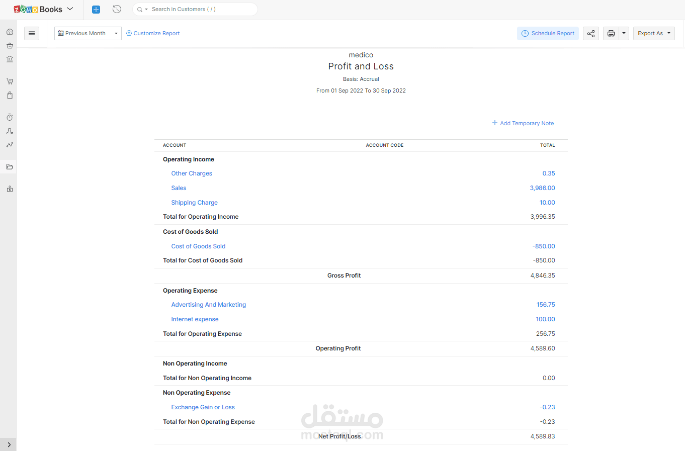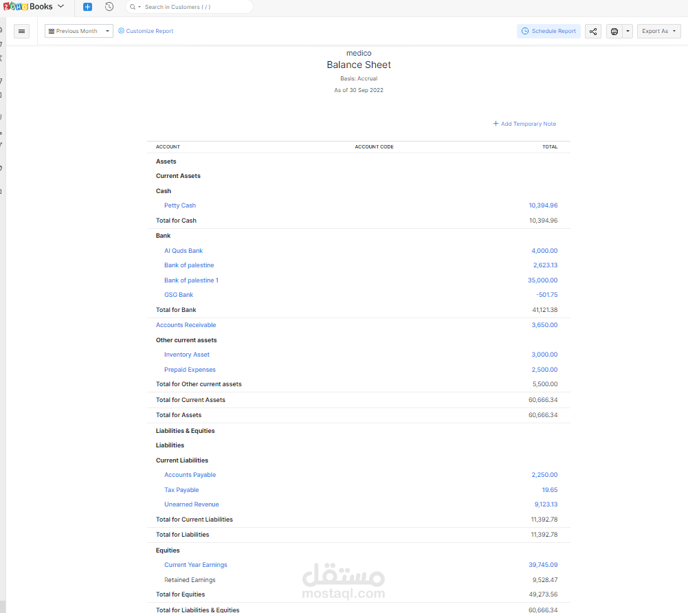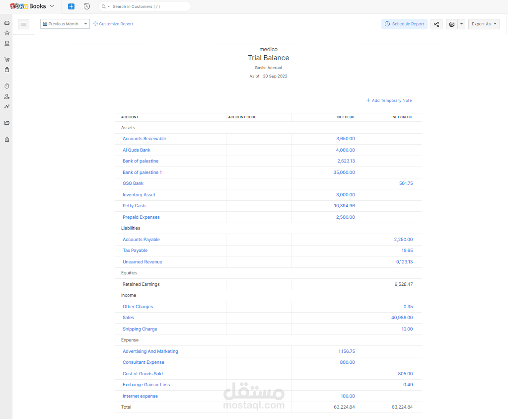 لقد قمت بإنشاء شركة افتراضية على برنامج Zohobooks وأجريت فيها العديد من العمليات المالية واستخرجت التقارير المرفقة أعلاه.