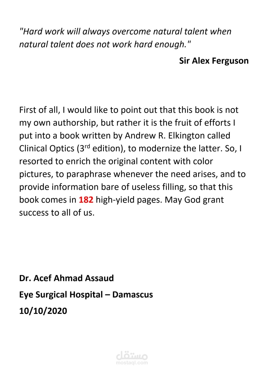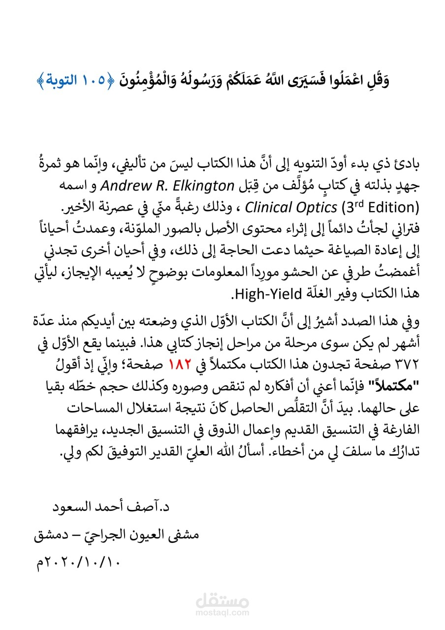 قمت بإعادة إخراج كتاب Elkington 1997 ليصبح أكثر سهولة وفائدةً لطلّاب الطبّ وطلّاب العلوم البصريّة وأطبّاء العيون والزملاء العاملين في مجال البصريّات.. وقد حقّق غايته بفضل الله وأصبح المرجع الأوّل في دراسة علم البصريّات والتحضير للامتحانات ذات الصلة (البورد السوريّ في طبّ العيون - البورد العربيّ في طبّ العيون - الزمالات البريطانيّة في طبّ العيون).