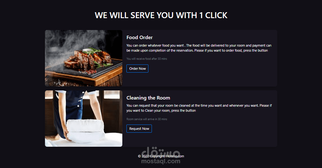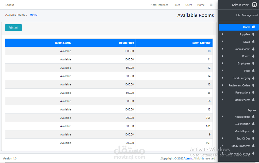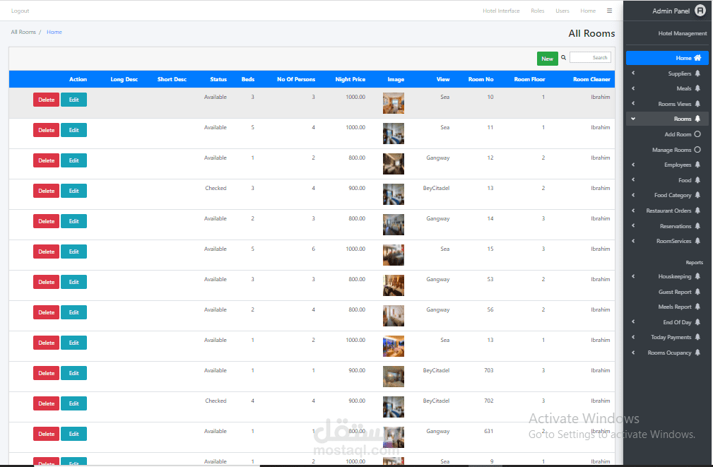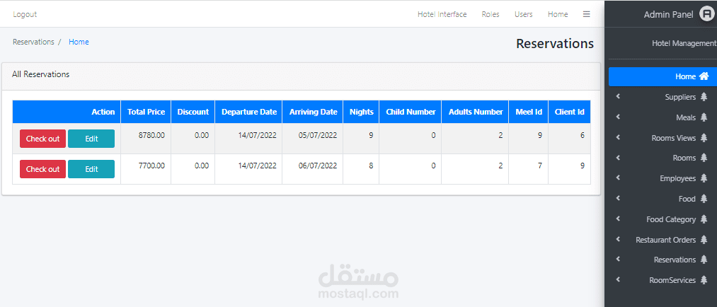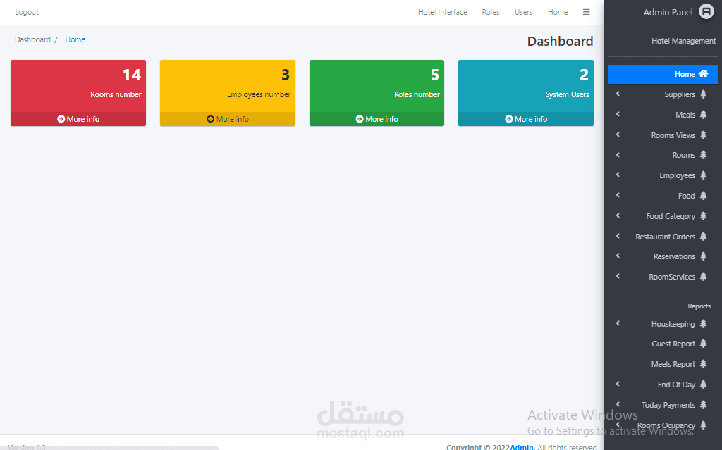 هذا نظام ادارة فنادق لقد قمت بانشاءه بالكامل في مشروع تخرجي . هذا النظام يمكن ادارة الفندق من التعامل مع جميع الانشطة الخاصى بالفندق من حيث ادارى الموظفين والاكل والنزلاء ويتيح ايضا للنزلاء بطلب الاكل بنفسهم الي غرفتهم او طلب تنظيف الغرفة في الوقت الذي يريد. النظام يخصص لكل مستخدم صلاحيات خاصة به. حيث ان لكل مستخدم وظيفة في الموقع لا يمكن لكل المستخدمين ان يدخلوا جميع الصفحات