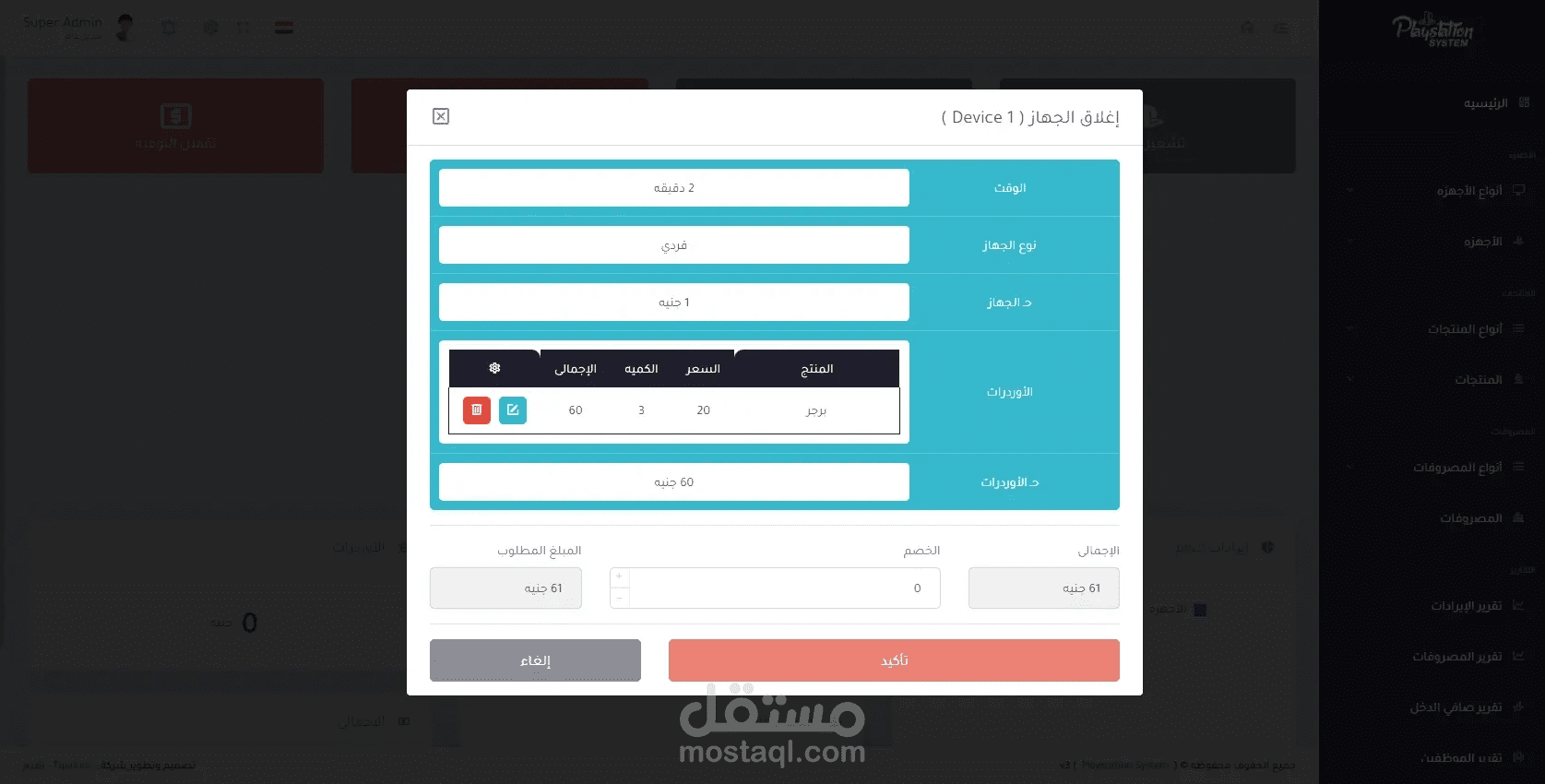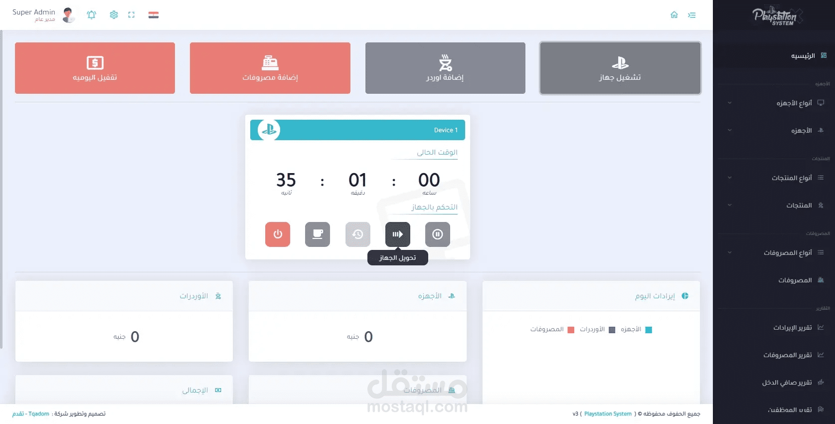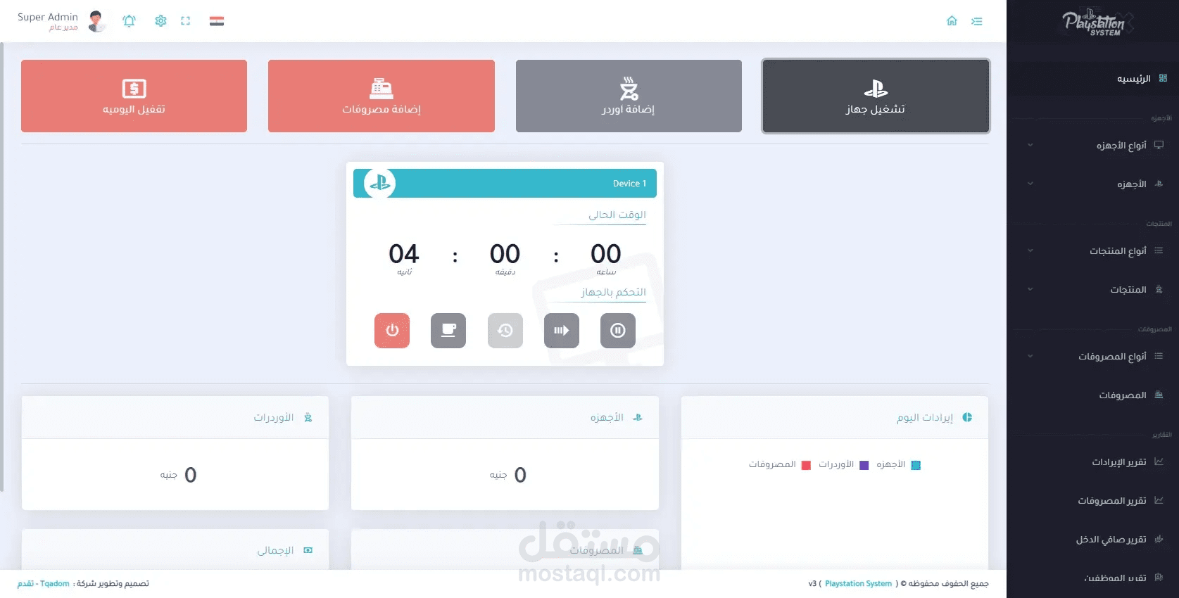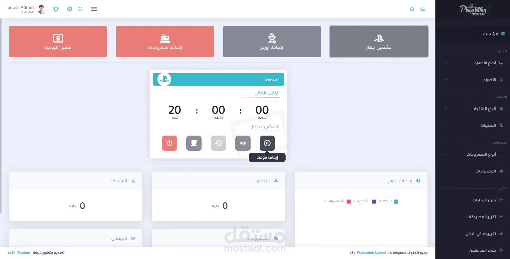 برنامج خاص بإدارة صالات ومحلات البلايستيشن يقوم البرنامج بالعديد من المميزات ومن اهمها هي فصل الأجهزه عن بعضها البعض والتنبيه بالإنذار عند انتهاء وقت الجهاز وإضافة الطلبات من مأكولات ومشروبات على حساب الجهاز ثم إنشاء فاتوره لكل جهاز لطباعتها ويمكنة ايضاً إعطائك جميع حسابات المشروع من إيرادات ومصروفات وصافي دخل المشروع .