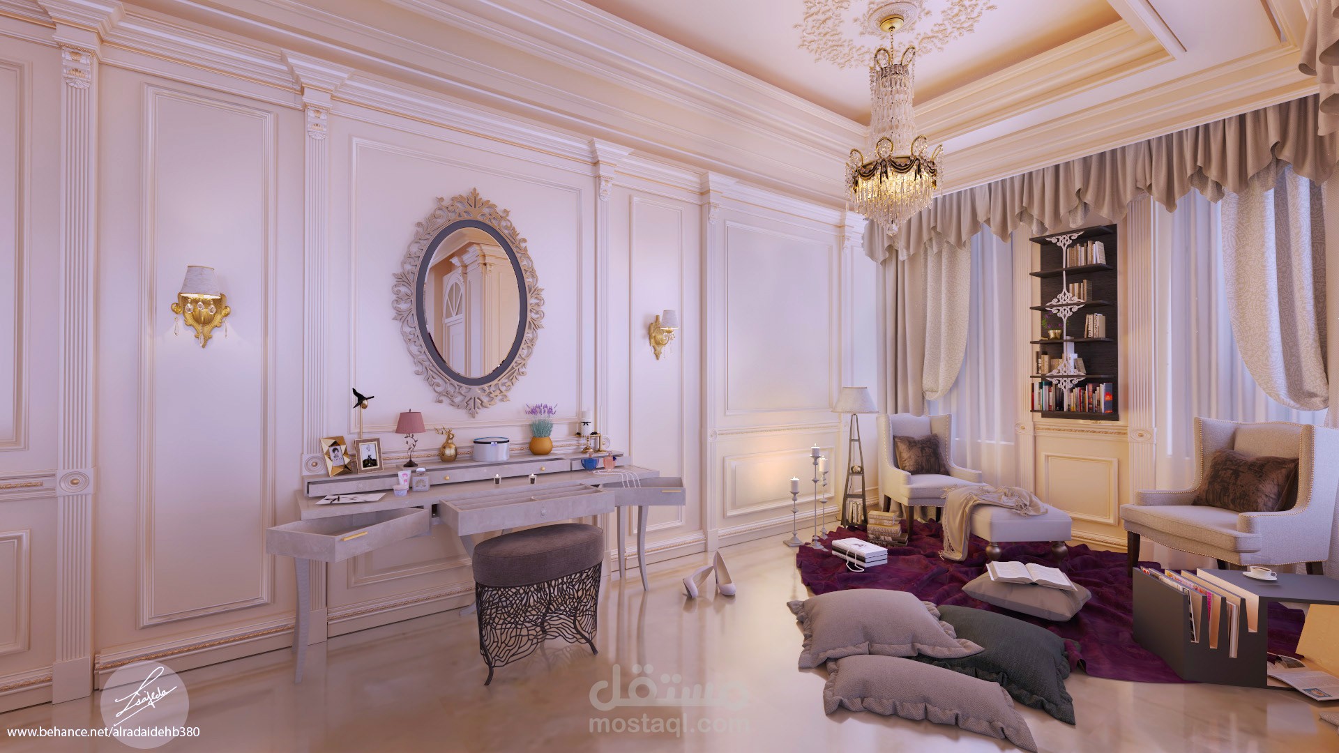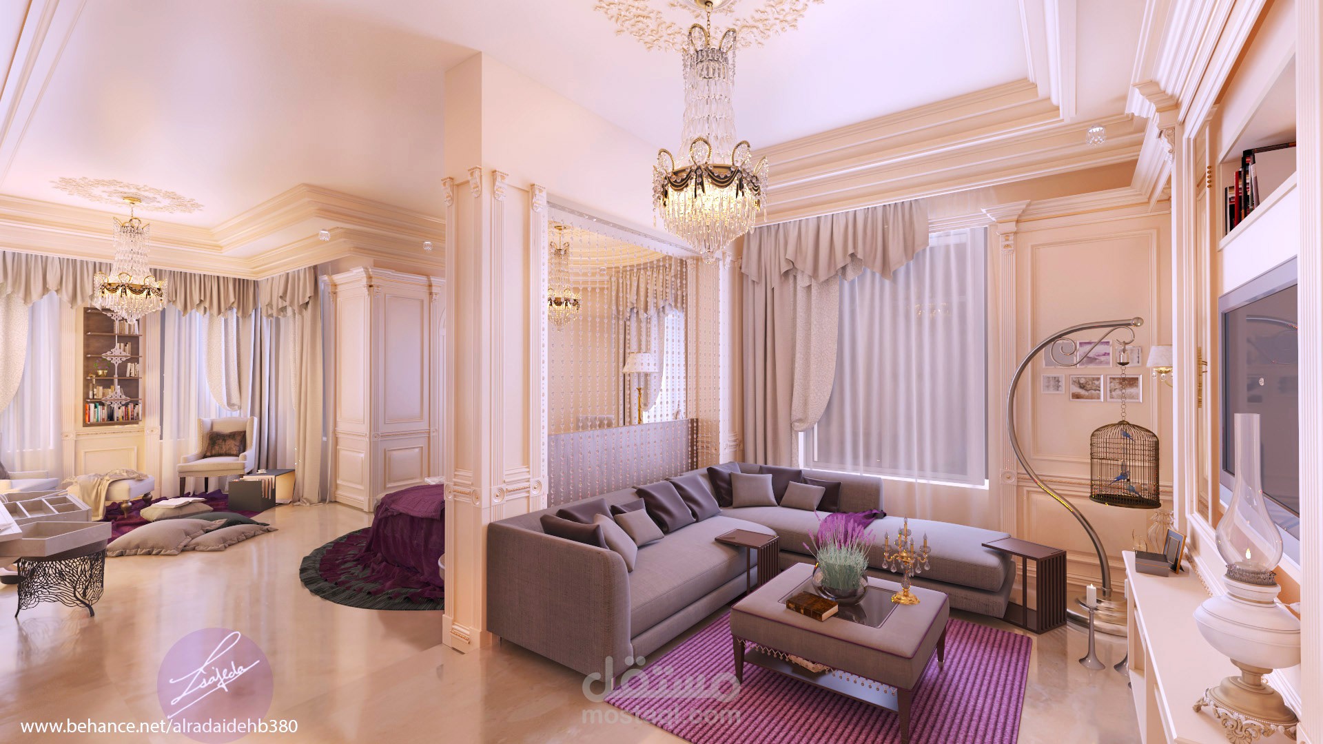 غرفة نوم ماستر مع جلسة تلفزيون يفصل بينهم بارتشن ستايل نيو كلاسيك
