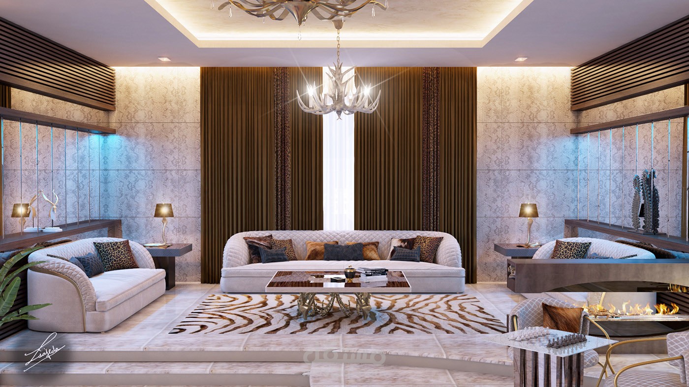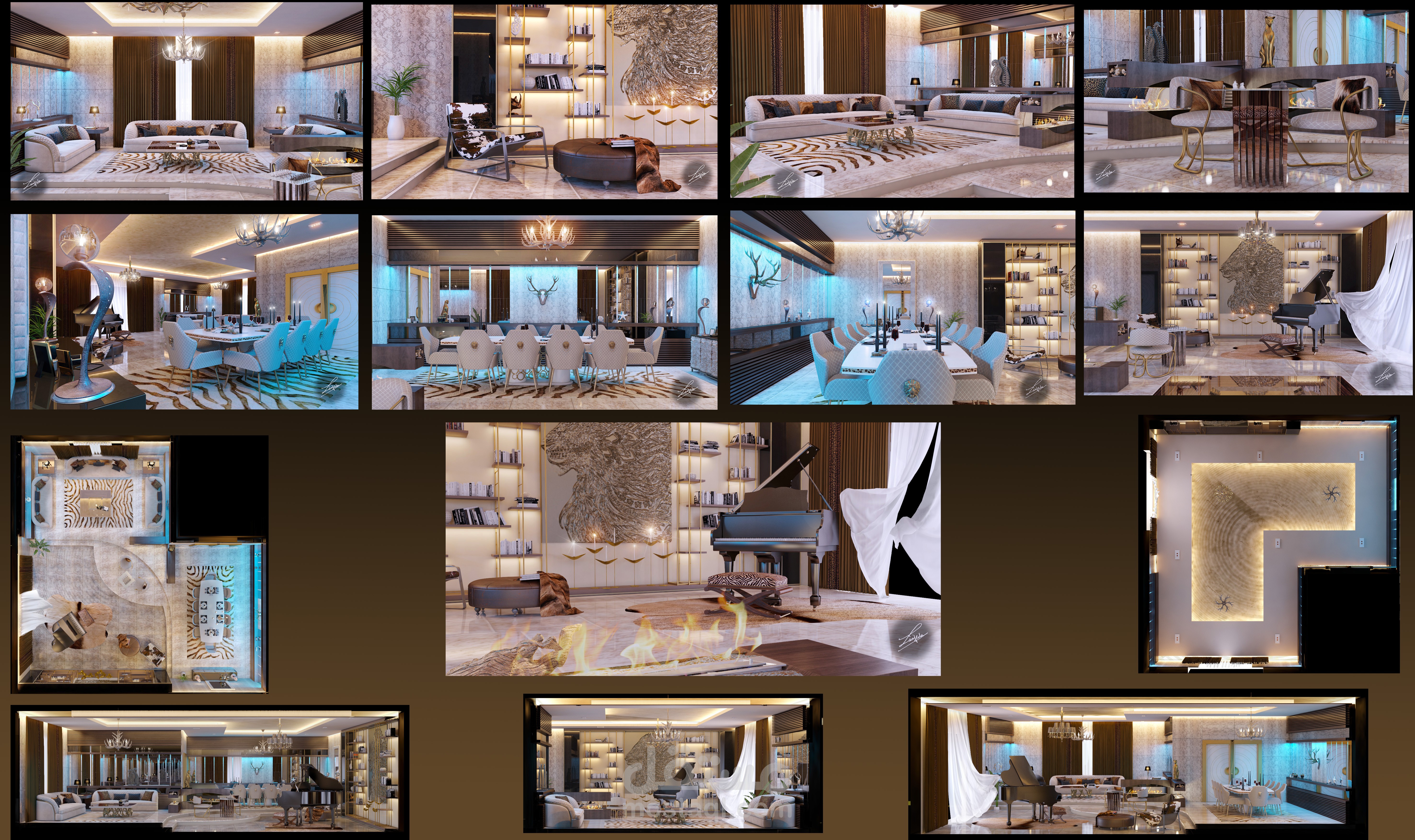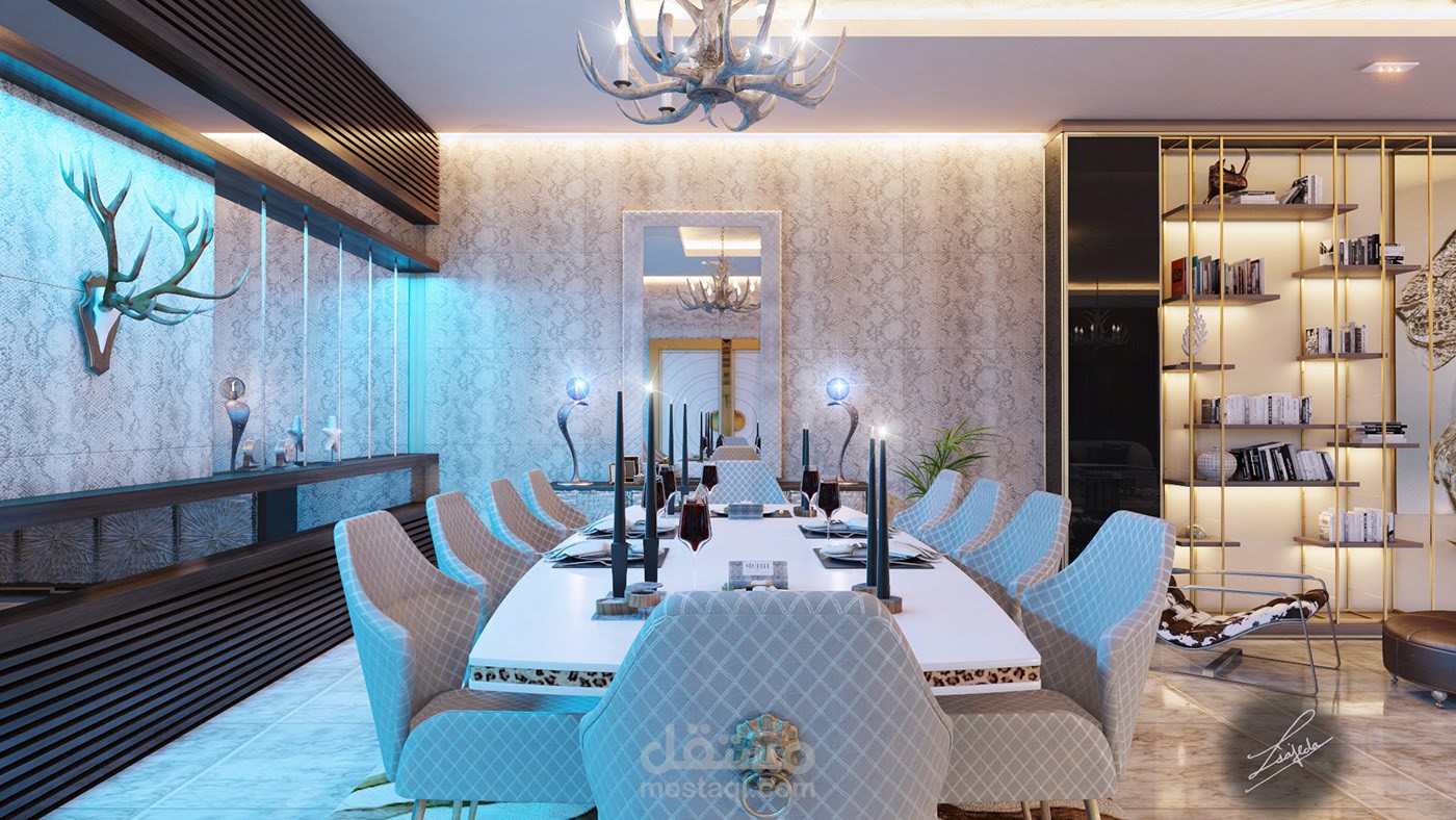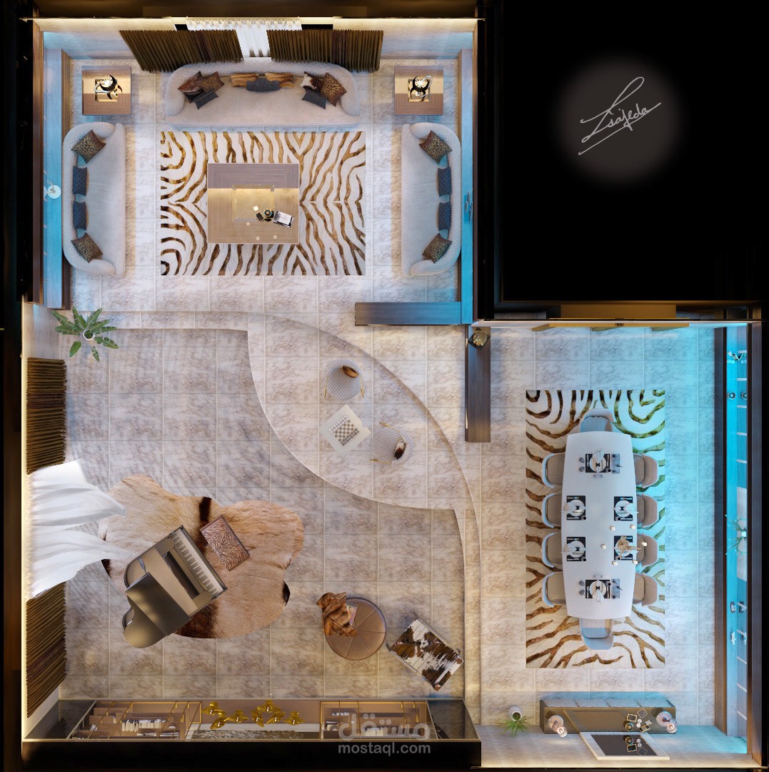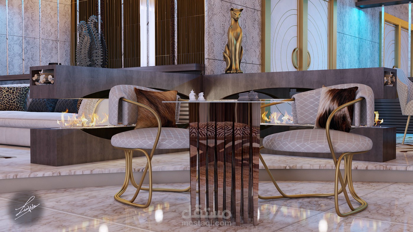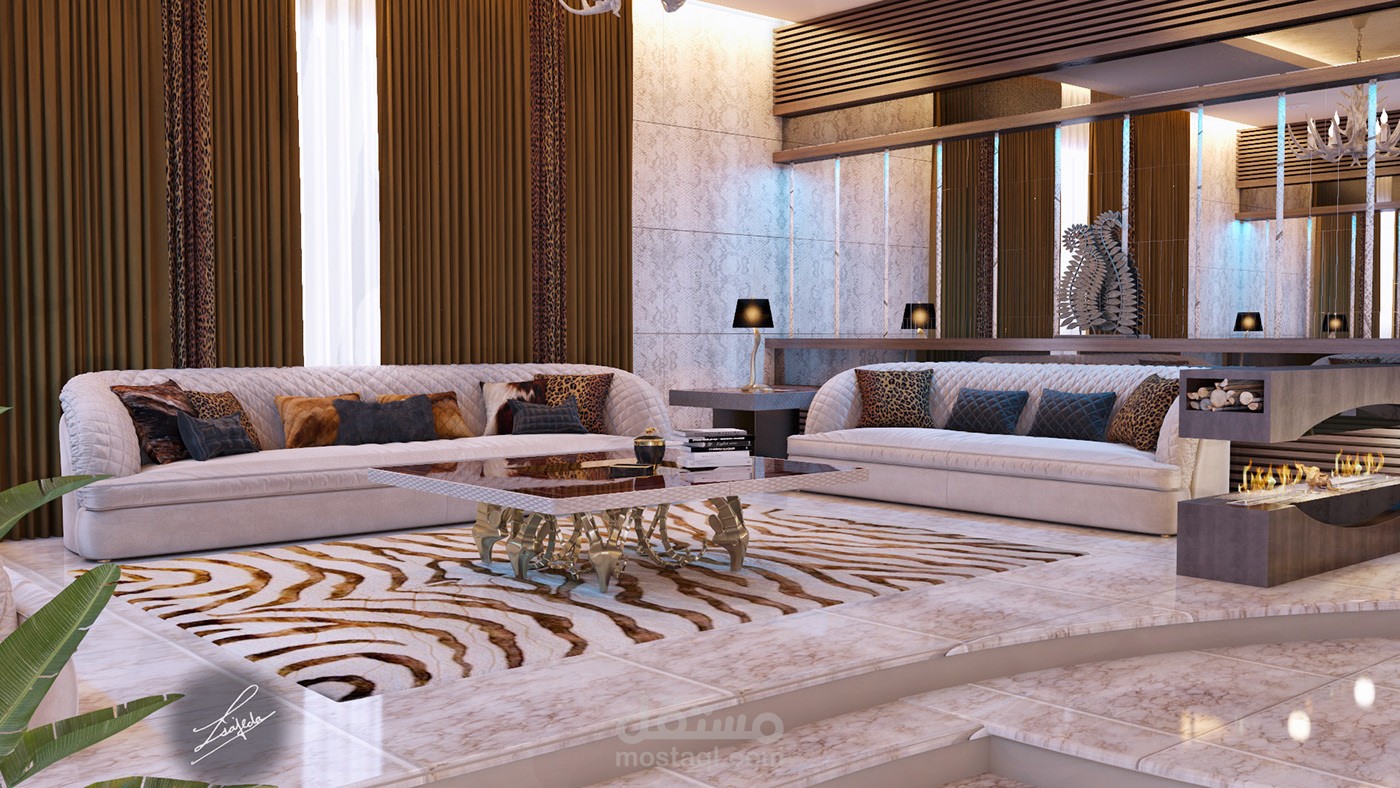 غرفة ضيوف وغرفة طعام ستايل مودرن والكونسبت مستوحى من حيوانات الغابه حيث تم استخدام جلود الحيوانات والوانها في القماش والستائر والسجاد و ورق الجدران والارضيات