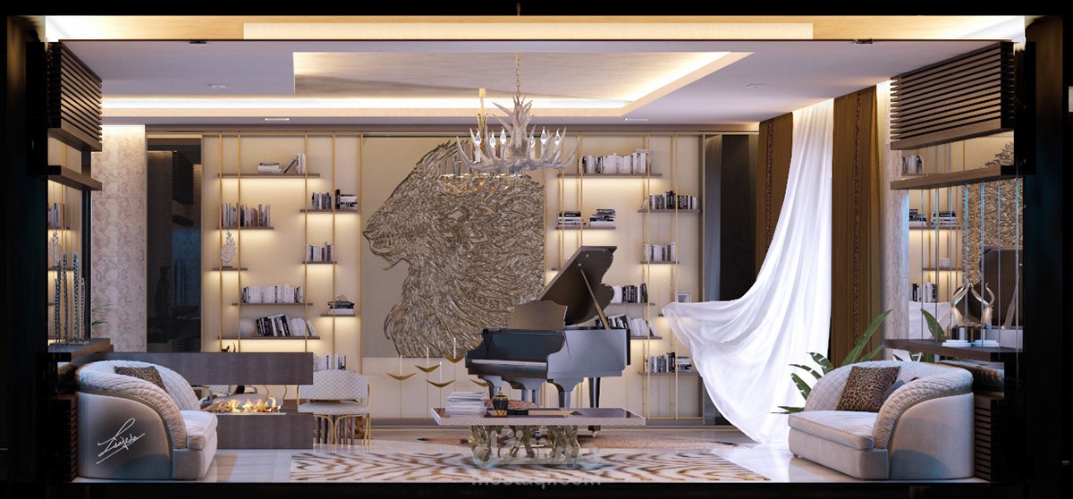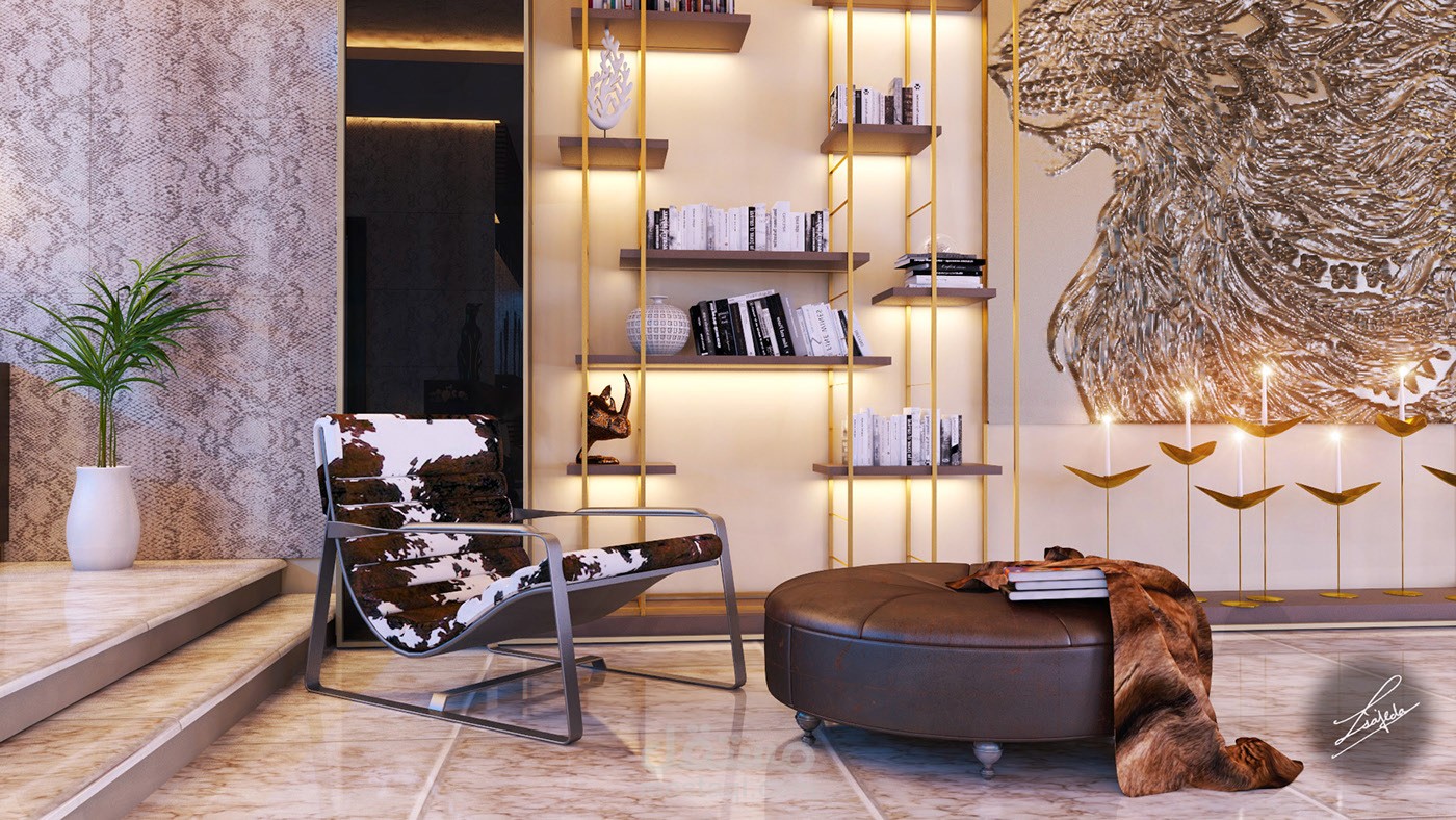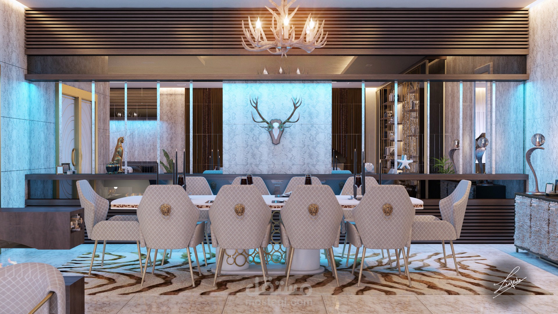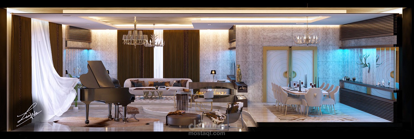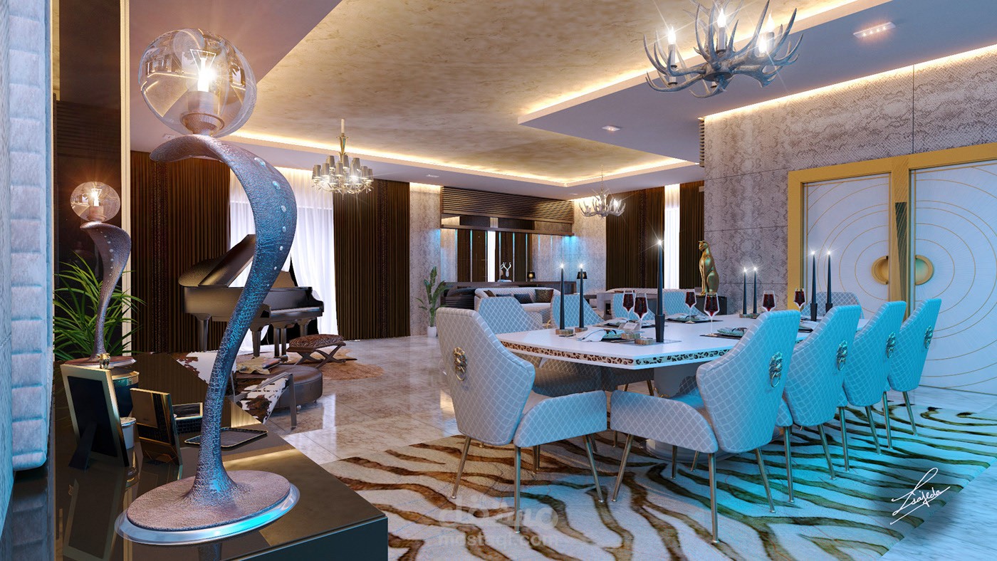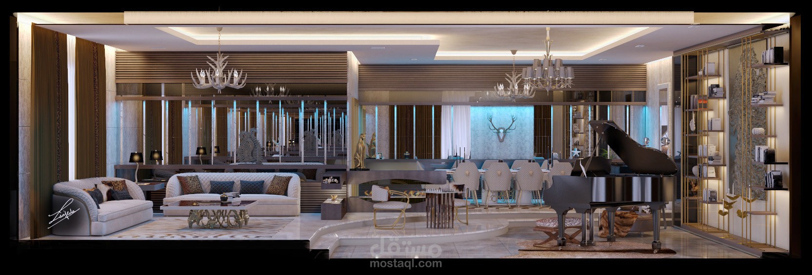 غرفة ضيوف وغرفة طعام ستايل مودرن والكونسبت مستوحى من حيوانات الغابه حيث تم استخدام جلود الحيوانات والوانها في القماش والستائر والسجاد و ورق الجدران والارضيات