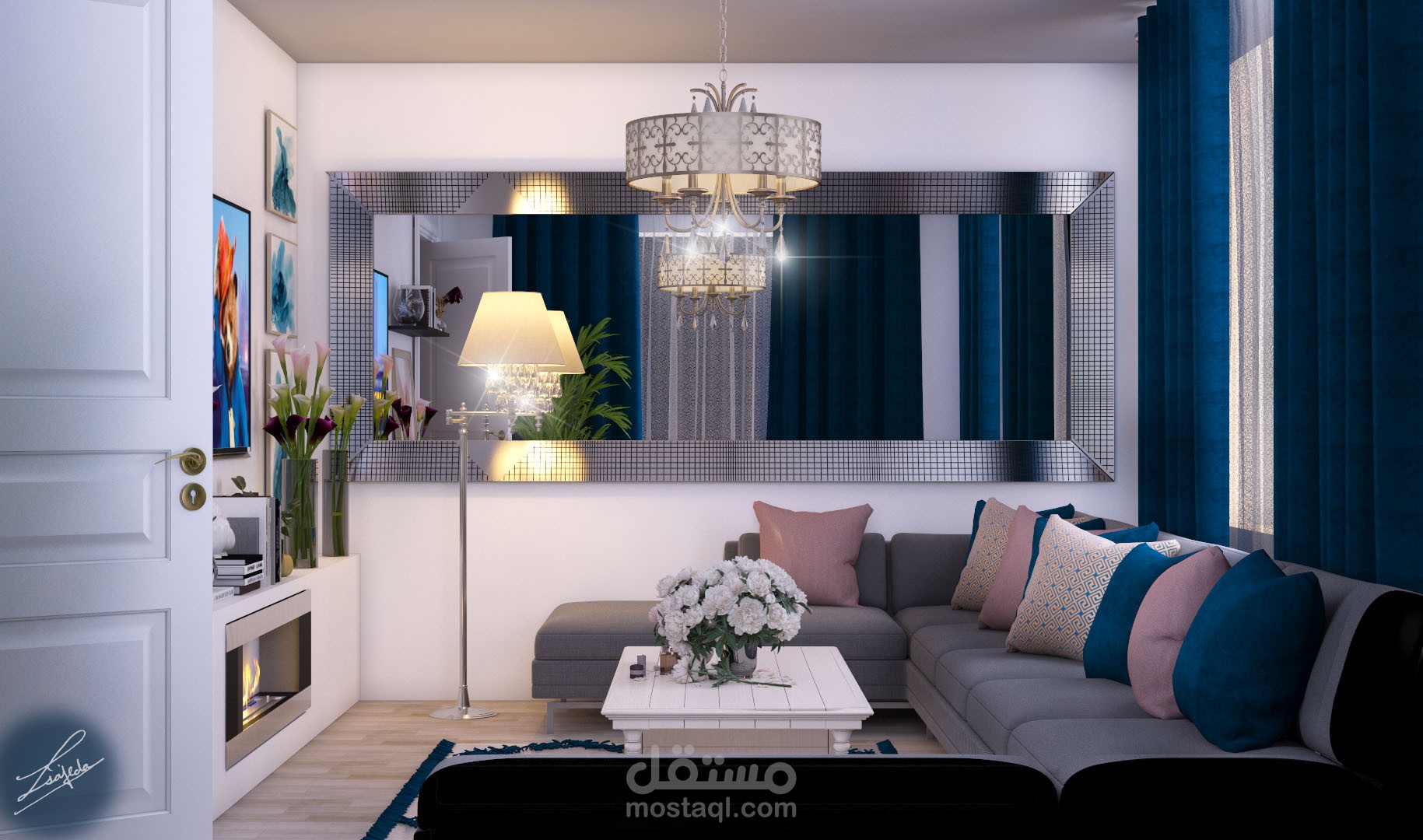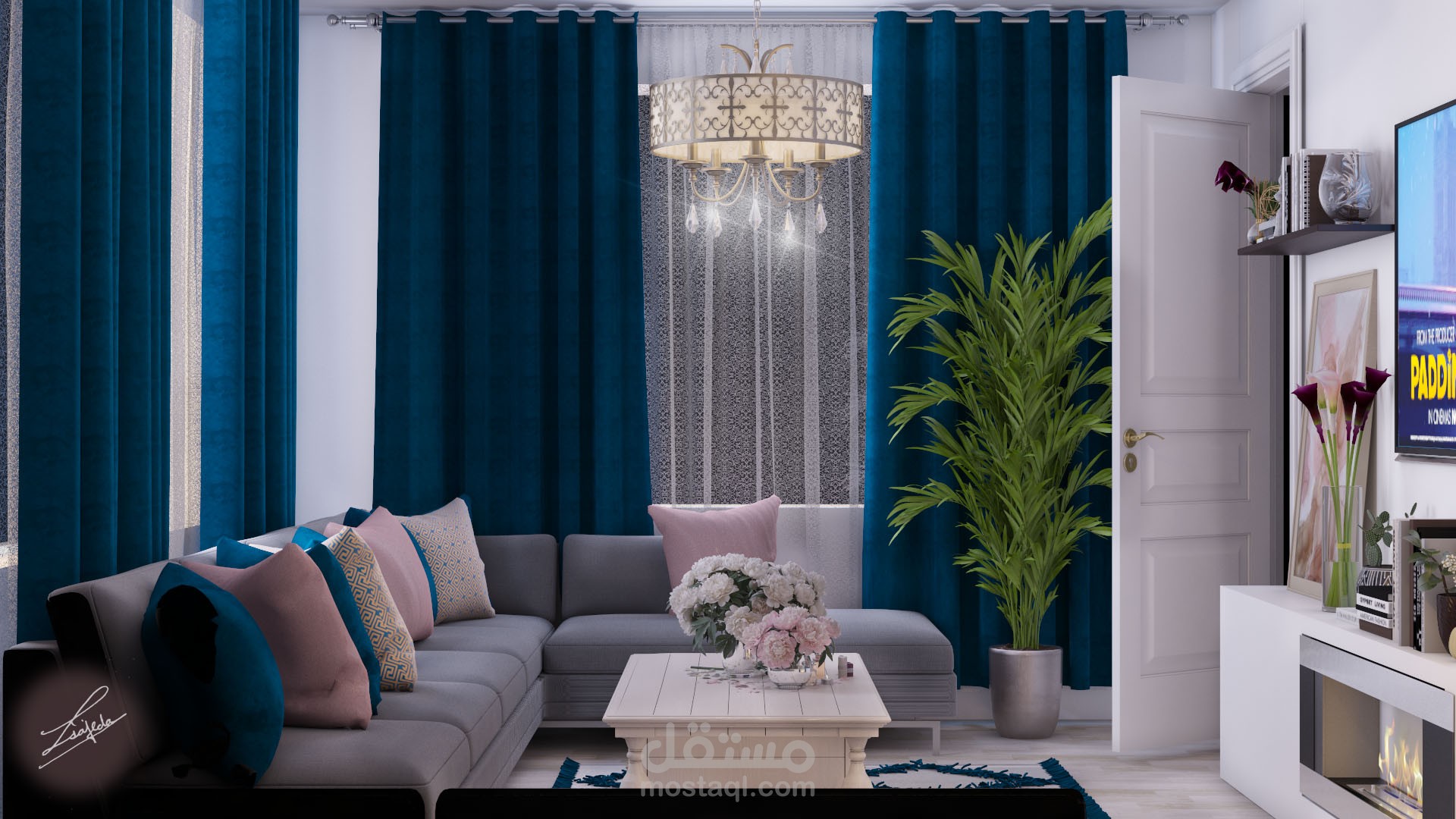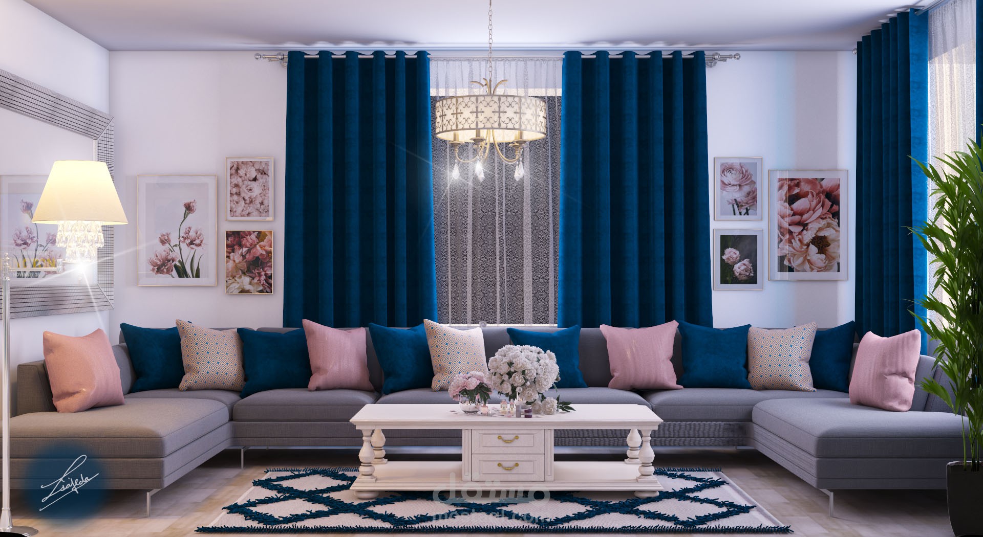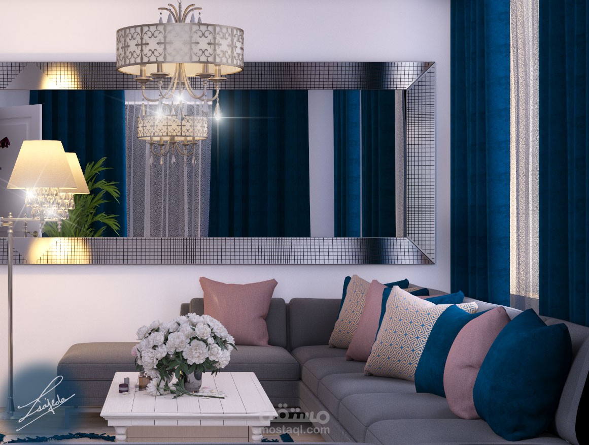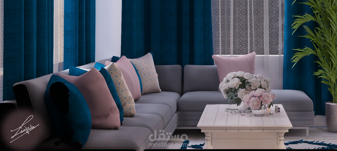 غرفة معيشه ستايل مودرن حيث تم حصر الالوان بين التركواز والزهري والرمادي والبيج