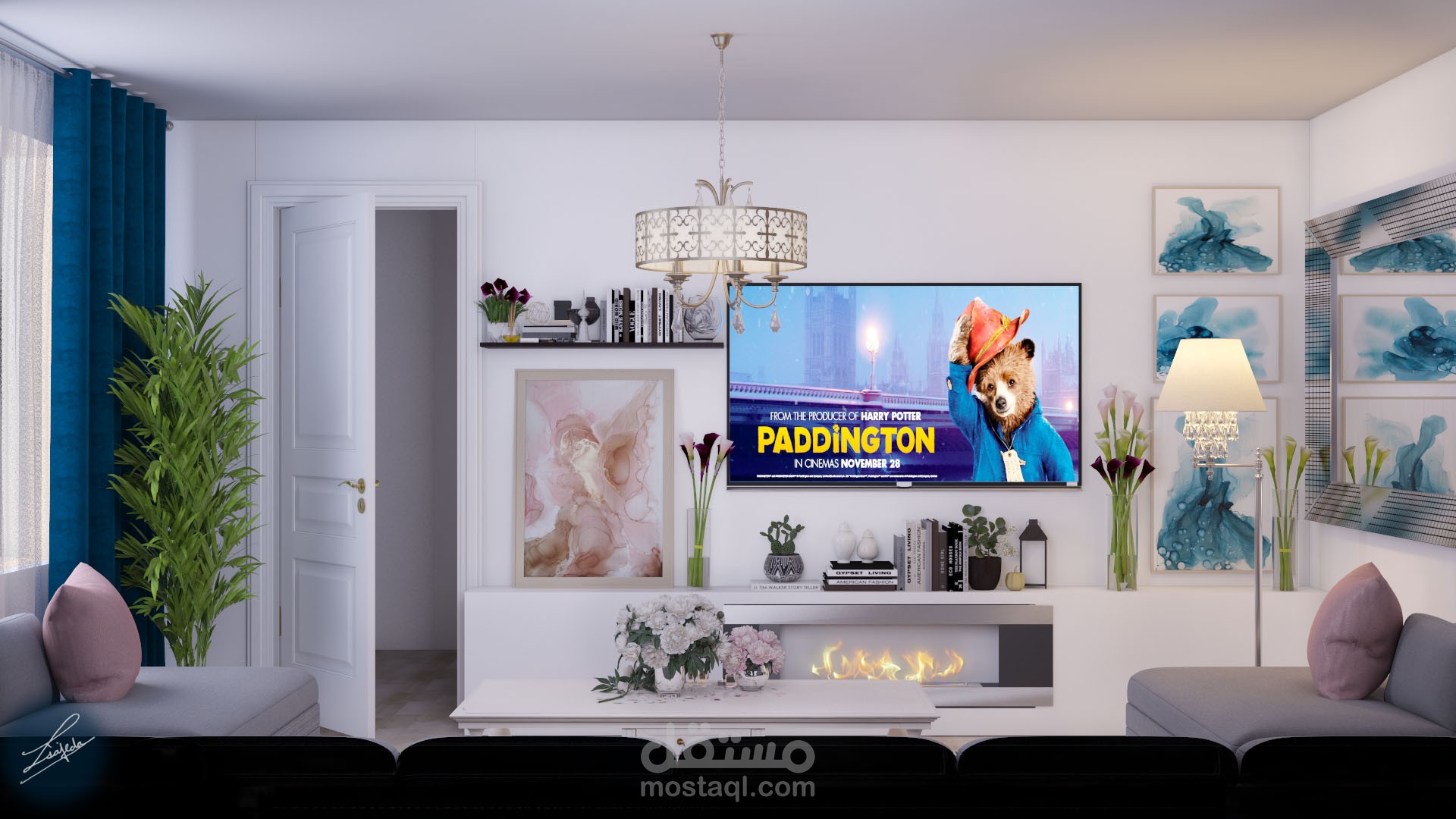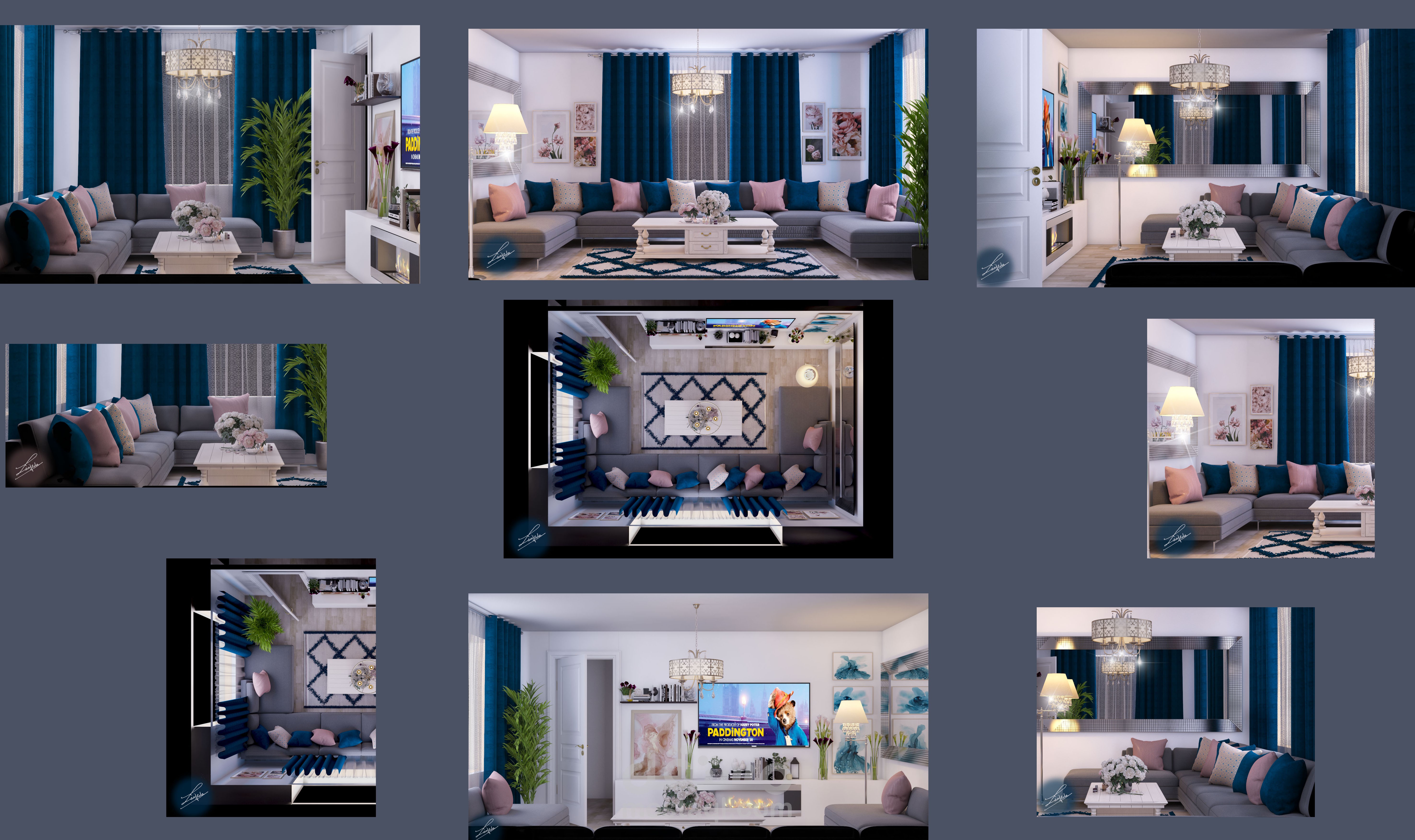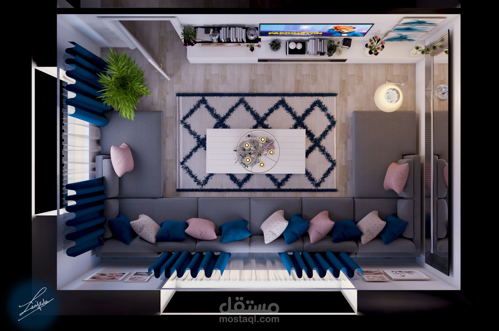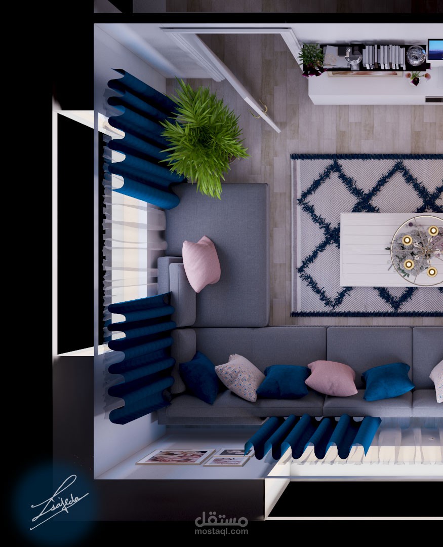 غرفة معيشه ستايل مودرن حيث تم حصر الالوان بين التركواز والزهري والرمادي والبيج