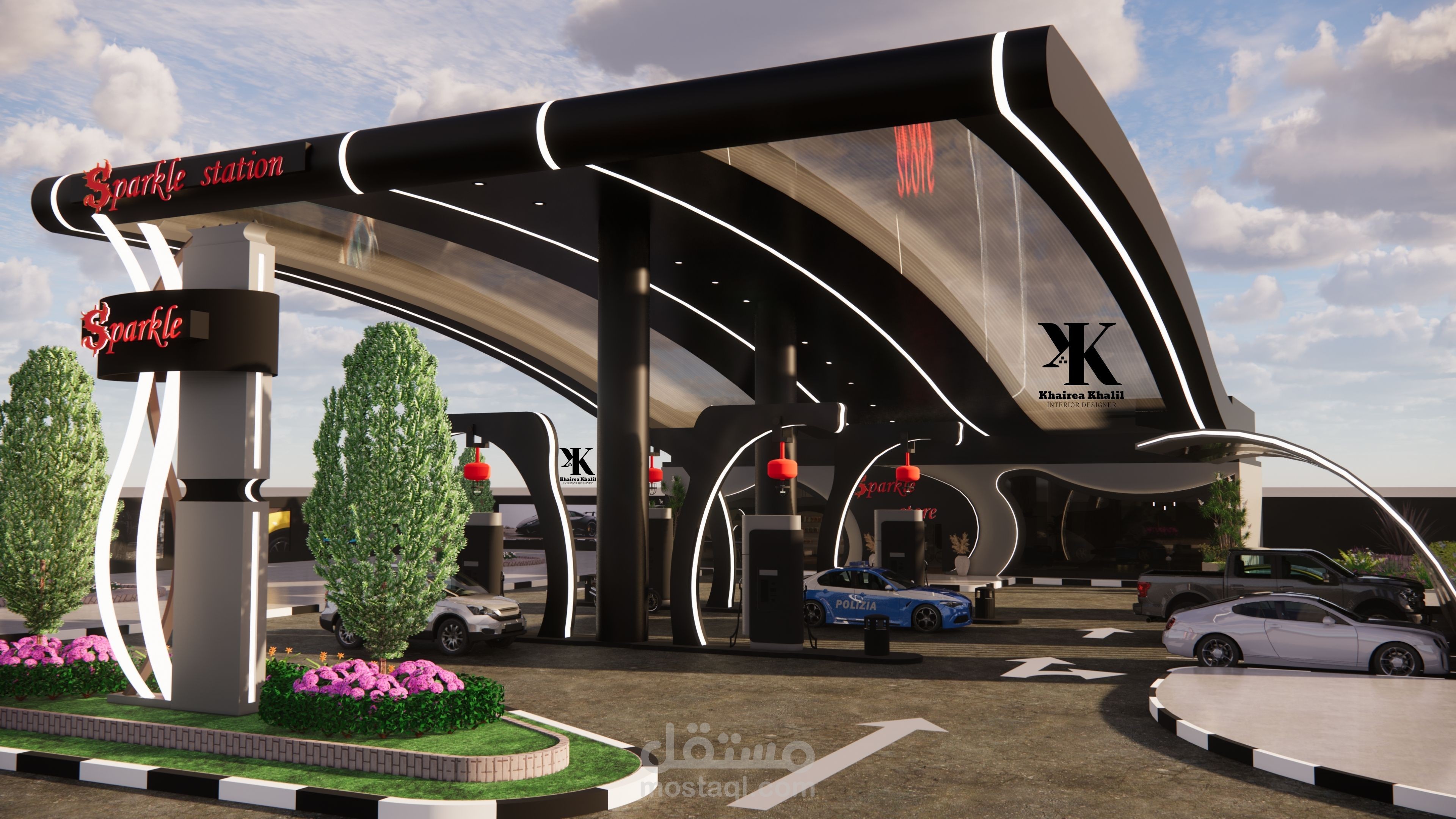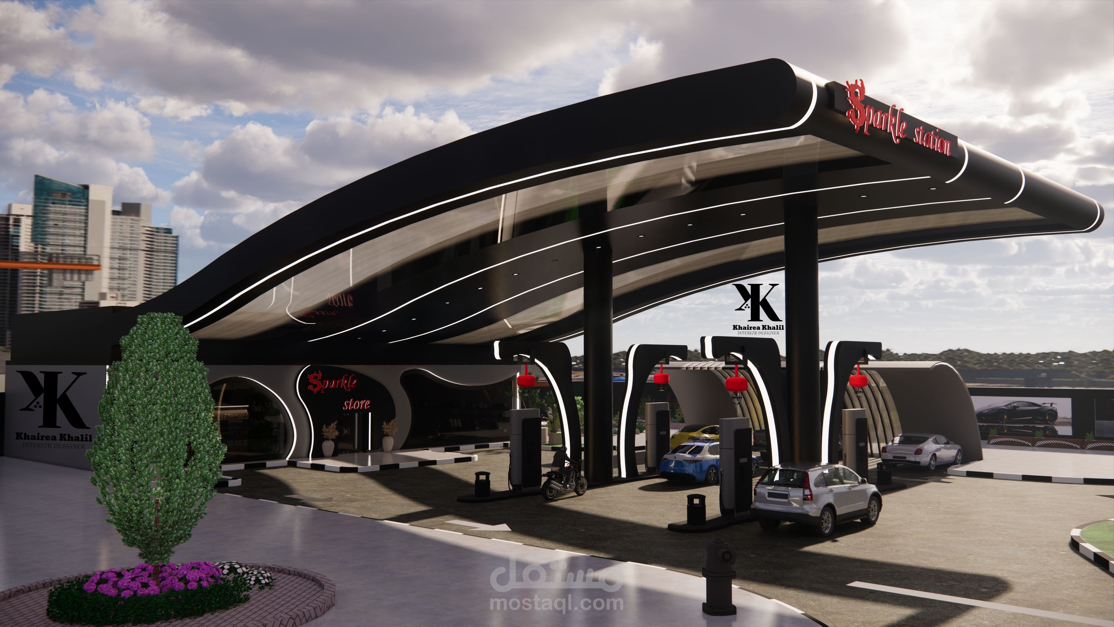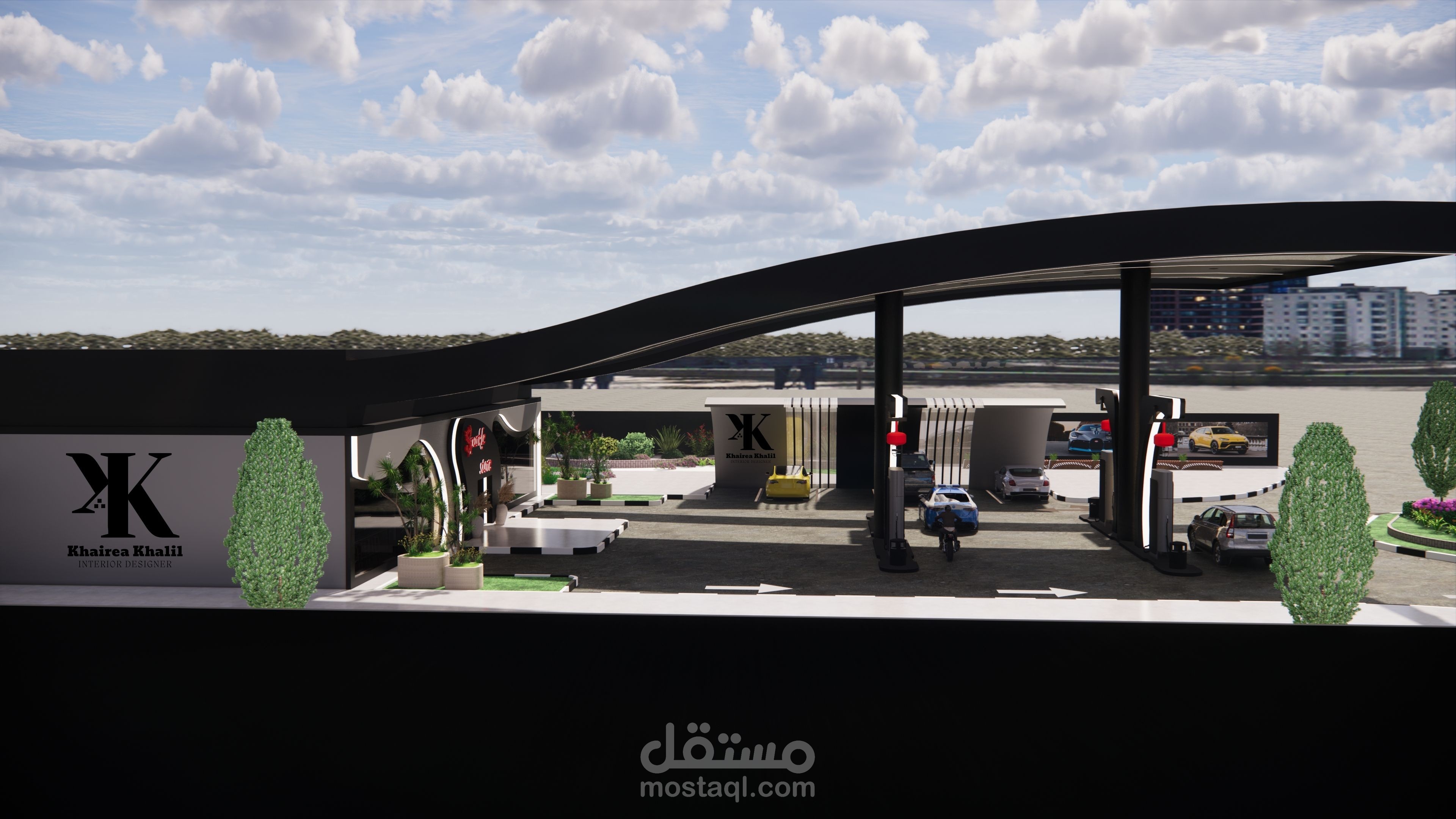 تصميمي لمحطة بنزين باستخدام اللون الأسود والرمادي ومراعاة كل الأسس اللازمة لتصميم المحطة